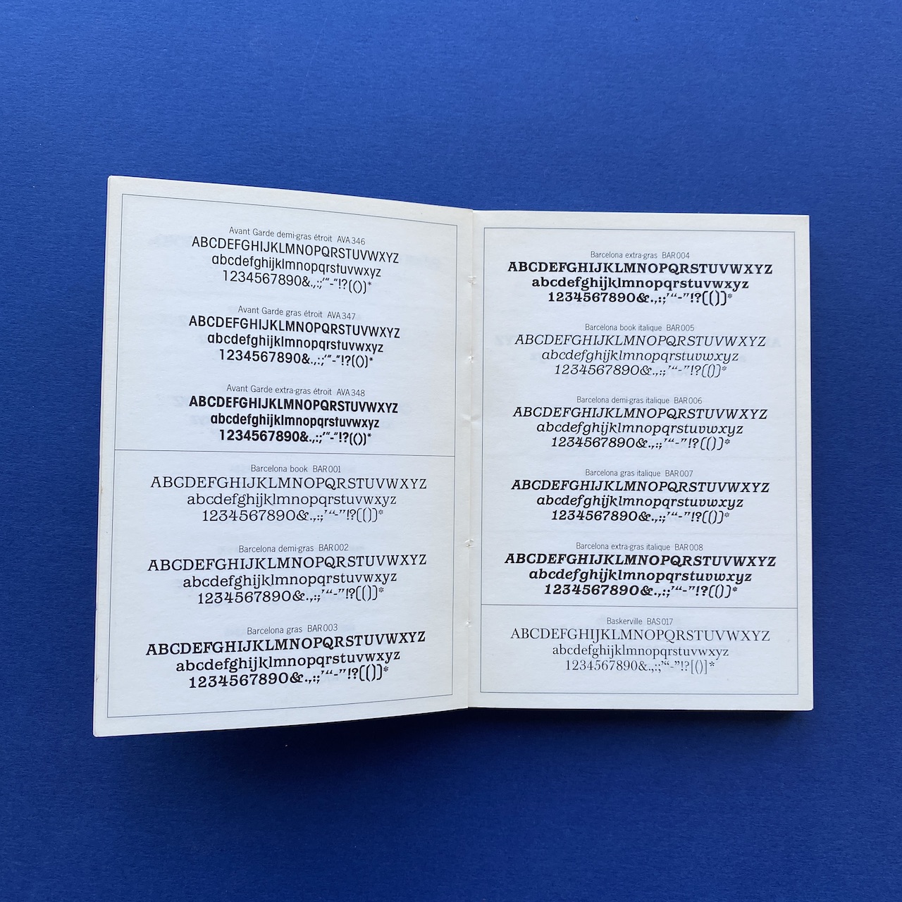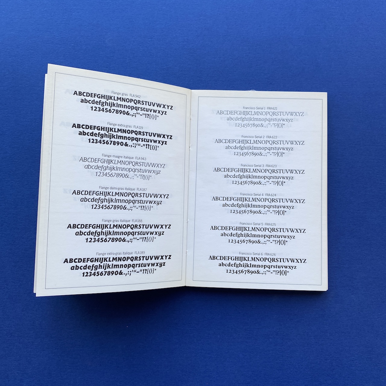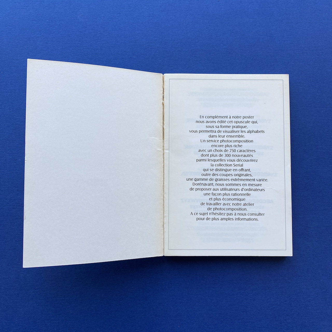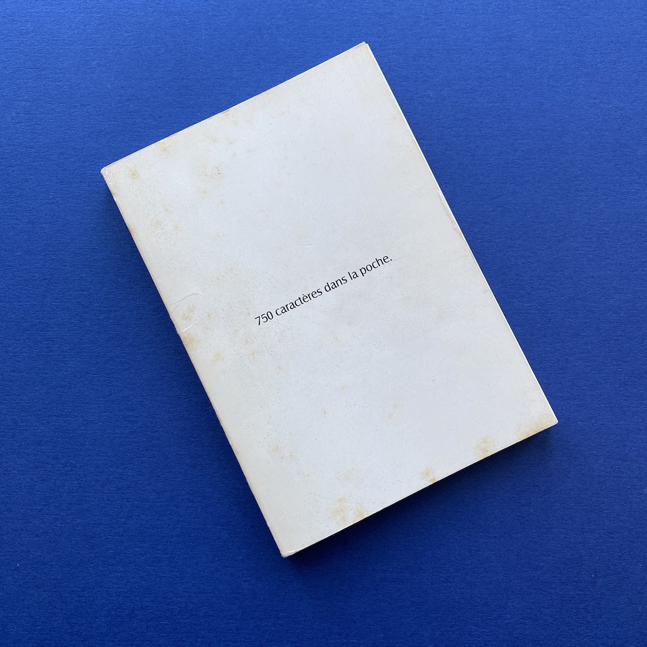 750 caractères dans la poche, Face, Paris, 10,5 x 15 cm. Little book presenting 750 typefaces. Originally came with a poster. Binding is a bit fragile and cover shows some humidity spots.