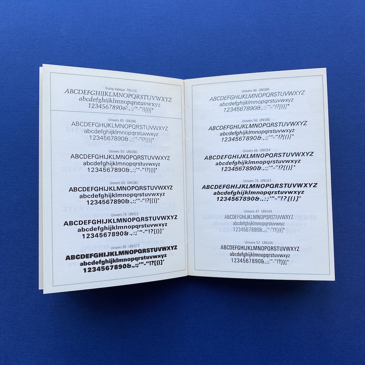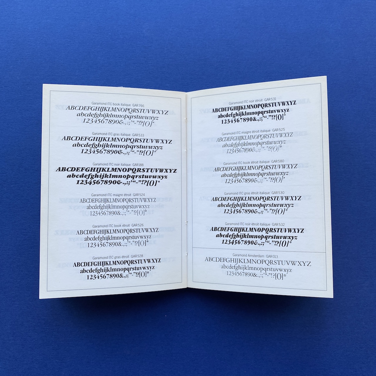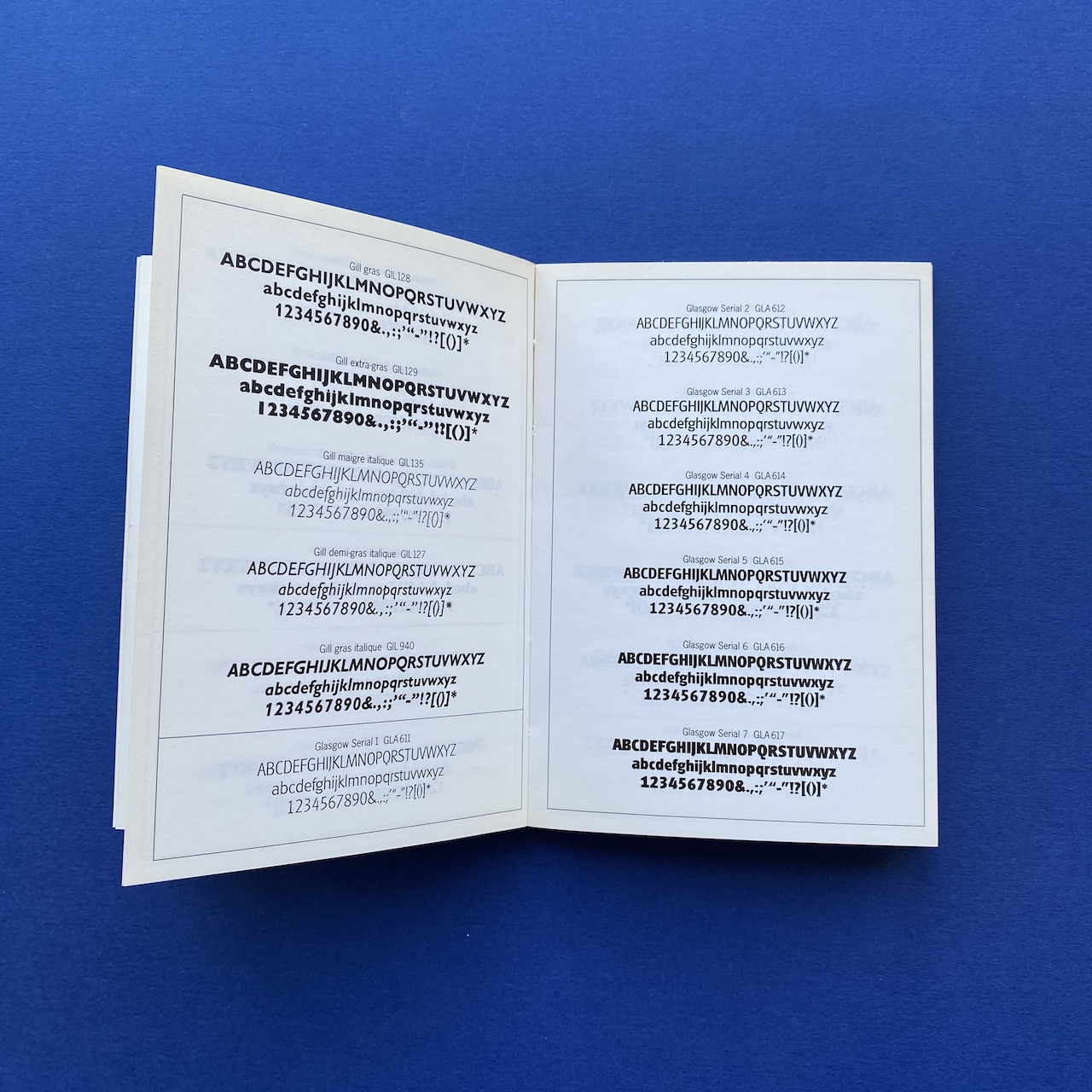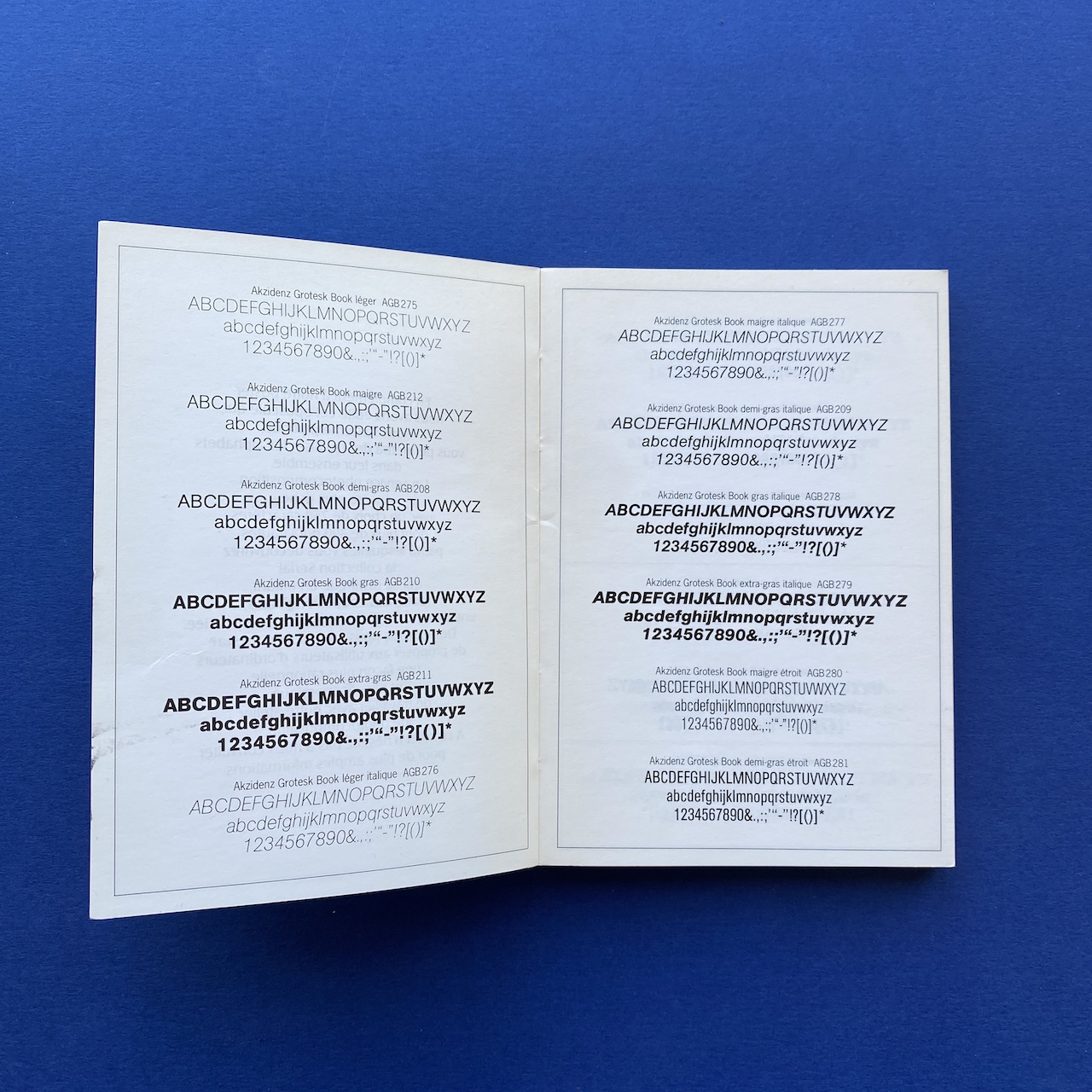 750 caractères dans la poche, Face, Paris, 10,5 x 15 cm. Little book presenting 750 typefaces. Originally came with a poster. Binding is a bit fragile and cover shows some humidity spots.