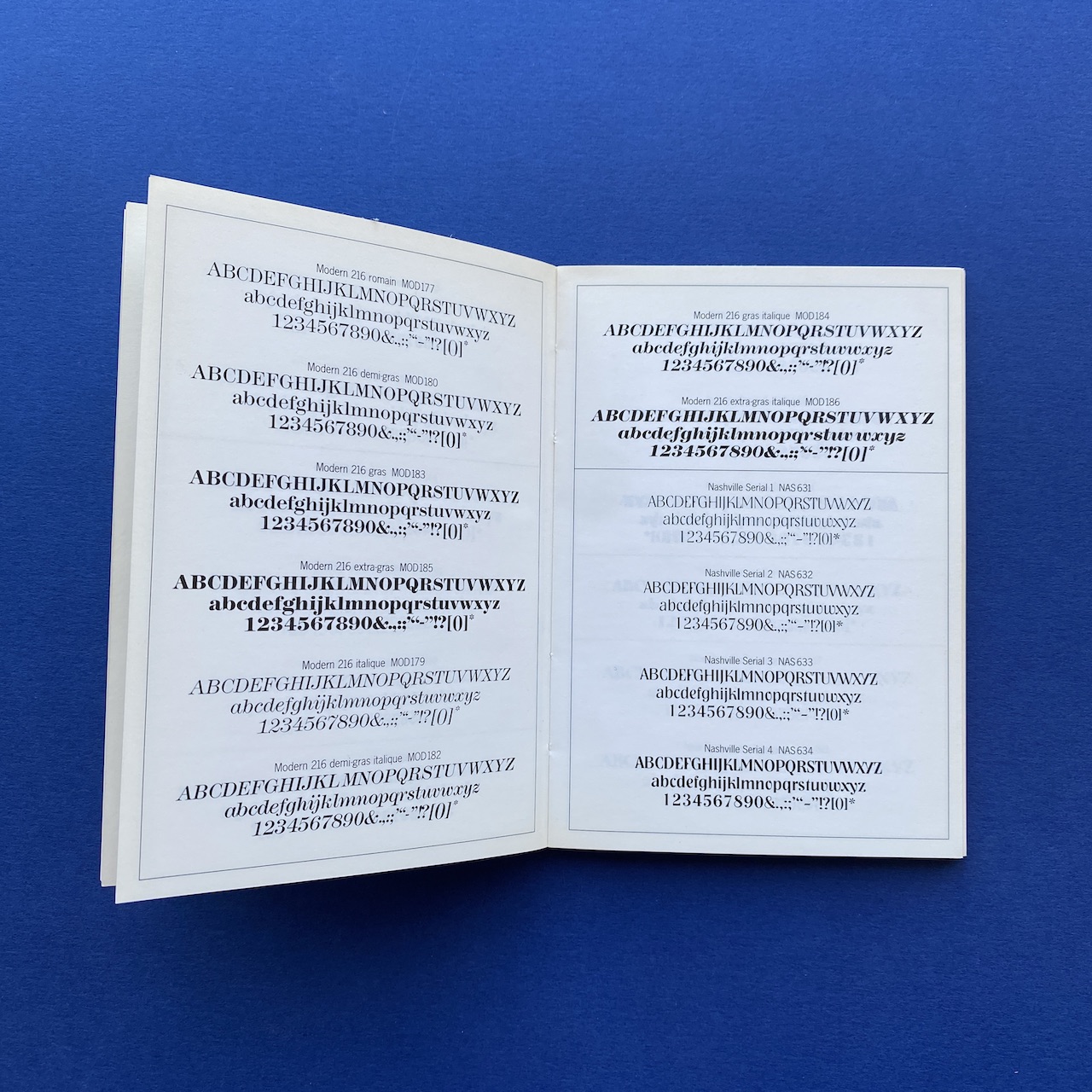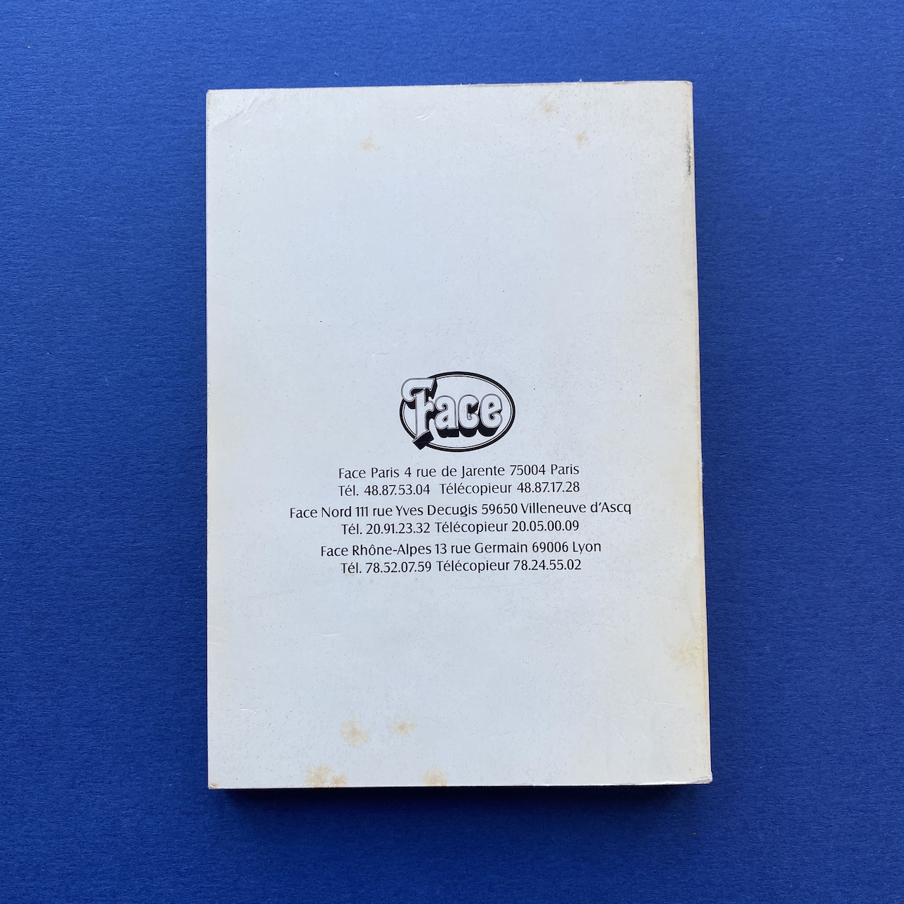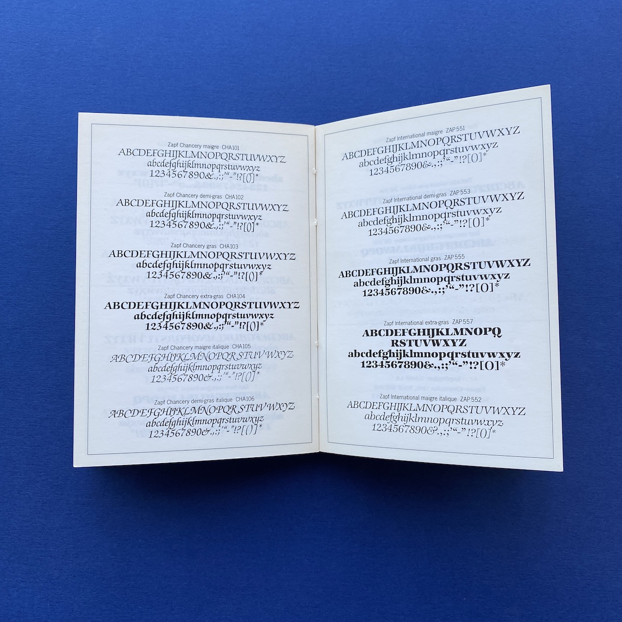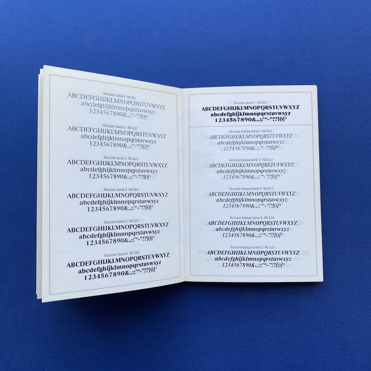 750 caractères dans la poche, Face, Paris, 10,5 x 15 cm. Little book presenting 750 typefaces. Originally came with a poster. Binding is a bit fragile and cover shows some humidity spots.