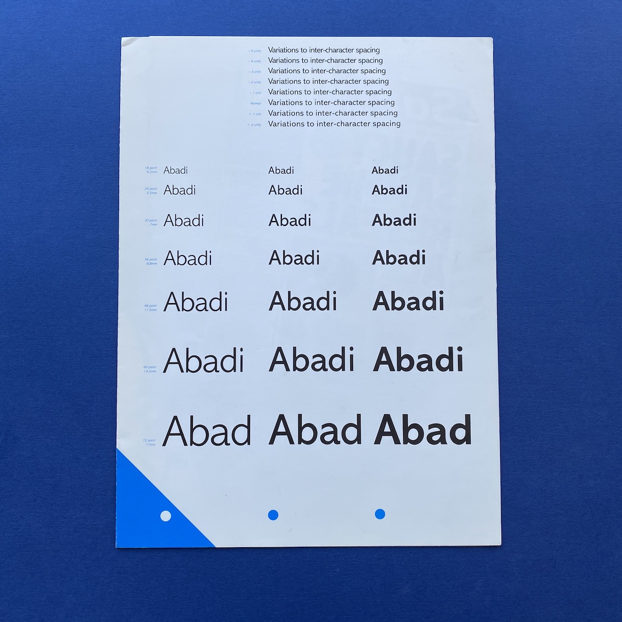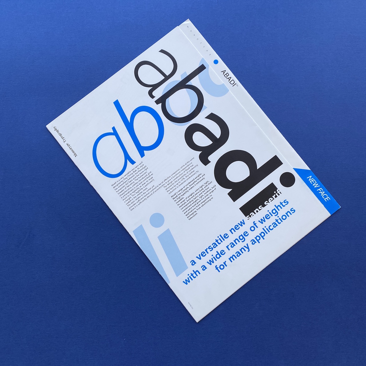 Abadi, Monotype Typography, 1988, The Monotype Corporation, 22 x 30 cm, 4 pp. “Abadi is a very versatile new sans serif designed by Ong Chong Wah. Its style lies somewhere between the Monotype humanistic Gill Sans and the more rigid lineales of Helvetica”. Very good condition.