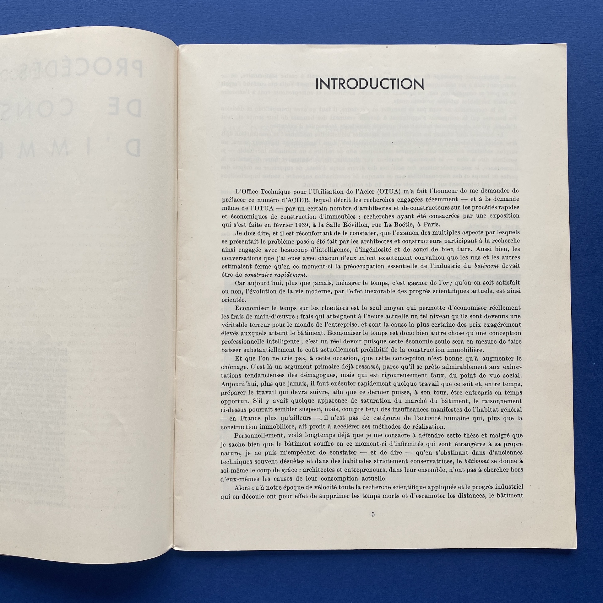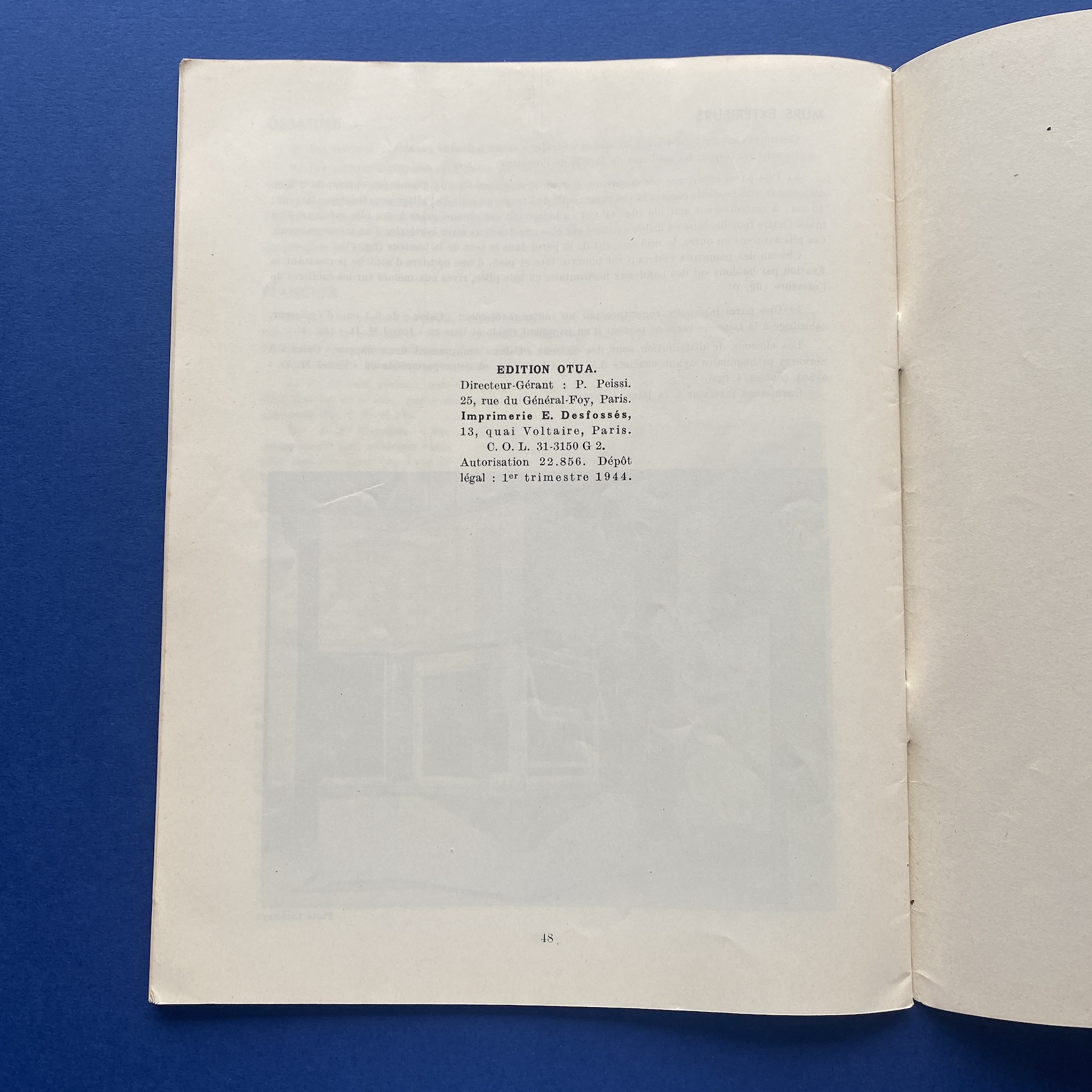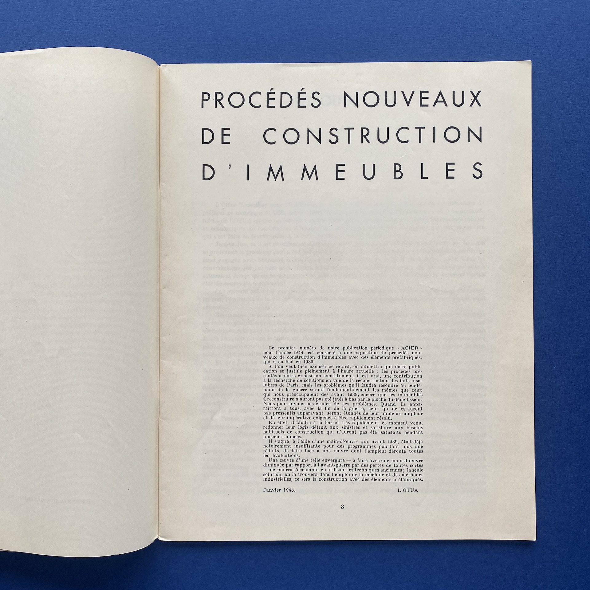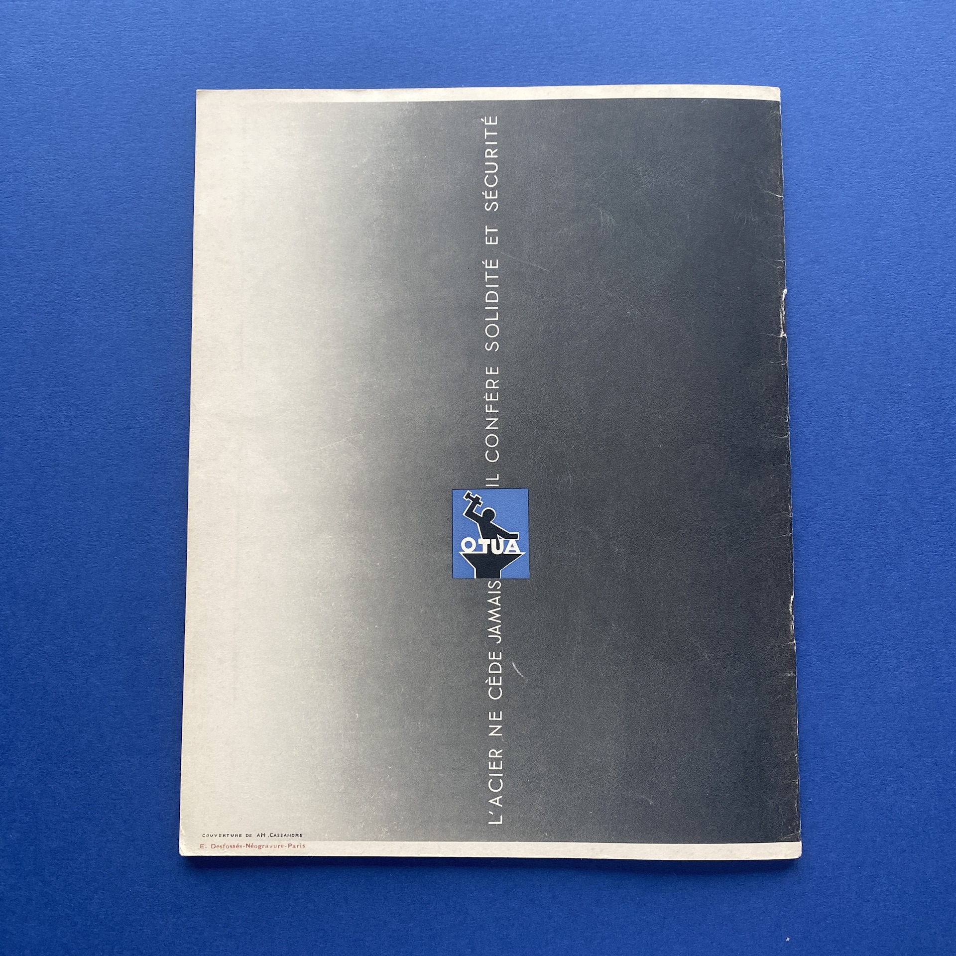 Acier n° 1, Procédés nouveaux de construction d’immeubles, Paris, OTUA, 1944, 21 x 27 cm, 48 pp. Logo by Francis Bernard, cover by Cassandre. Copy in good condition.