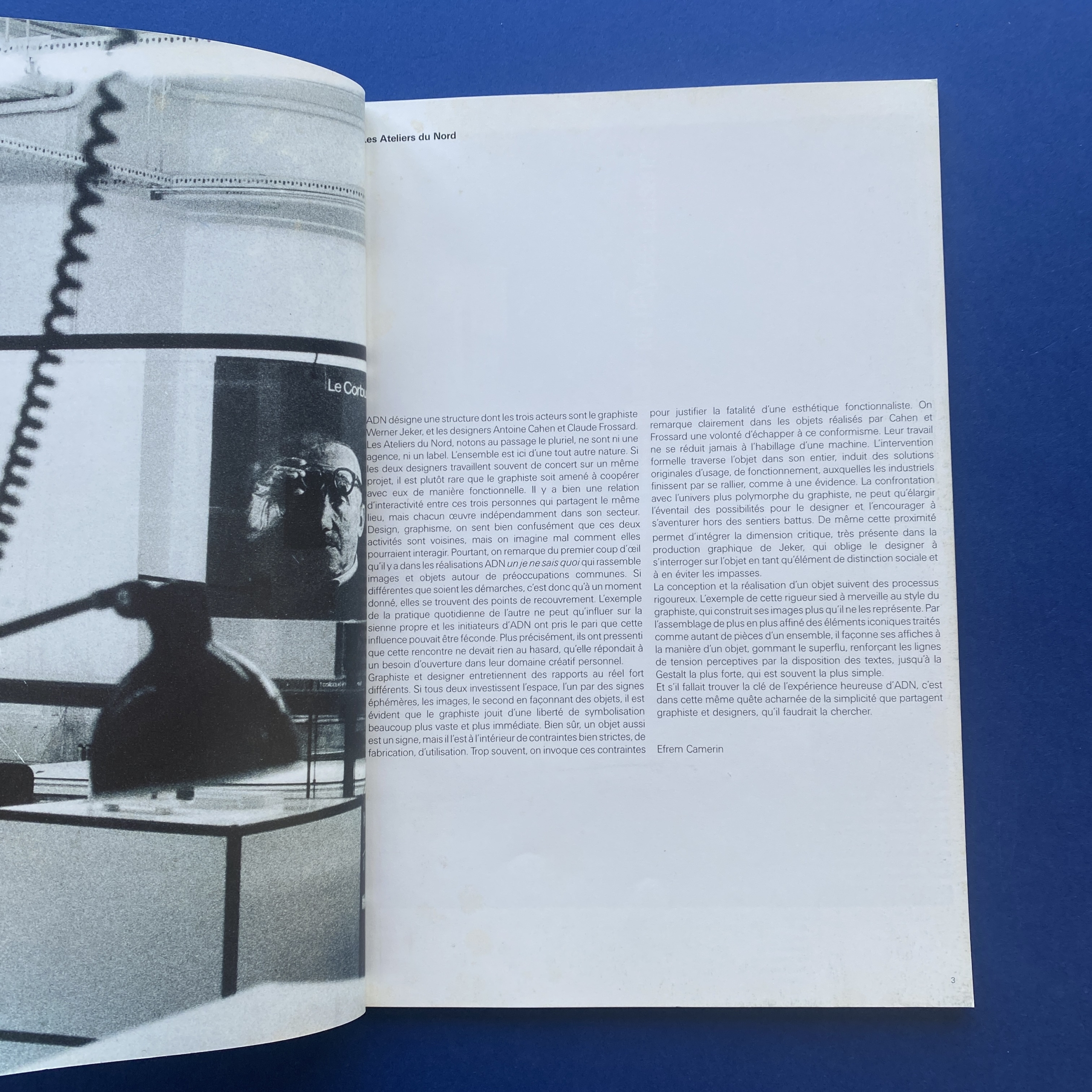 ADN, Design à la maison du livre, de l’image et du son, Villeurbanne Genève, 1990, 22 x 33 cm, 36 pp. Curated by Ruedi Baur. Good condition, minor traces of humidity.