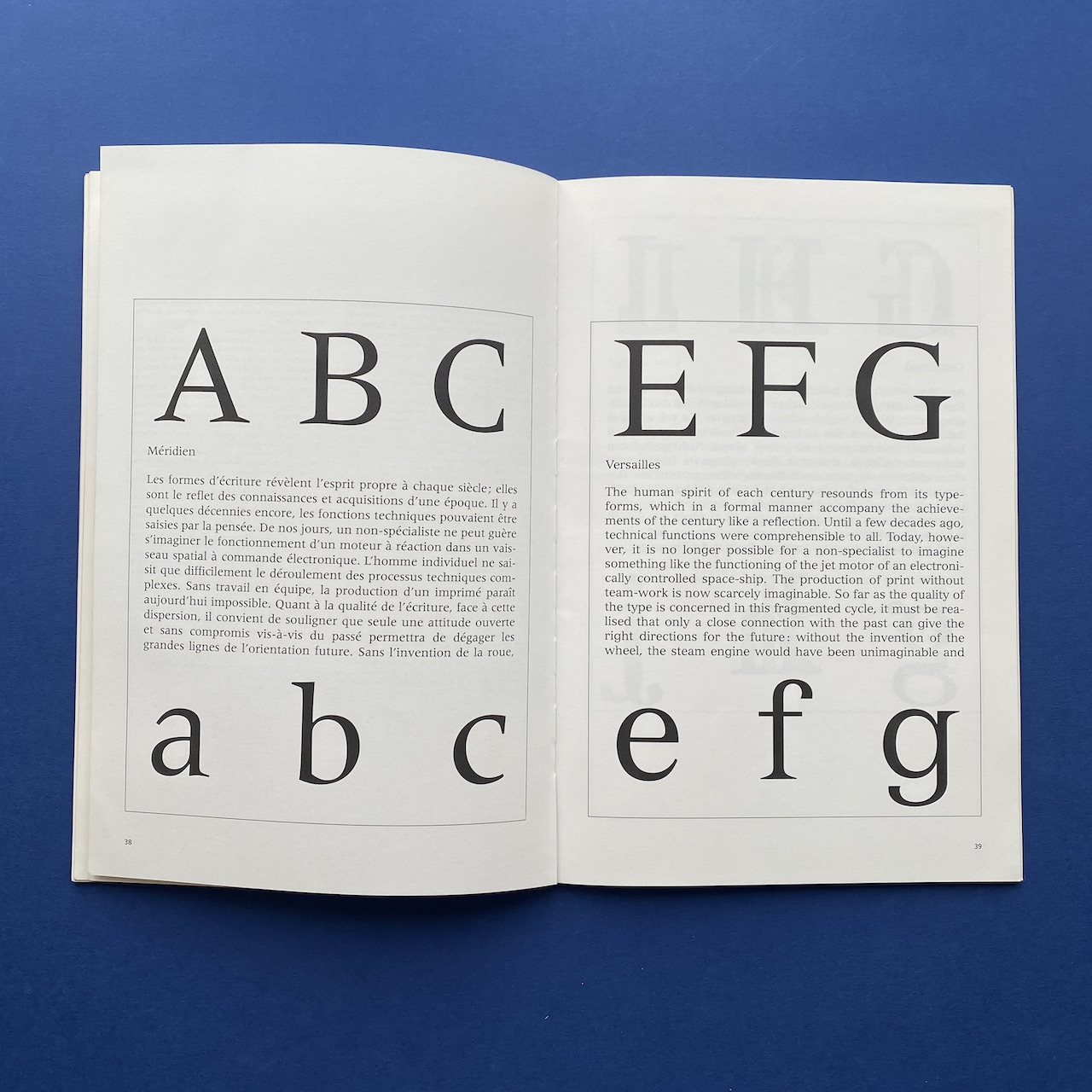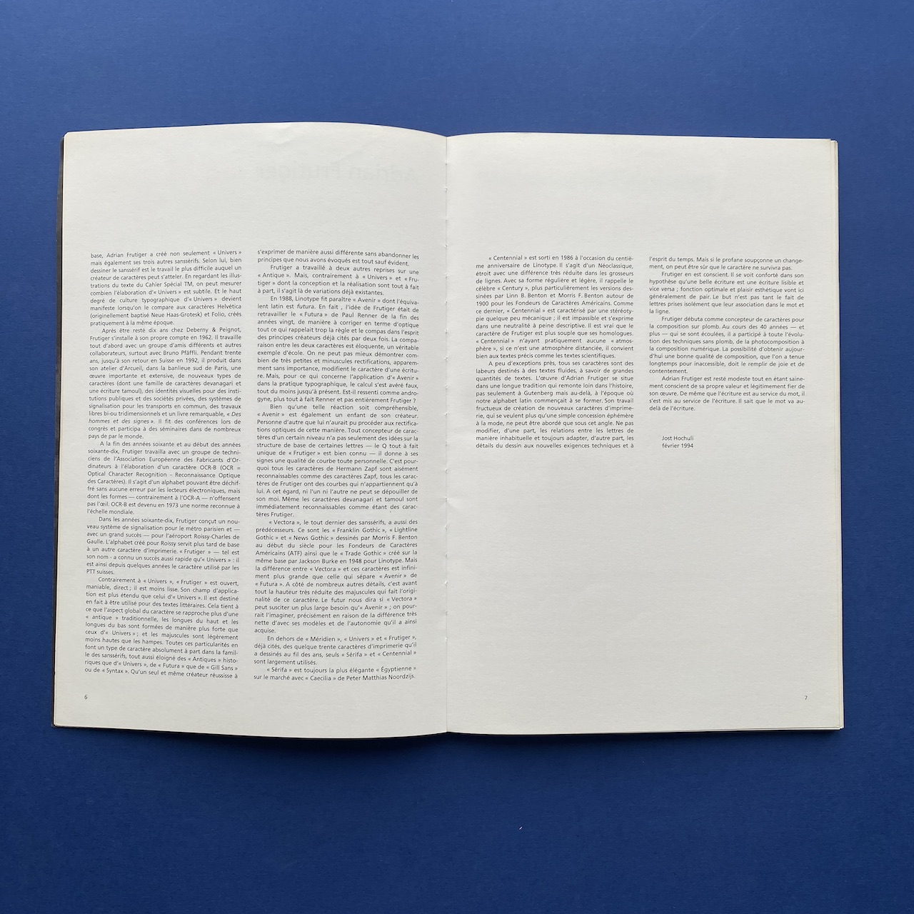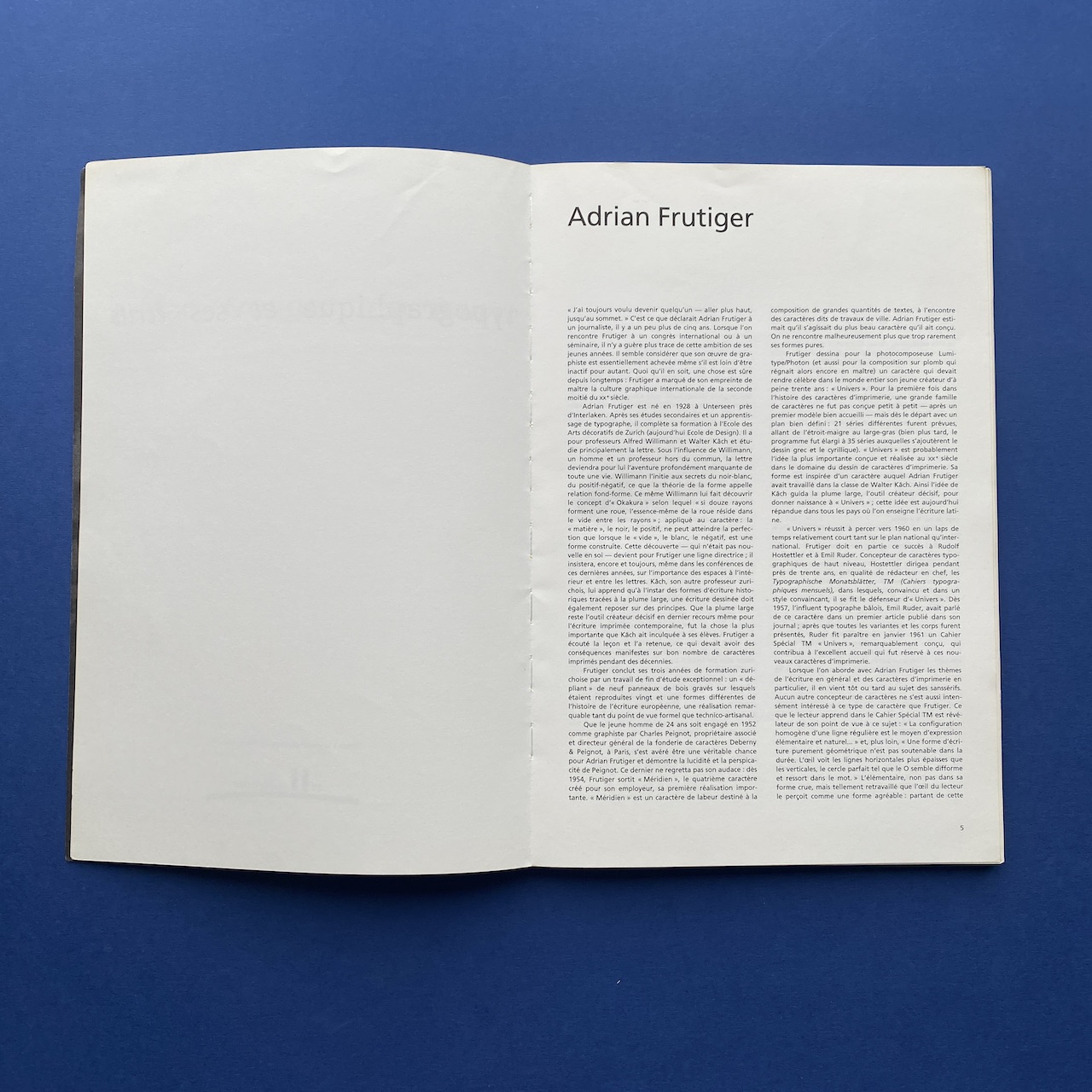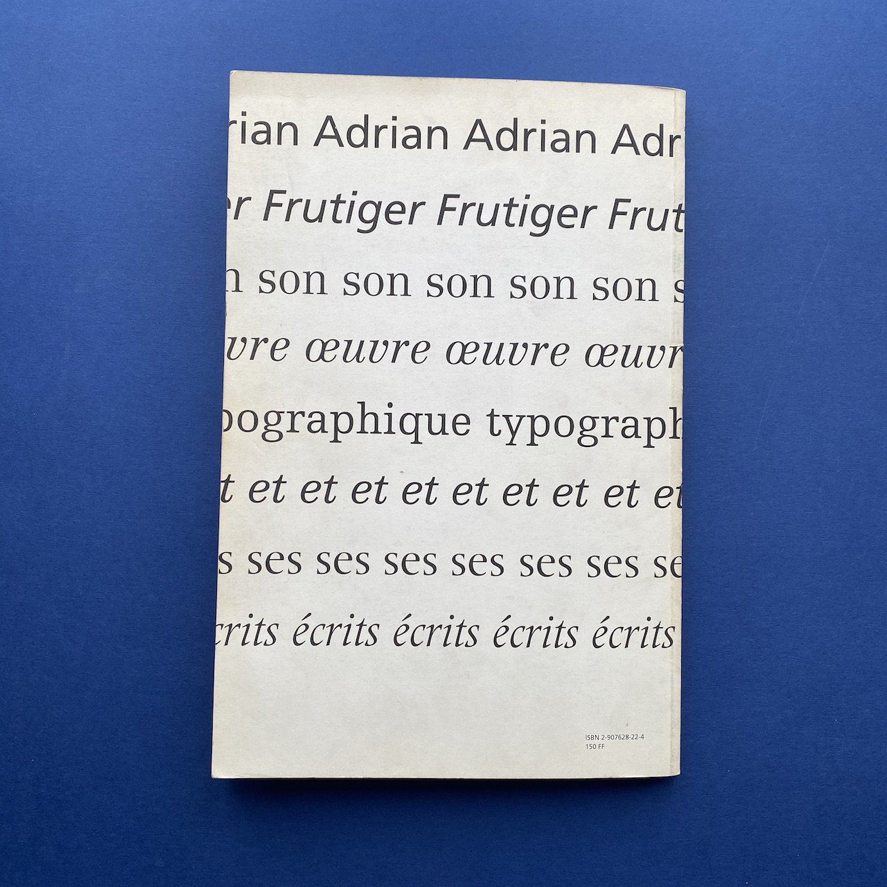 Adrian Frutiger, Son oeuvre typographique et ses écrits, Villeurbanne, 1994, 22 x 33 cm, 74 pp. Catalogue of the exhibition at Maison du livre, de l’image et du son in Villeurbanne. Covers show little rubbing, interior in very good condition.