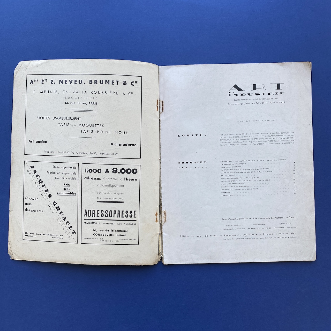 Art et industrie, June 1933, Paris, 24,5 x 31,7 cm, 47 pp. Front cover “Le Taureau de l’île de Crète” by Paule Max Ingrand. Magazine in good general condition. Front and back cover shows some signs of use.