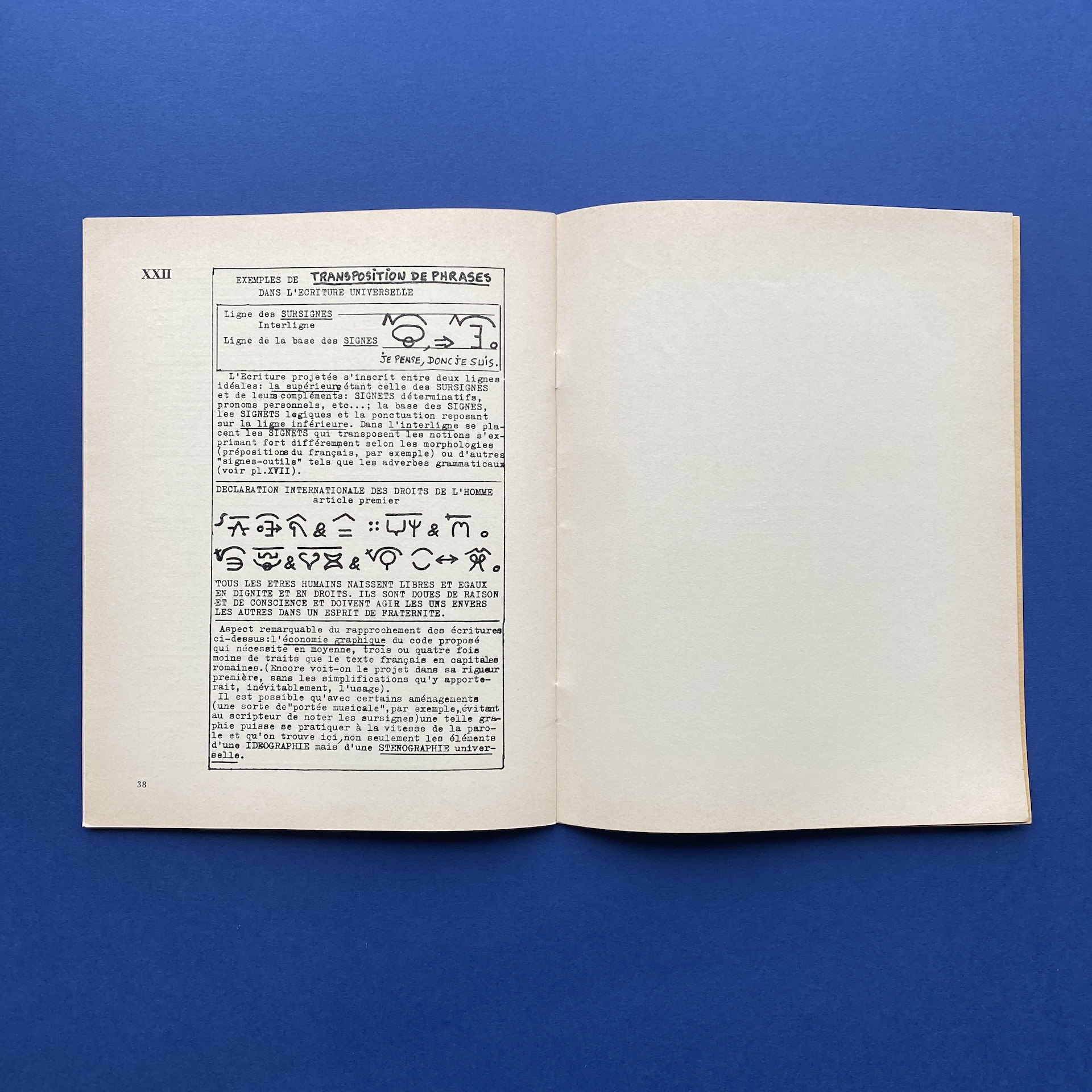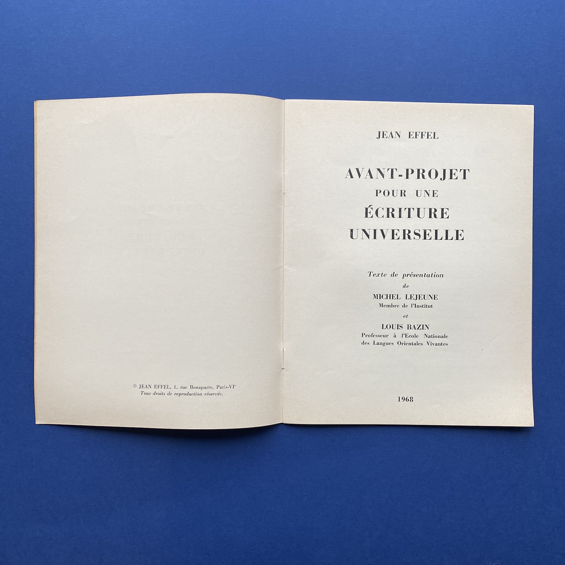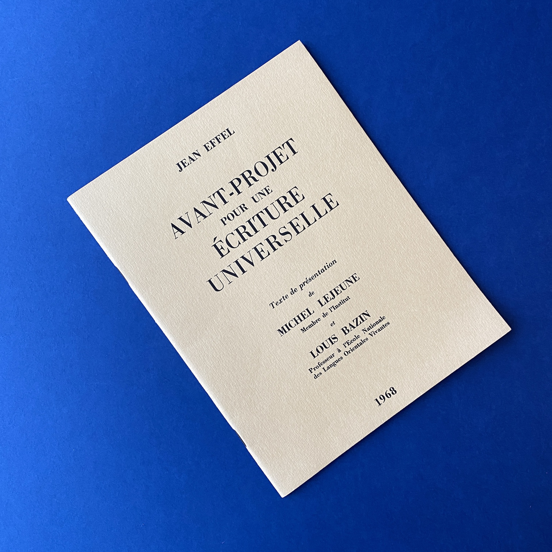 LEJEUNE Michel and BAZIN Louis, Avant-projet pour une écriture universelle, Paris, Printed on « Les presses de l’imprimerie Réaumur », 1968, 21 x 27 cm, 38 pp, Illustrations by EFFEL Jean. Copy in very good condition.
