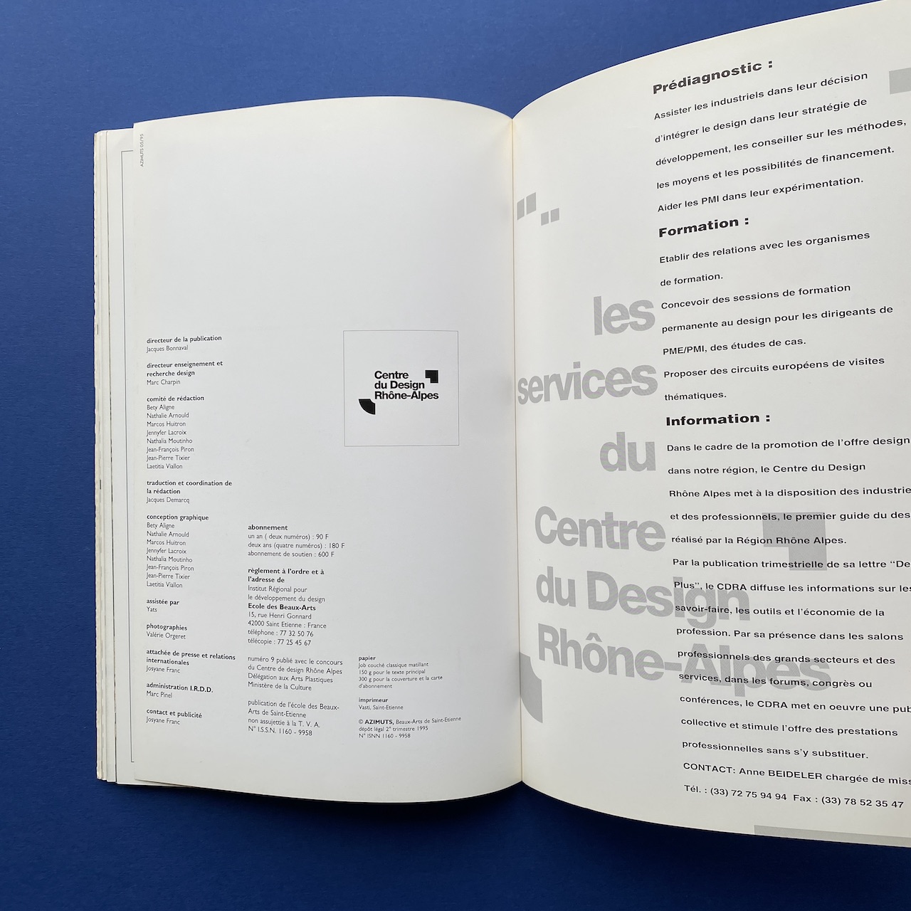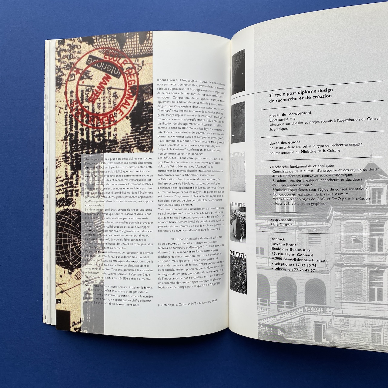 Azimuts #9, revue de design, Intention de textes et d’images, May 1995, Saint-Etienne, École des Beaux-Arts de Saint-Etienne, 19,7 x 30 cm, 60 pp. Magazine in very good condition.