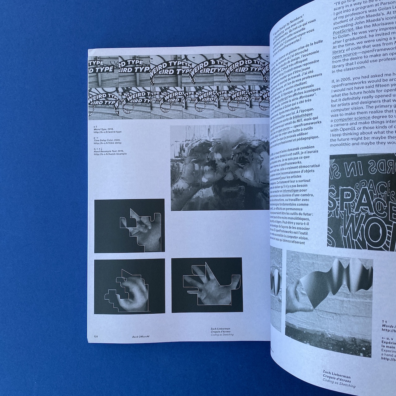 This fourth issue is devoted to the idea of movement in digital practices. The movement progressively becomes an obligatory step for graphic designers, both for its efficiency and as a bit of a trending fad. “Going with the flow” thus becomes a paradoxical directive. Breaking with tradition means one runs the risk of being out of step with clients and prevailing tastes and habits, but excessive compliance results in stereotypical productions. Is it reductive to consider that graphic design might be intrinsically and positively “augmented” by this movement? What effect would this animation paradigm have on form? Could animation be perceived in a manner other than as a mere adaptation or adjunct? The ubiquity of screens, in both private (tablets, smartphones, etc.) and public (advertising or informational displays) spaces, means that graphic designers need to diversify their approaches, thus making it necessary to conceive design spaces that are variable and translatable.”