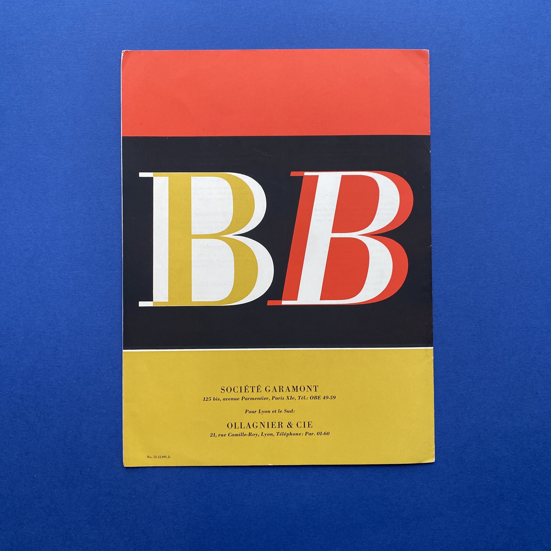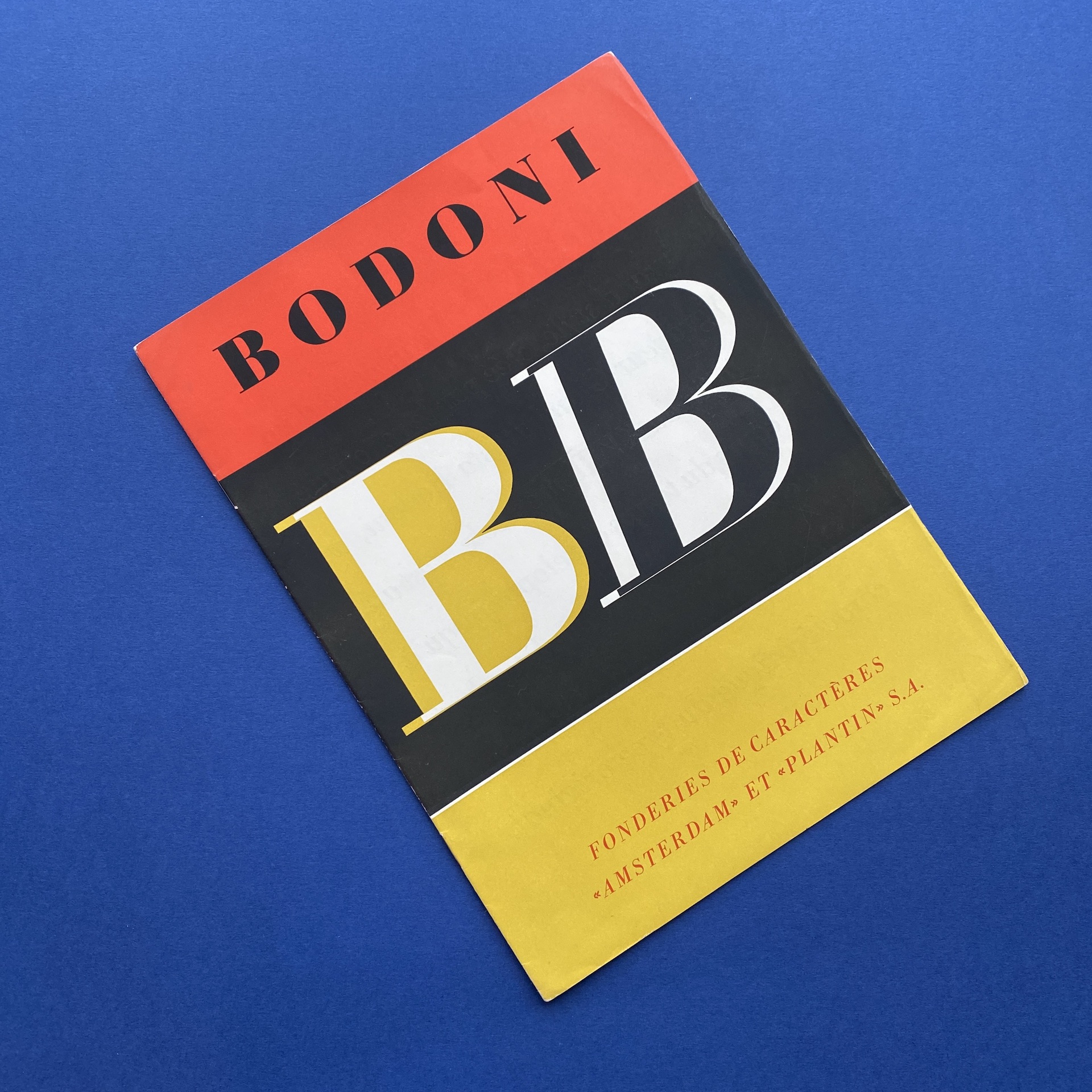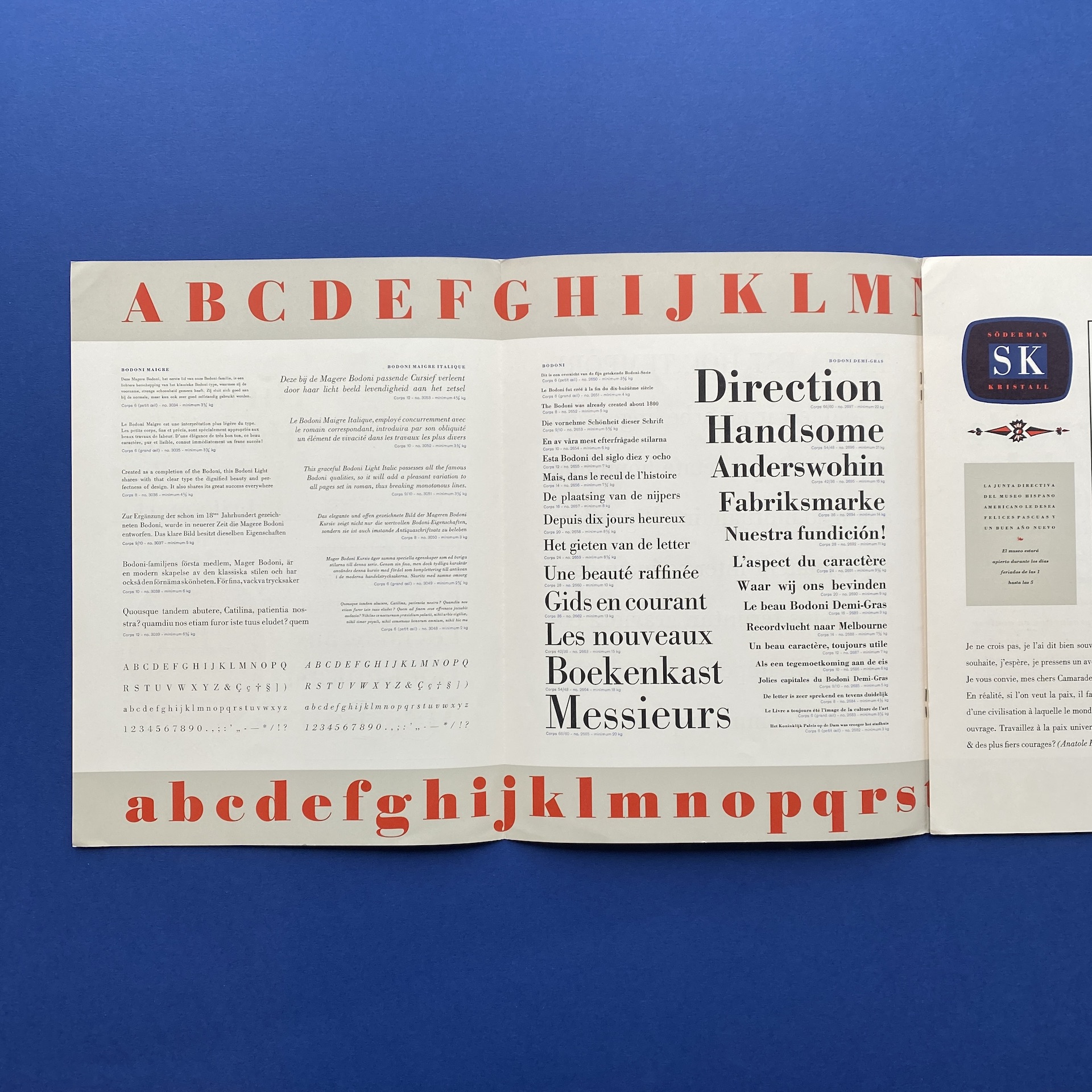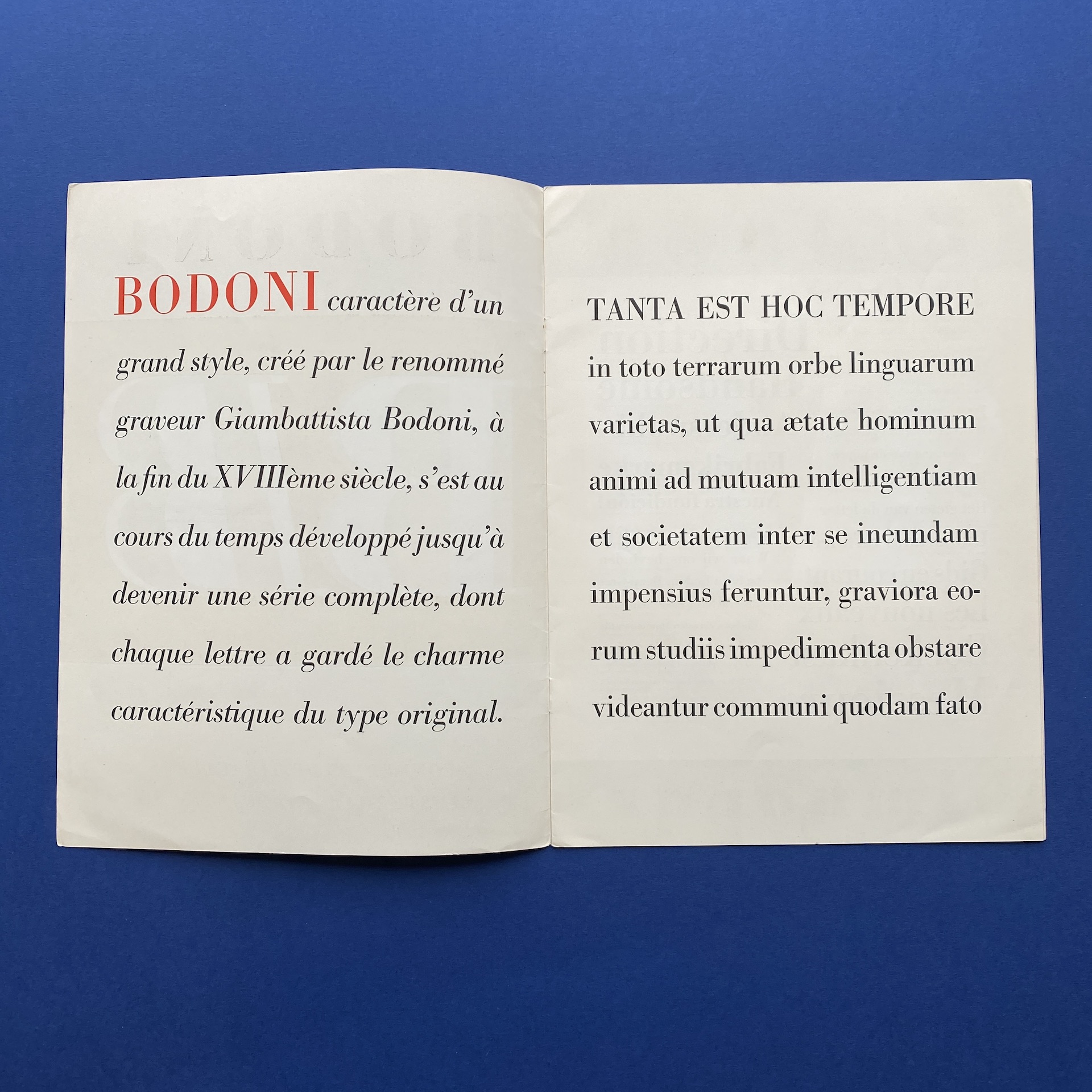 Bodoni, Paris, Société Garamont, 1955, 21,5 x 29 cm, not paginated, Fonderies de caractères Amsterdam and Plantin S.A. Copy in very good condition.