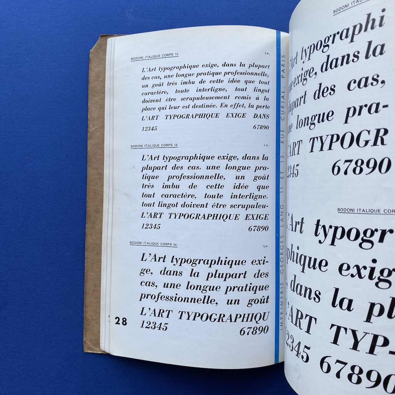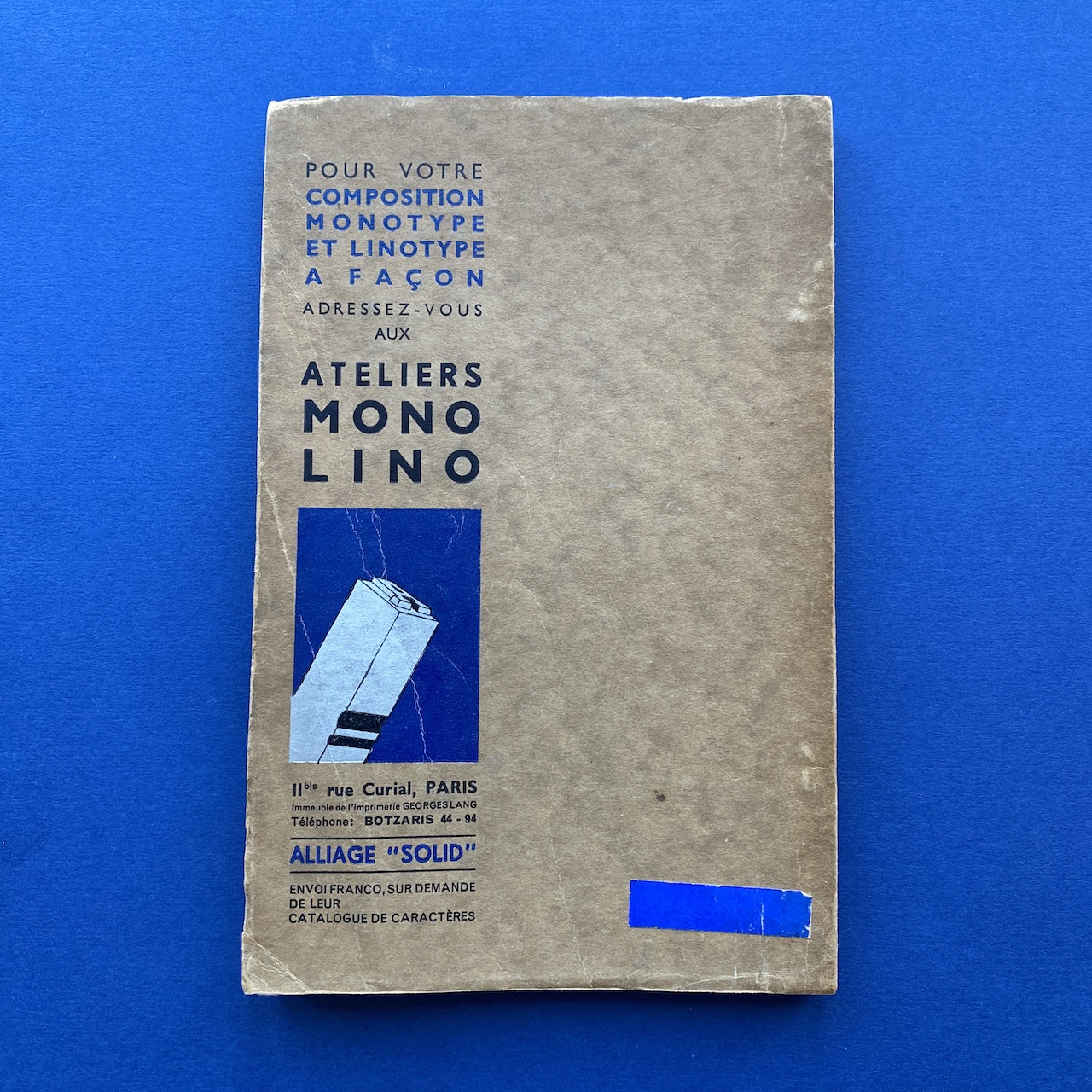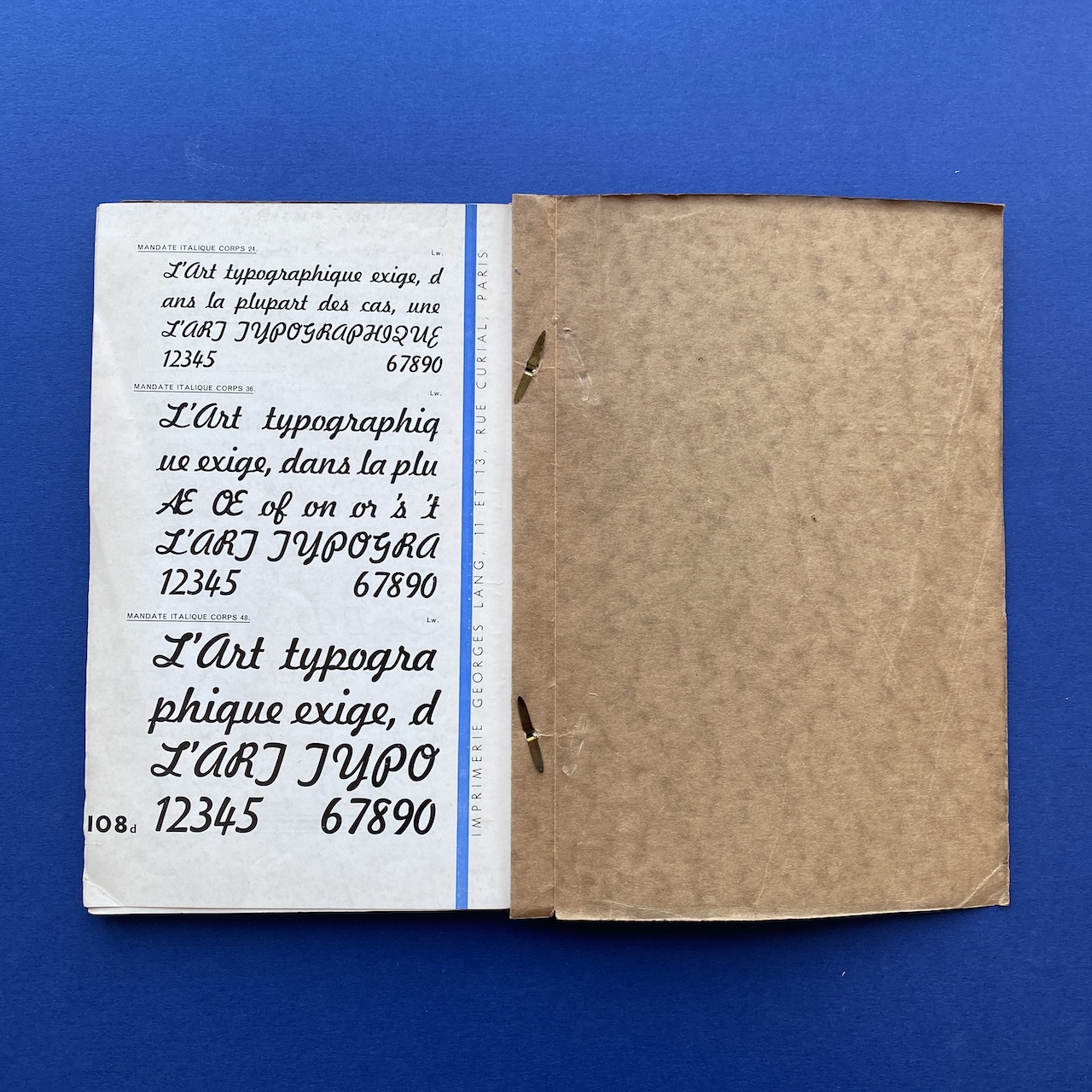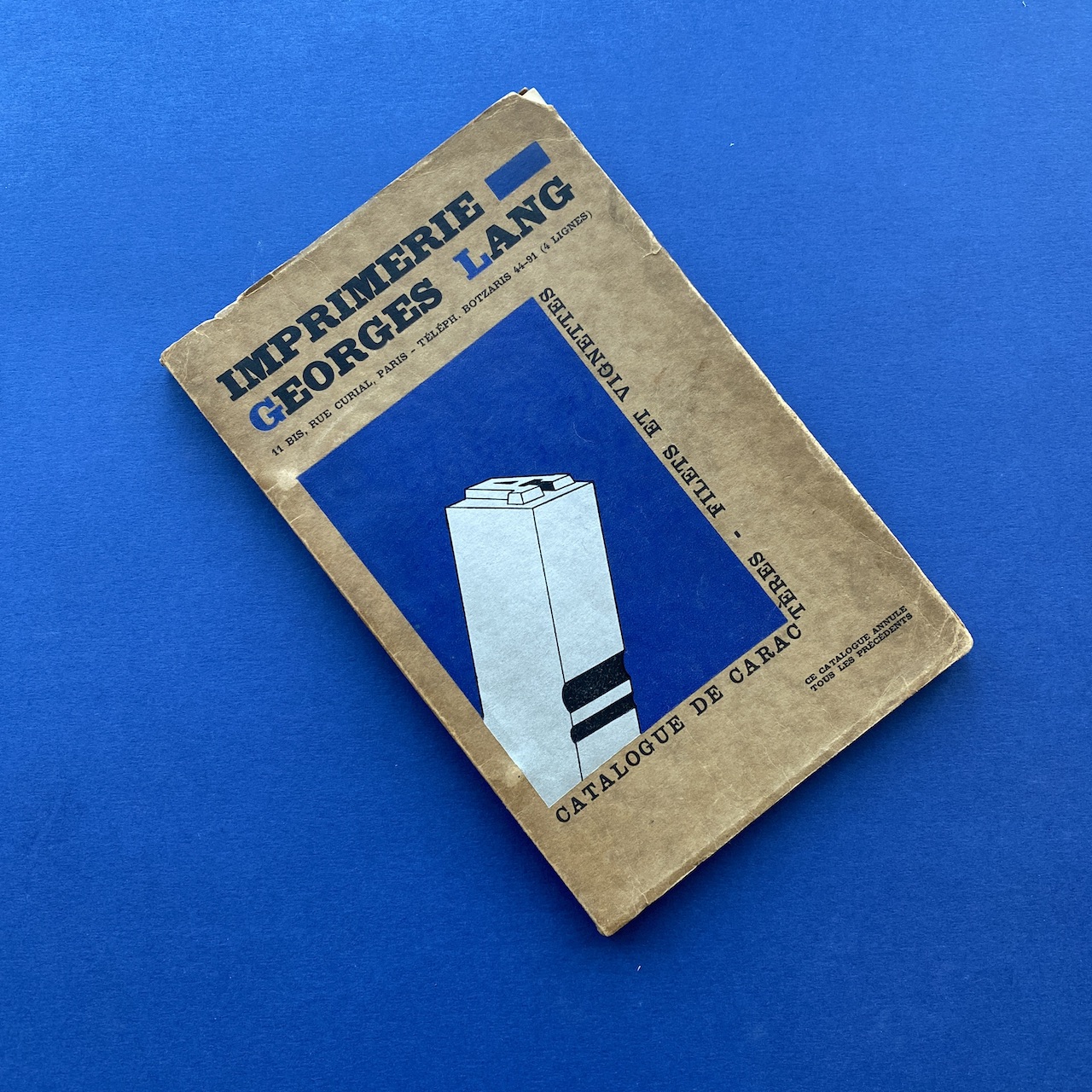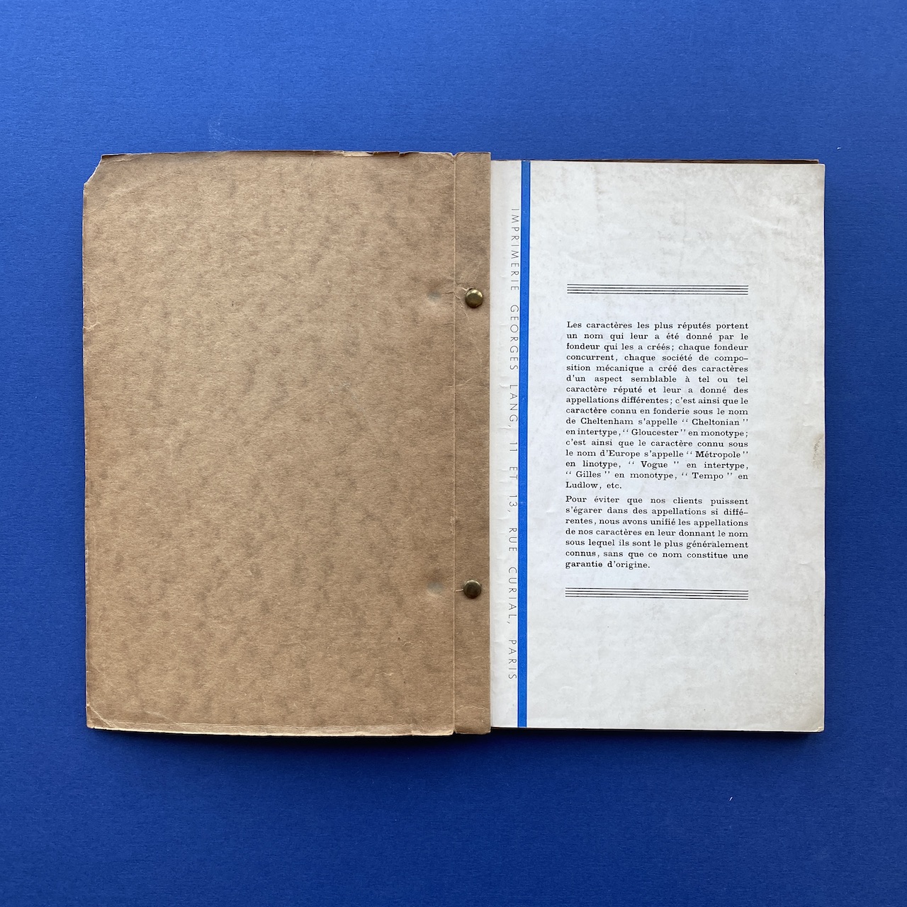 Catalogue de caractères – Filets et vignettes, Imprimerie Georges Lang, Paris, 1935, 15,7 x 24,4 cm, 108 pp. Interior in good condition, the covers show some signs of use (the upper right corner of the cover is missing).