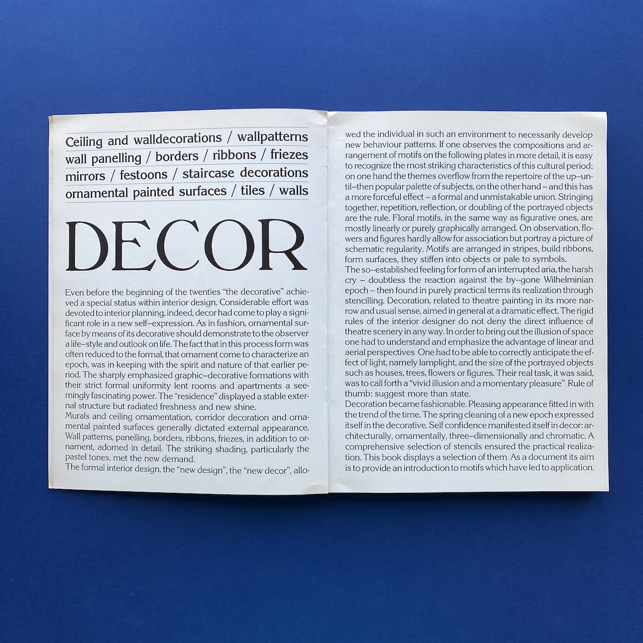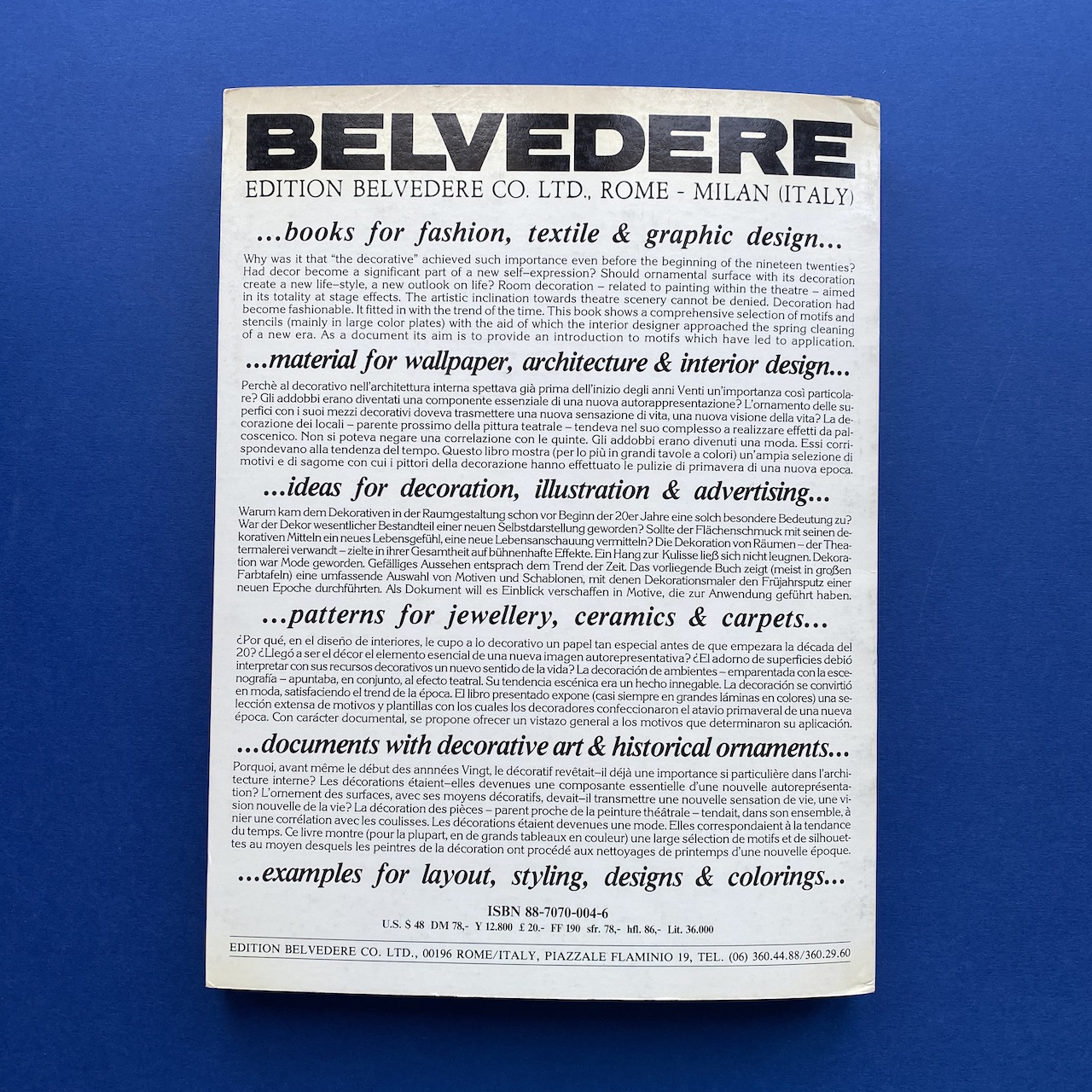 Decor #3, Belvedere, Edition Belvedere co. LTD, Roma/Italy, 1980, 24 x 32 cm, 197 pp. Contains mural, ceiling decoration, stage curtaining decoration, wall, staircase decorations… Copy in very condition.