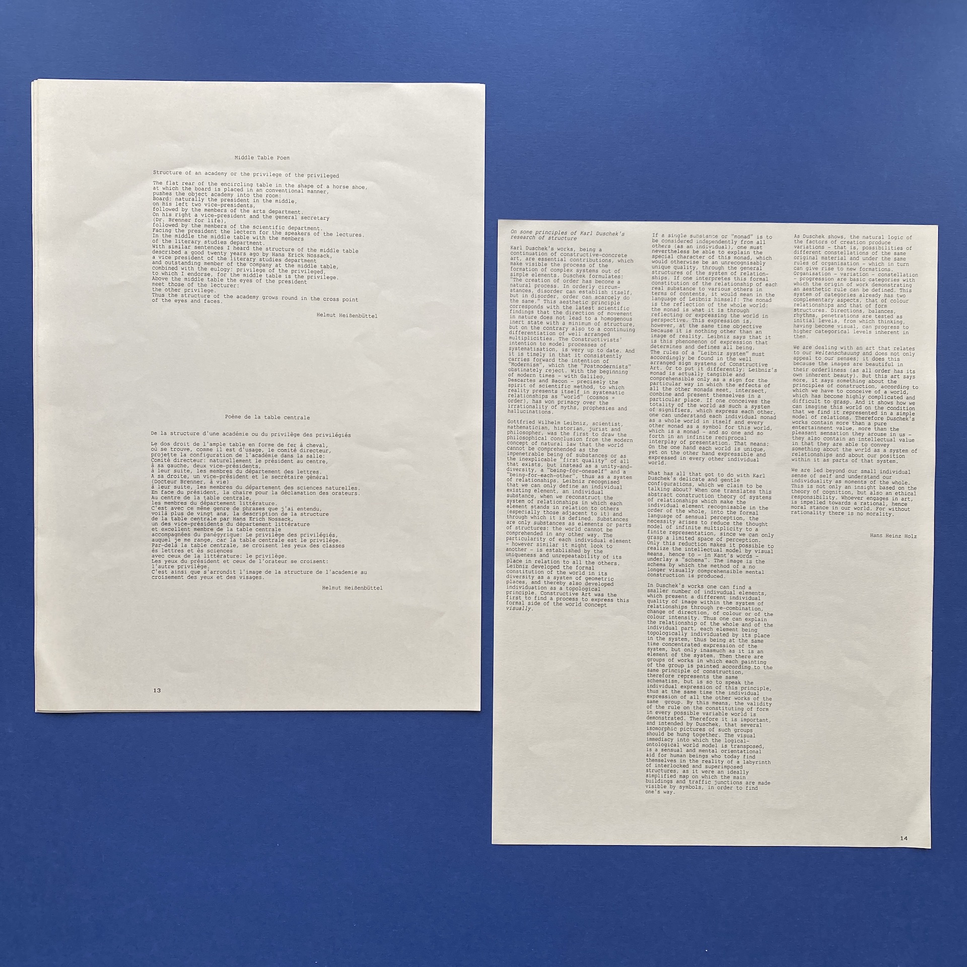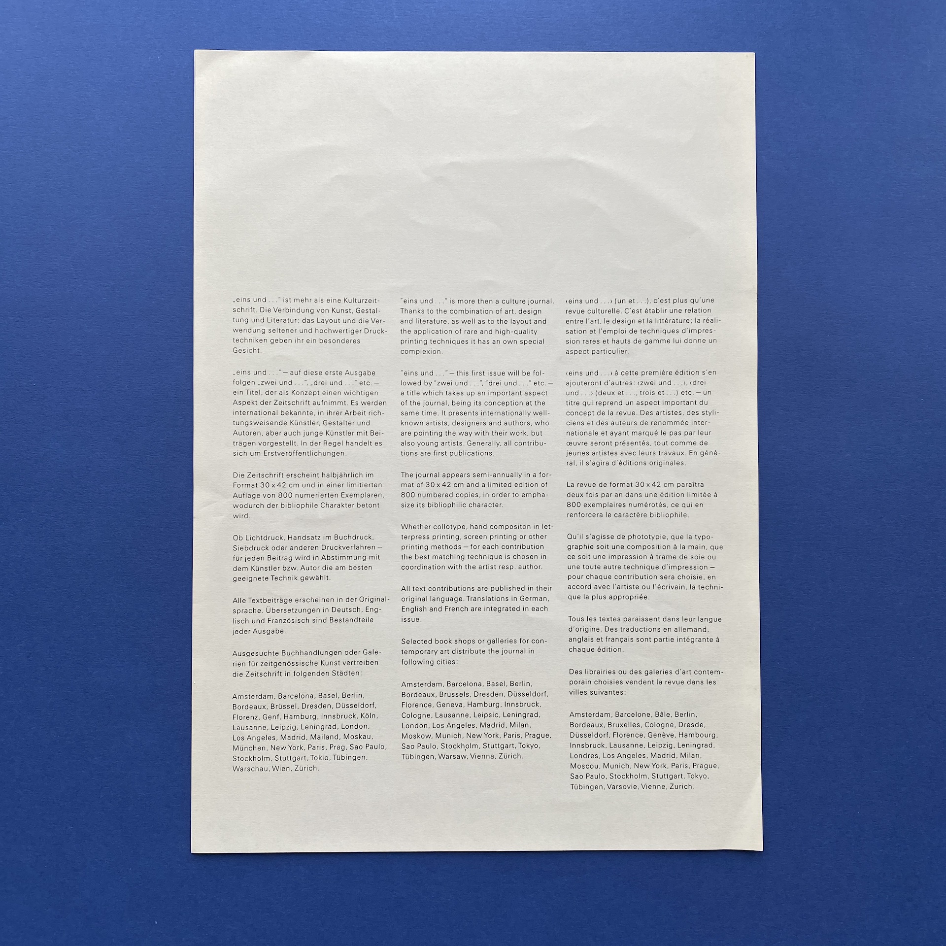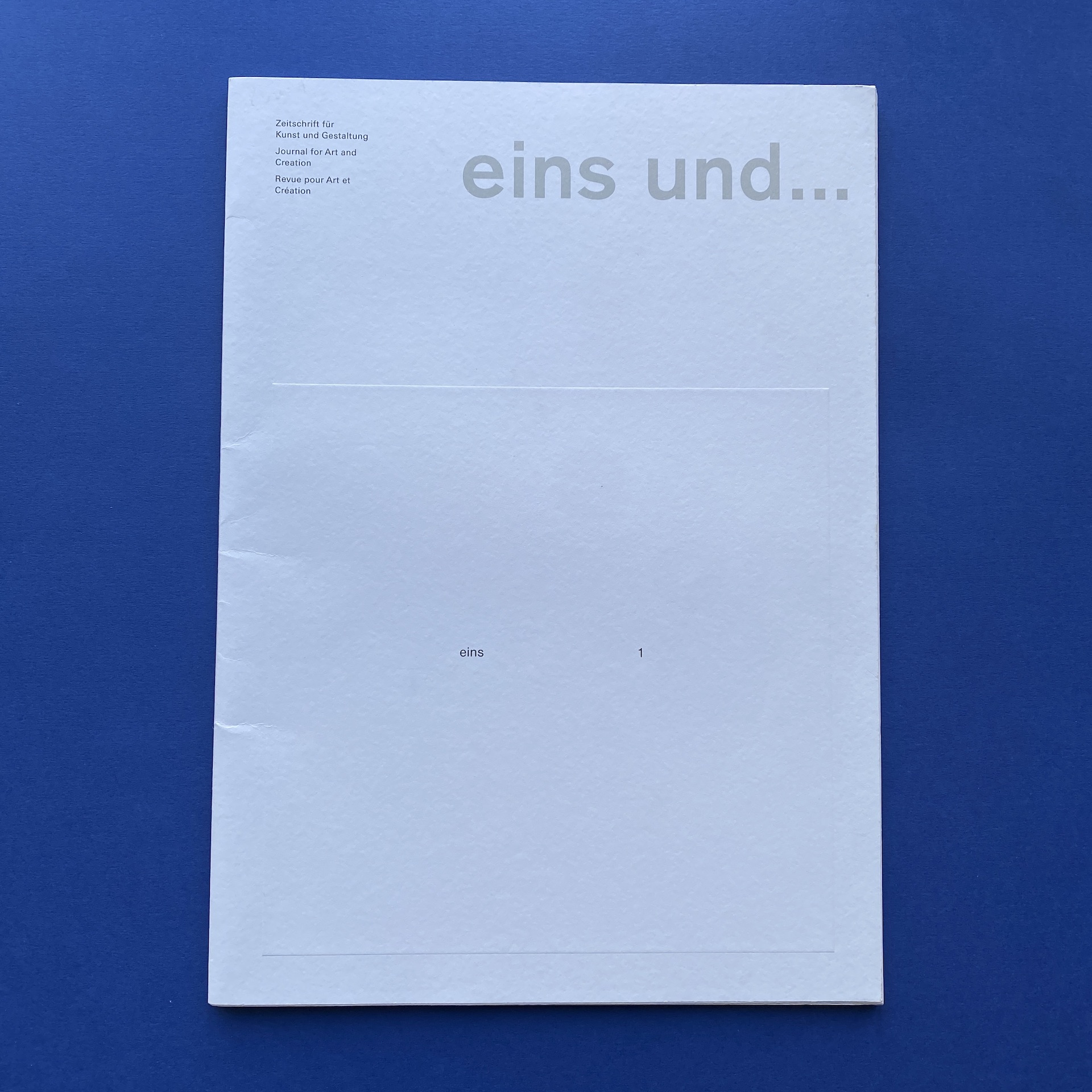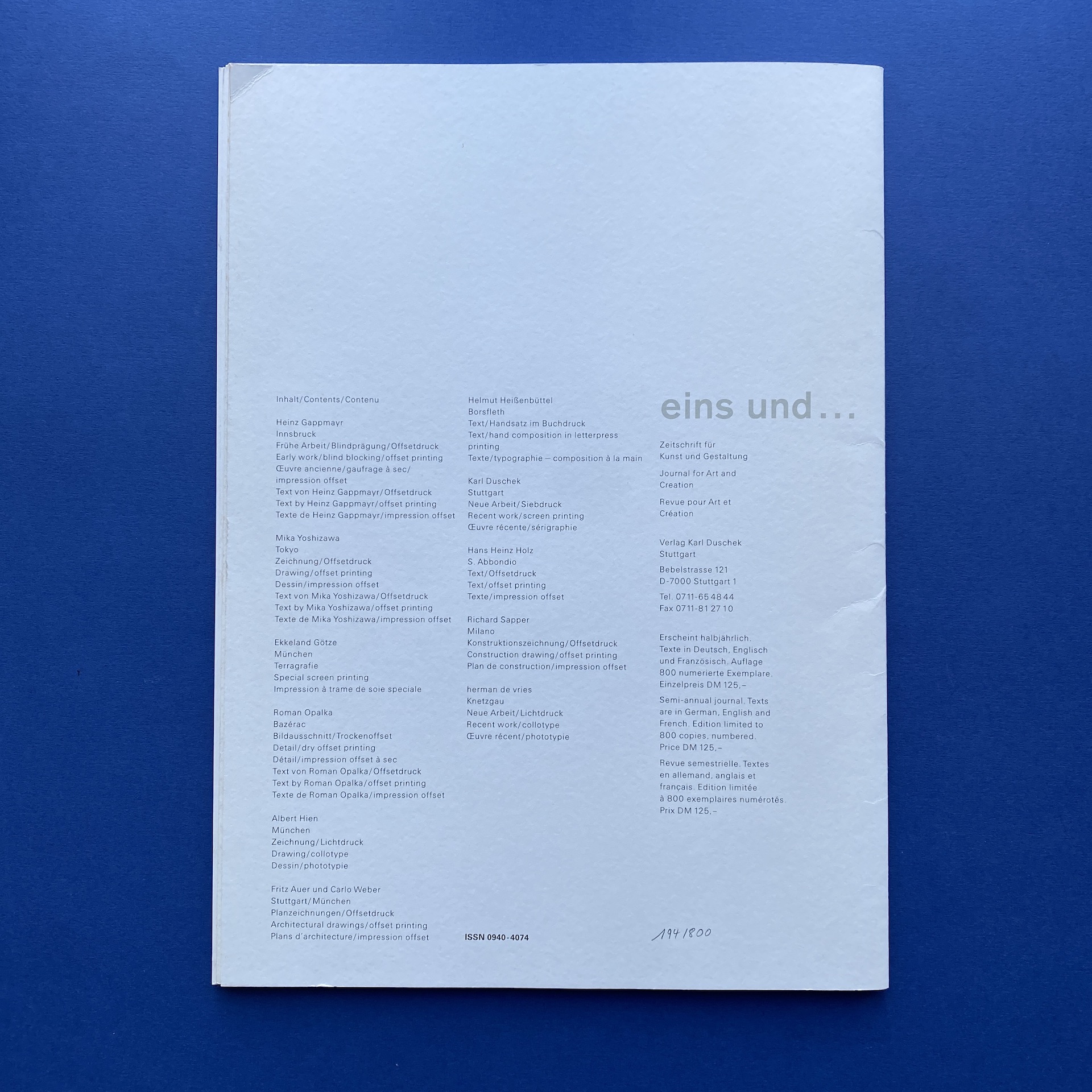eins und…, Revue pour art et création, Stuttgart, Verlag Karl Duschek, 1991, 30 x 43 cm, not paginated. Trilingual, German/English/ French. Limited numbered edition, 194/800. 2 parts in excellent condition in glassine enveloppe. No signs of wear.