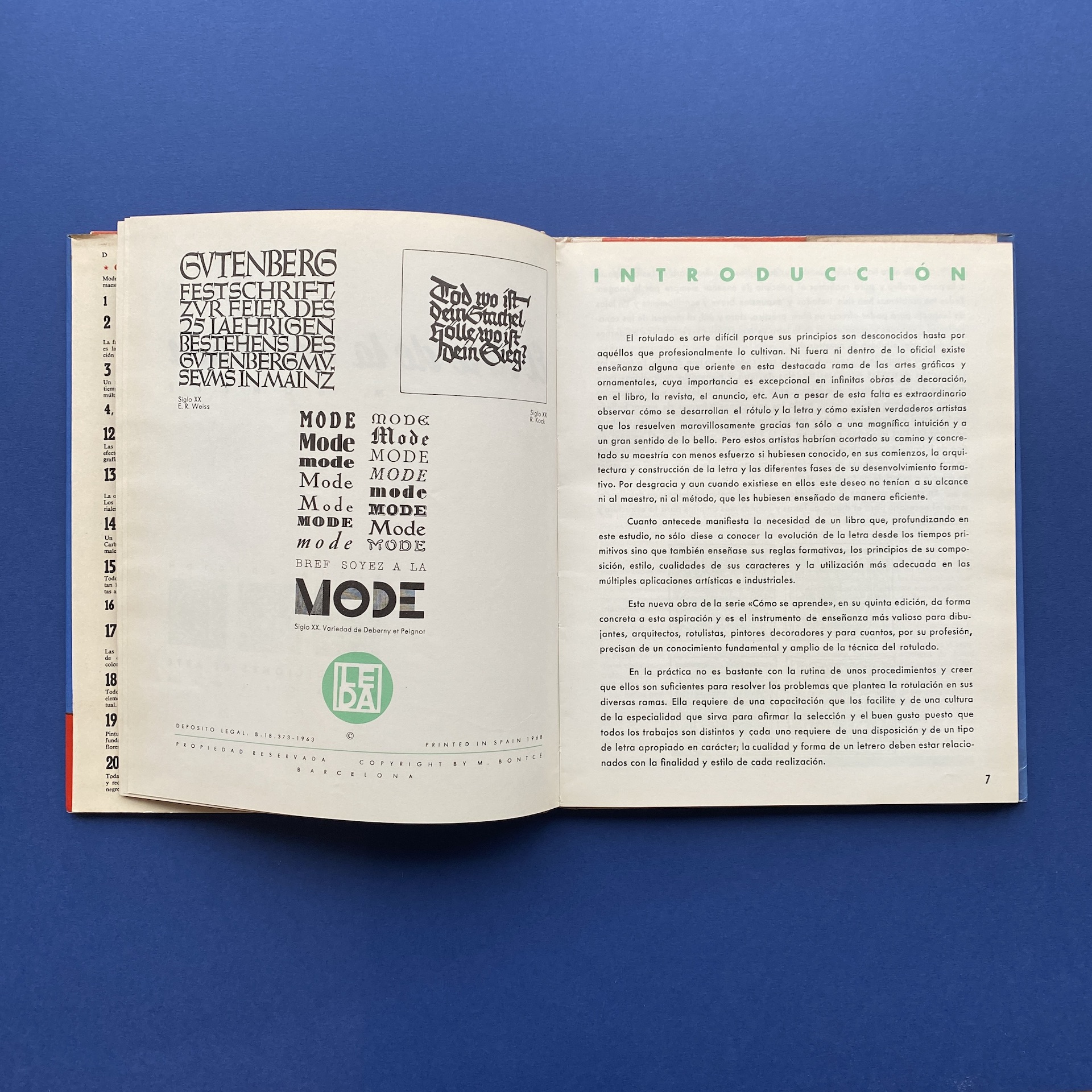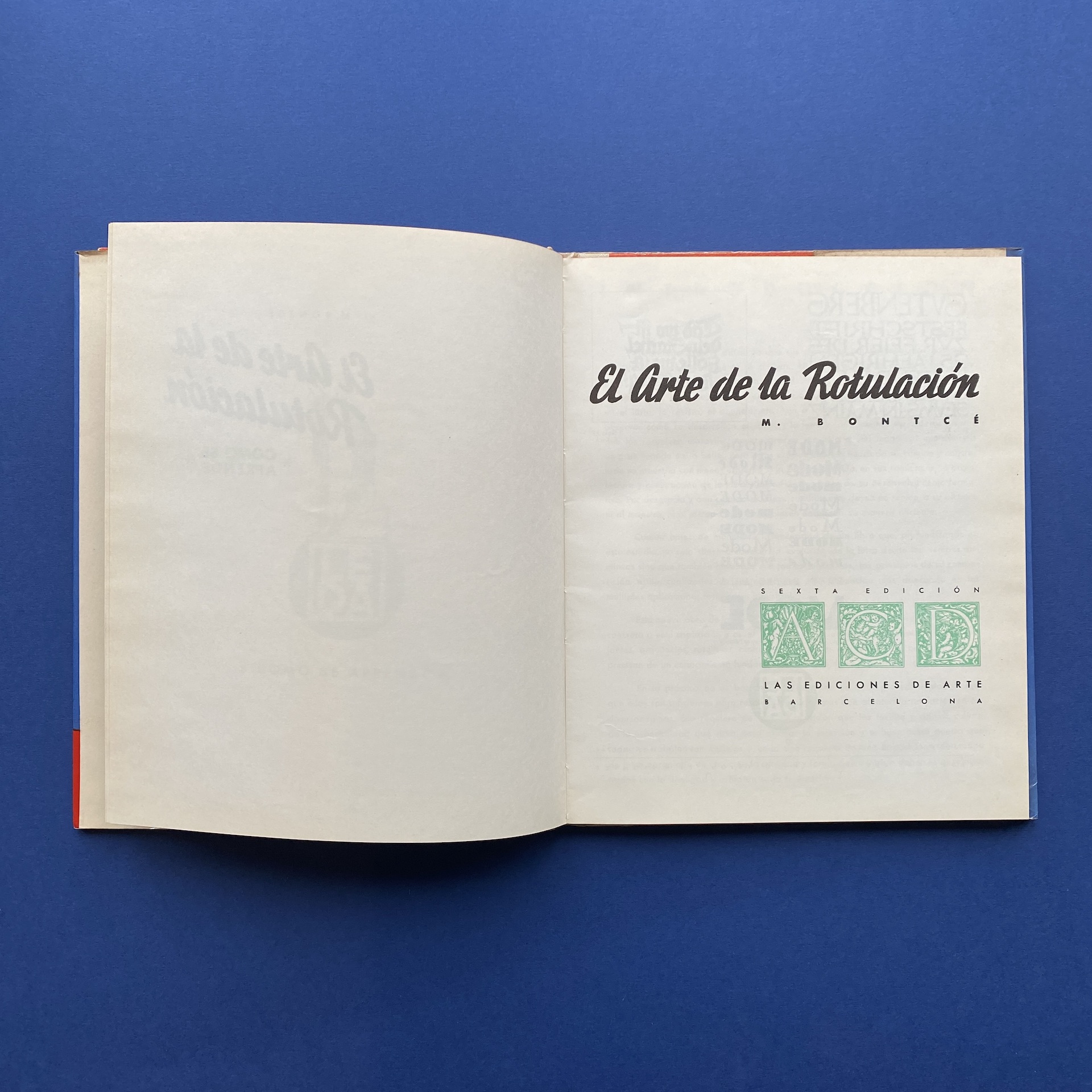 BONTCE M., El arte de la rotulatiòn, la arquitectura de la letra y sus aplicaciones, Barcelona, Sexta Ediciòn, 1968, 22 x 27 cm, 95 pp. Very good condition: some signs of wear on the corners on the front cover.