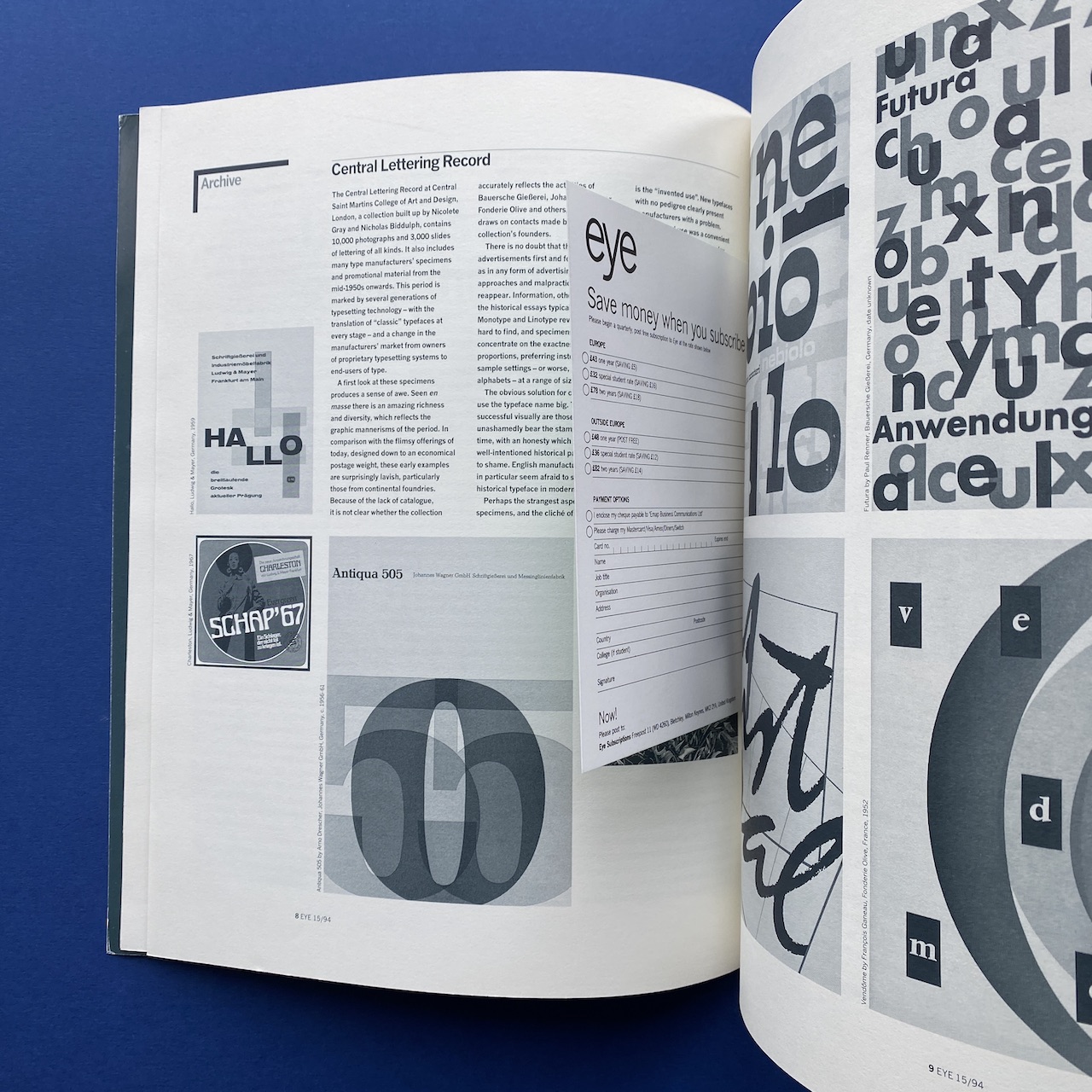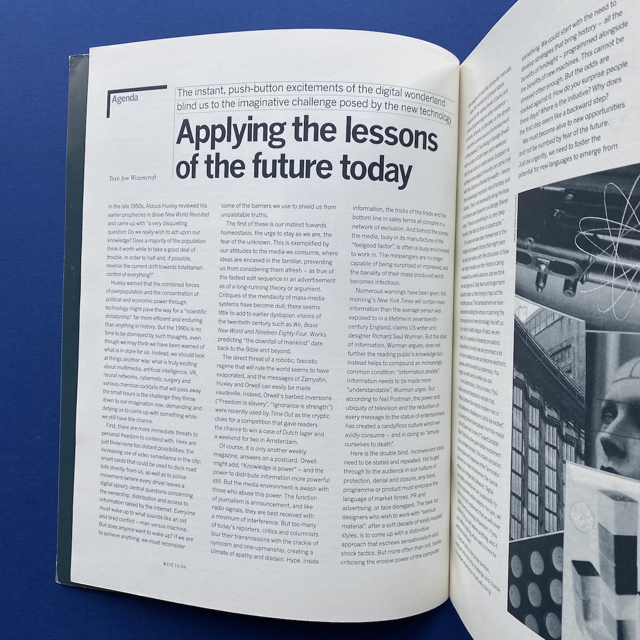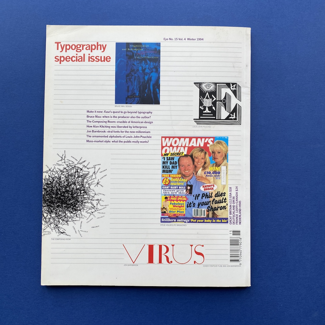 Eye #15, The international review of graphic design, vol. 4, winter 1994, London, Emap business publication, 23,5 x 30 cm, 84 pp. With Jon Wozencroft, Rick Poynor, Phil Baines, Julia Thrift… Very good condition.