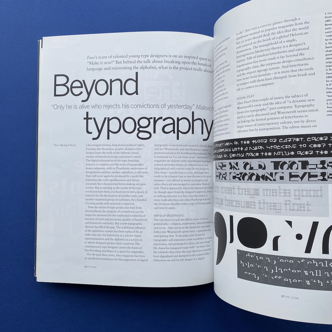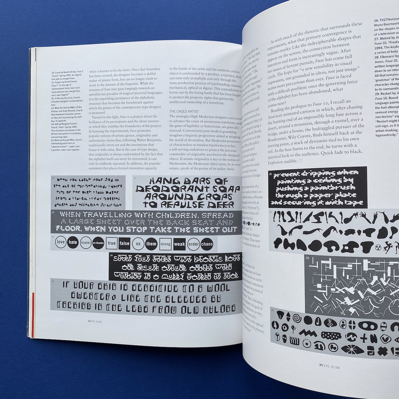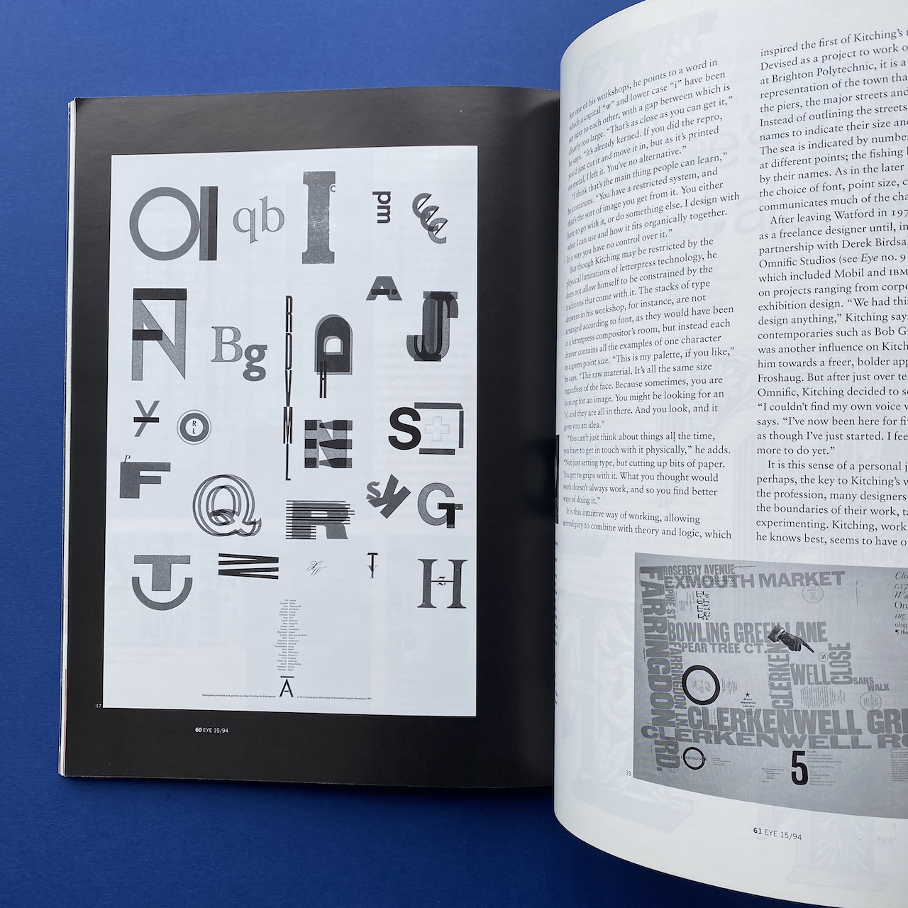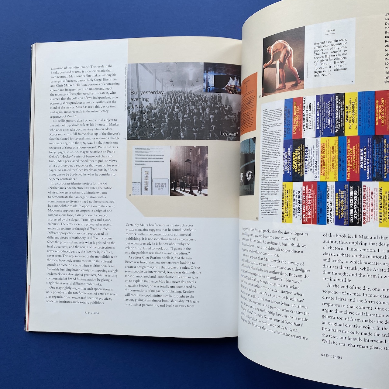Eye #15, The international review of graphic design, vol. 4, winter 1994, London, Emap business publication, 23,5 x 30 cm, 84 pp. With Jon Wozencroft, Rick Poynor, Phil Baines, Julia Thrift… Very good condition.