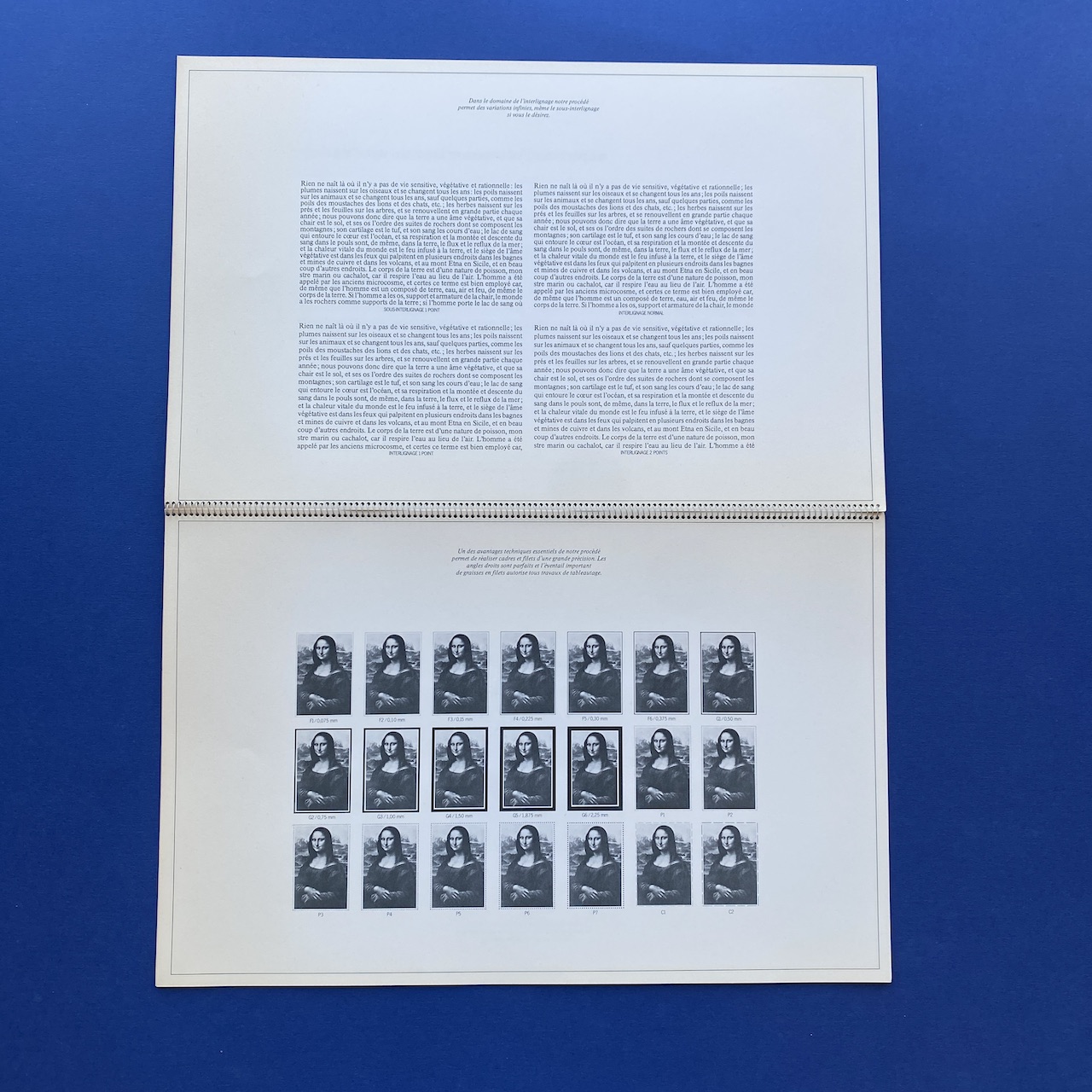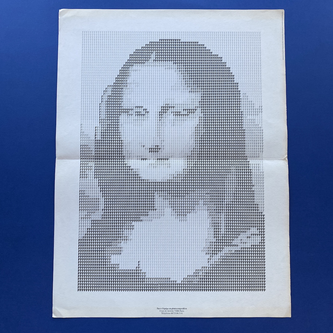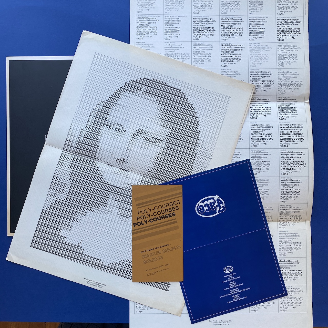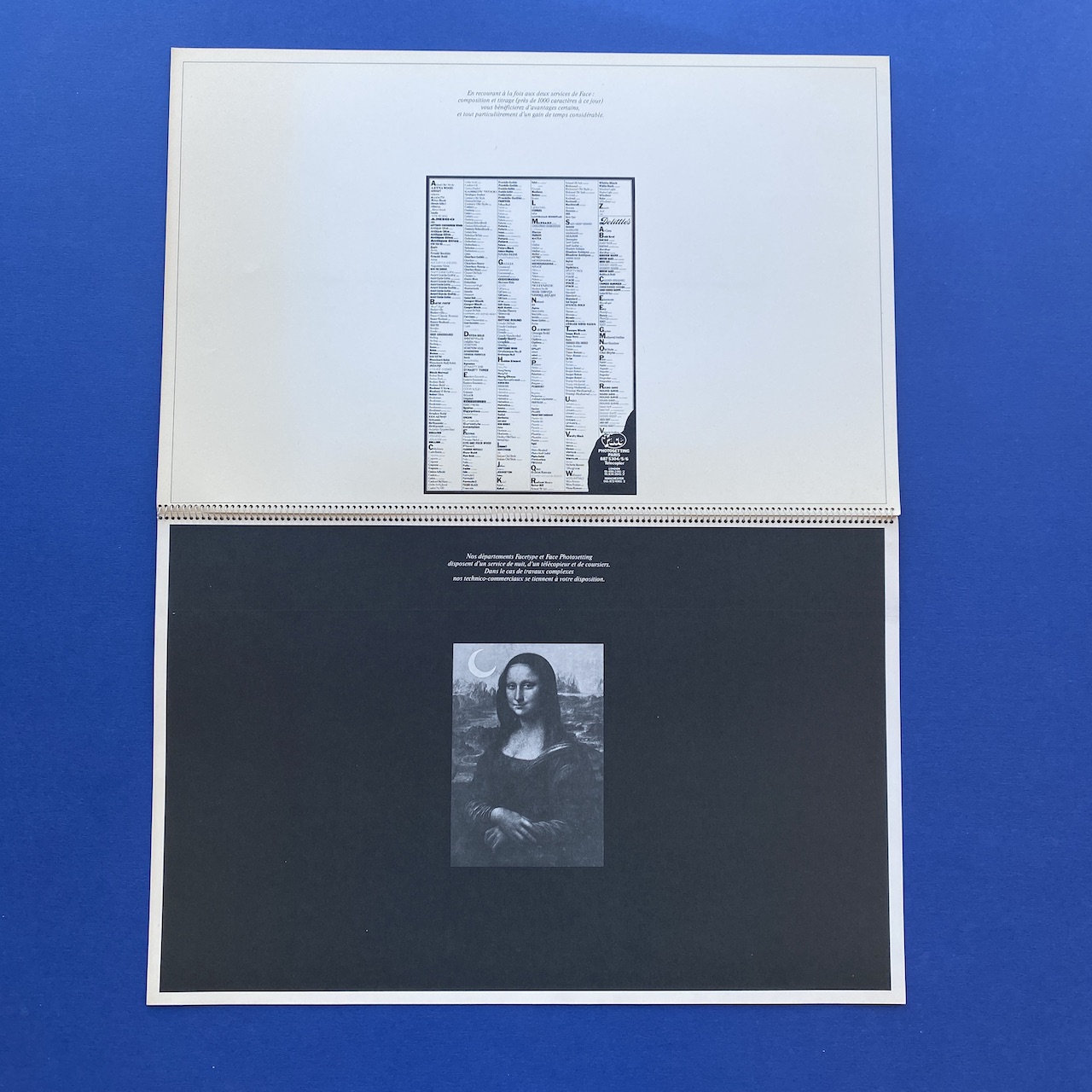 Facetype [with Mona Lisa ASCII Poster], Paris, 1980s, 38 x 26,7 cm, 12 pp. Spiral binding in good condition. 2 Posters a bit yellowed by time (72 fonts: 38 x 73 cm and Mona Lisa: 38 x 51 cm). 2 little advertising leaflets inserted Face and Polycourses.