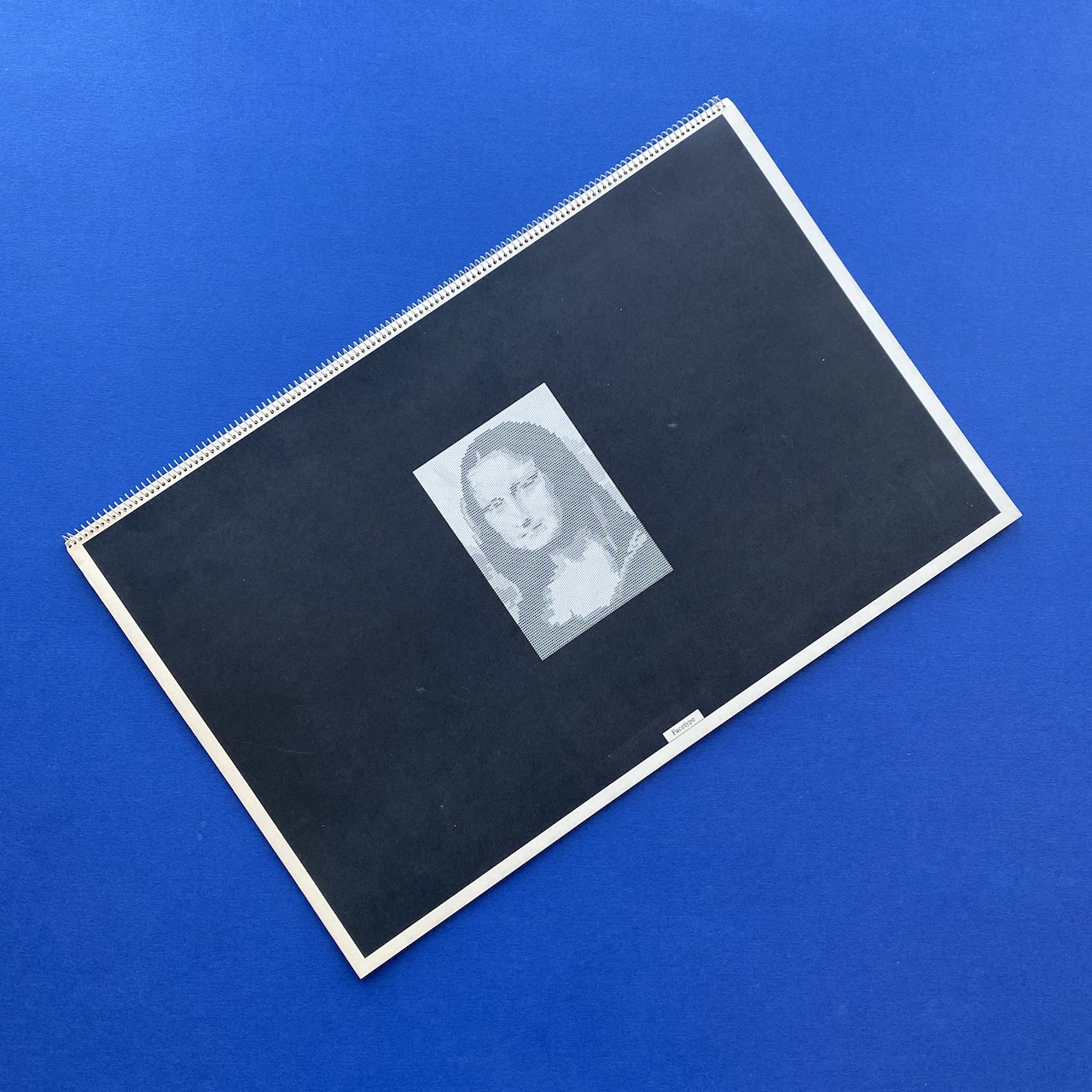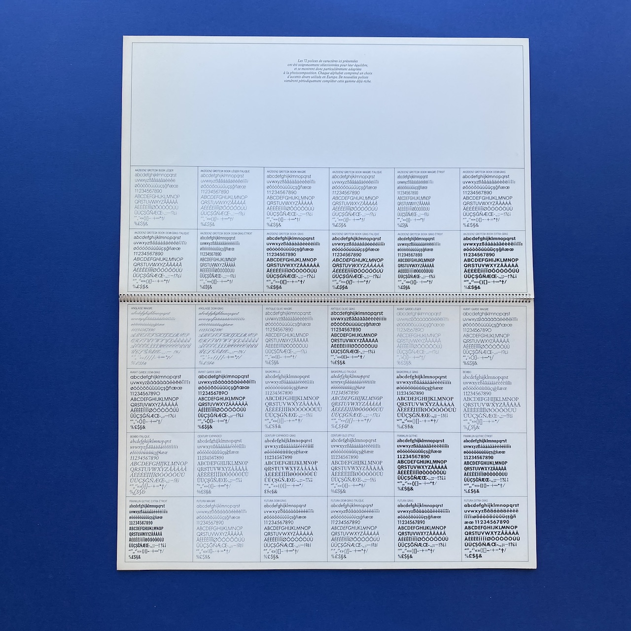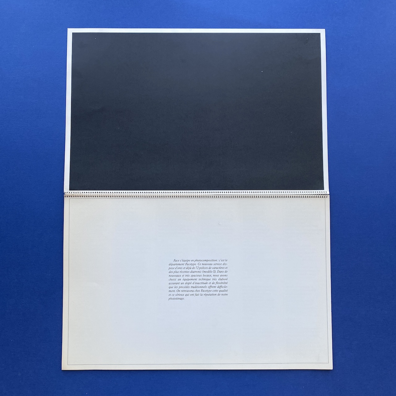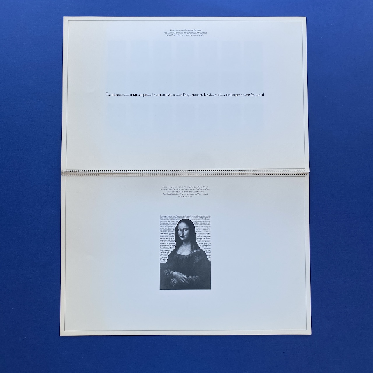 Facetype [with Mona Lisa ASCII Poster], Paris, 1980s, 38 x 26,7 cm, 12 pp. Spiral binding in good condition. 2 Posters a bit yellowed by time (72 fonts: 38 x 73 cm and Mona Lisa: 38 x 51 cm). 2 little advertising leaflets inserted Face and Polycourses.