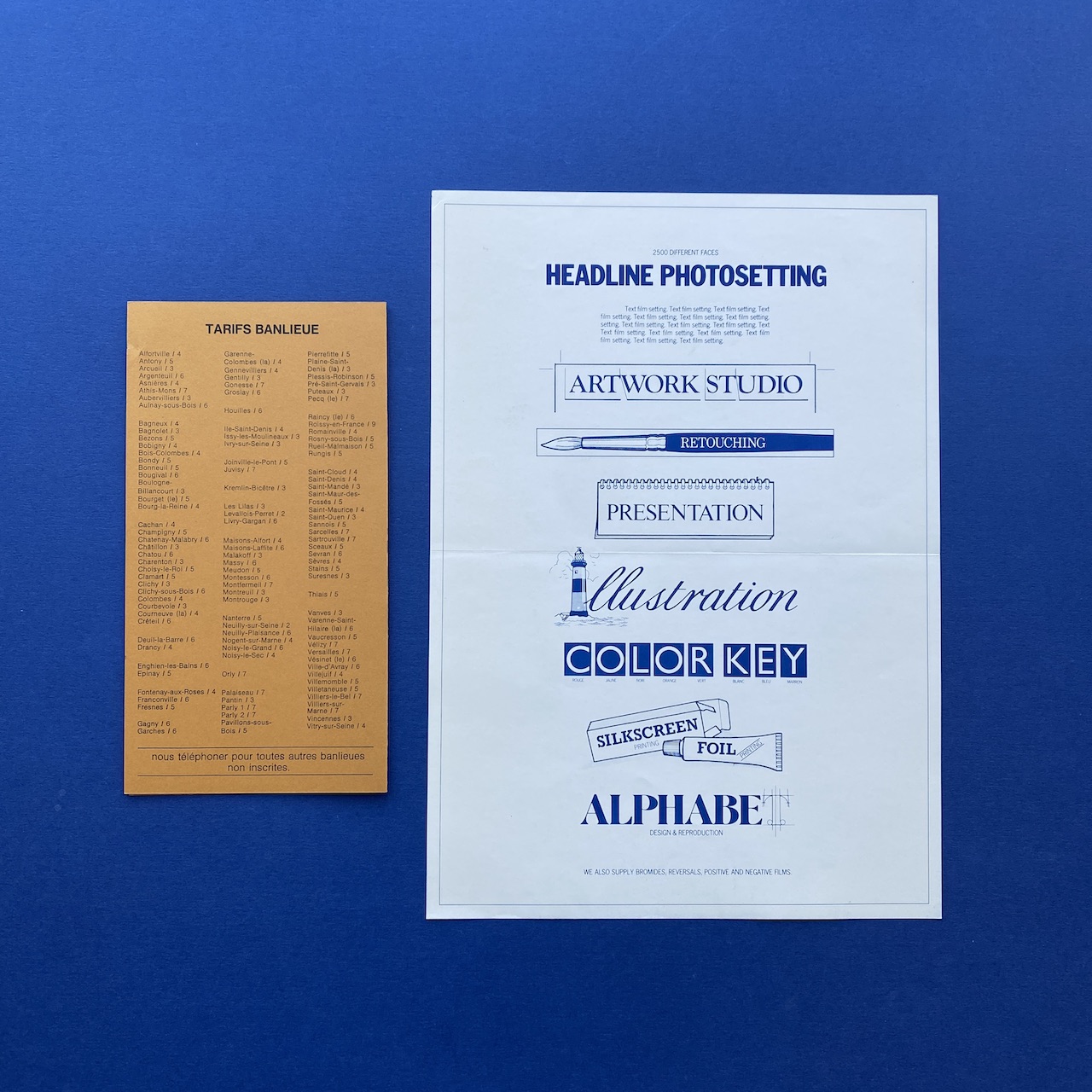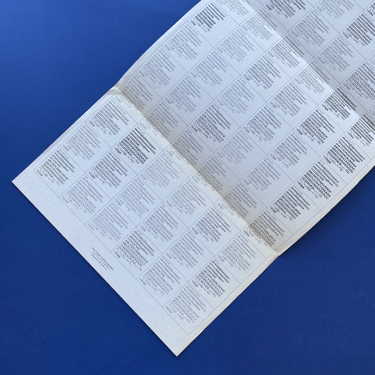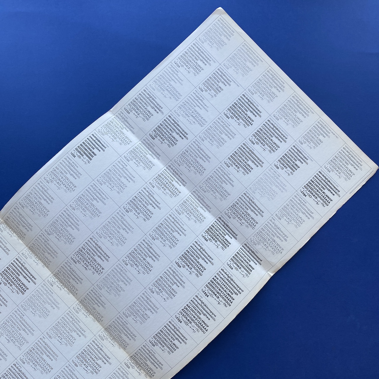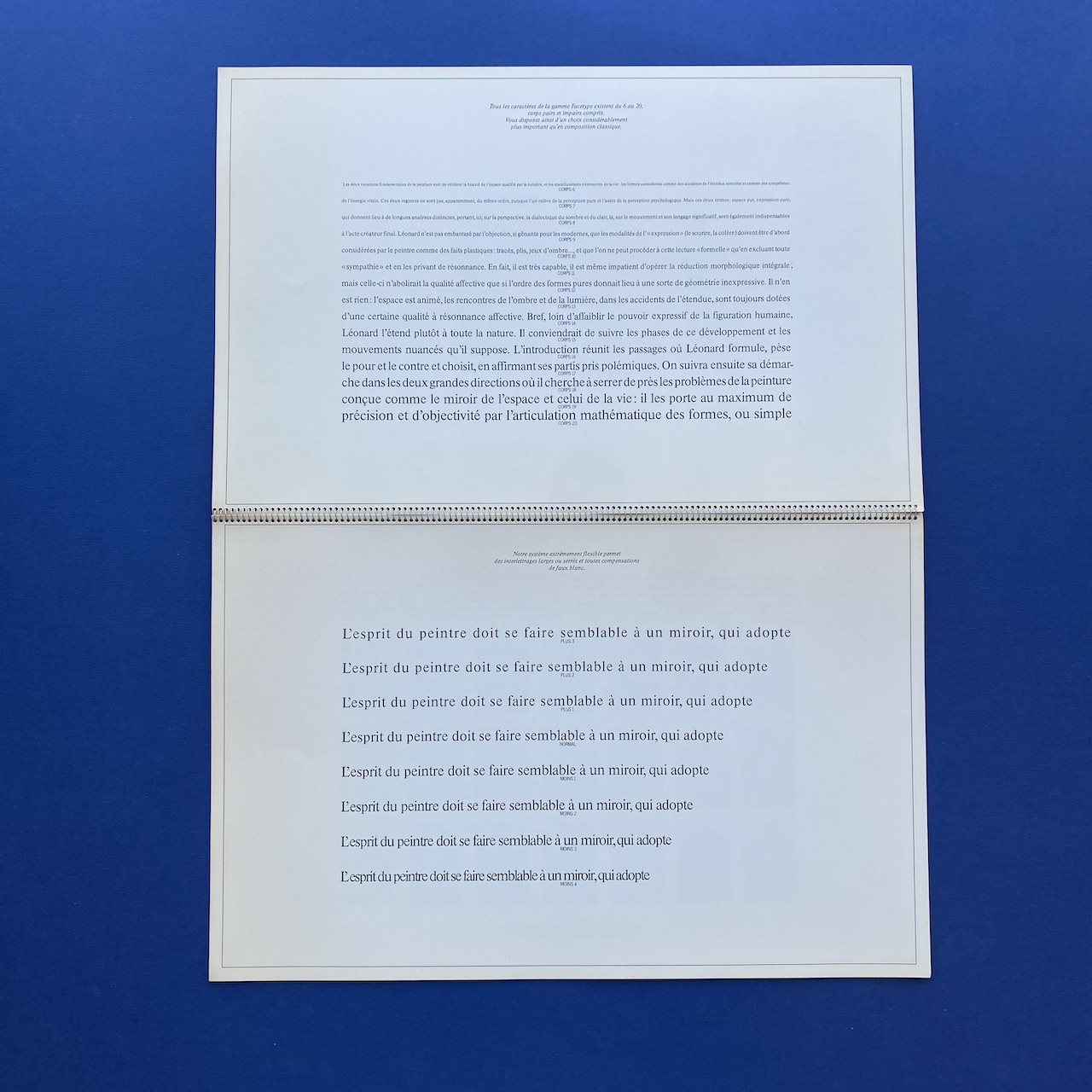 Facetype [with Mona Lisa ASCII Poster], Paris, 1980s, 38 x 26,7 cm, 12 pp. Spiral binding in good condition. 2 Posters a bit yellowed by time (72 fonts: 38 x 73 cm and Mona Lisa: 38 x 51 cm). 2 little advertising leaflets inserted Face and Polycourses.