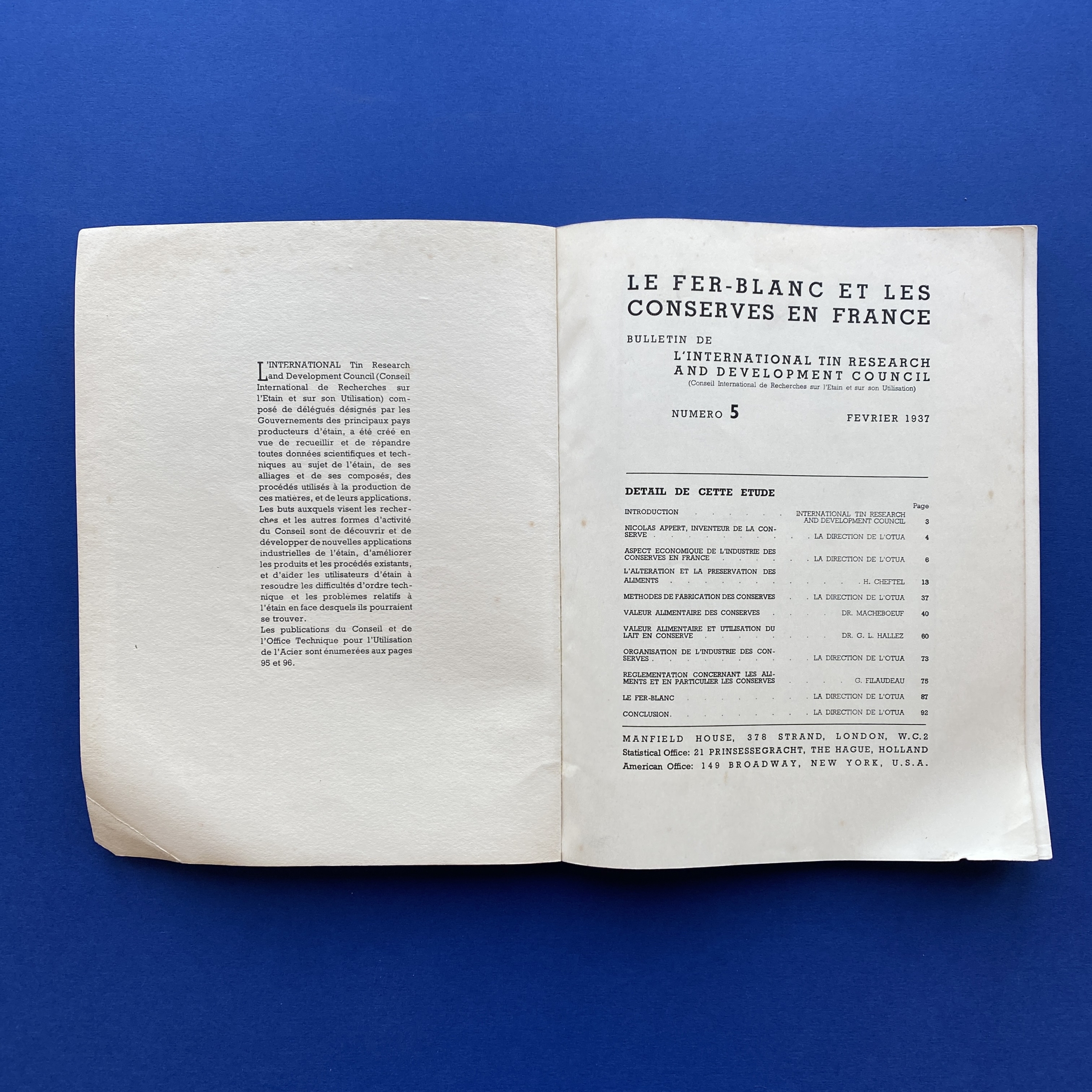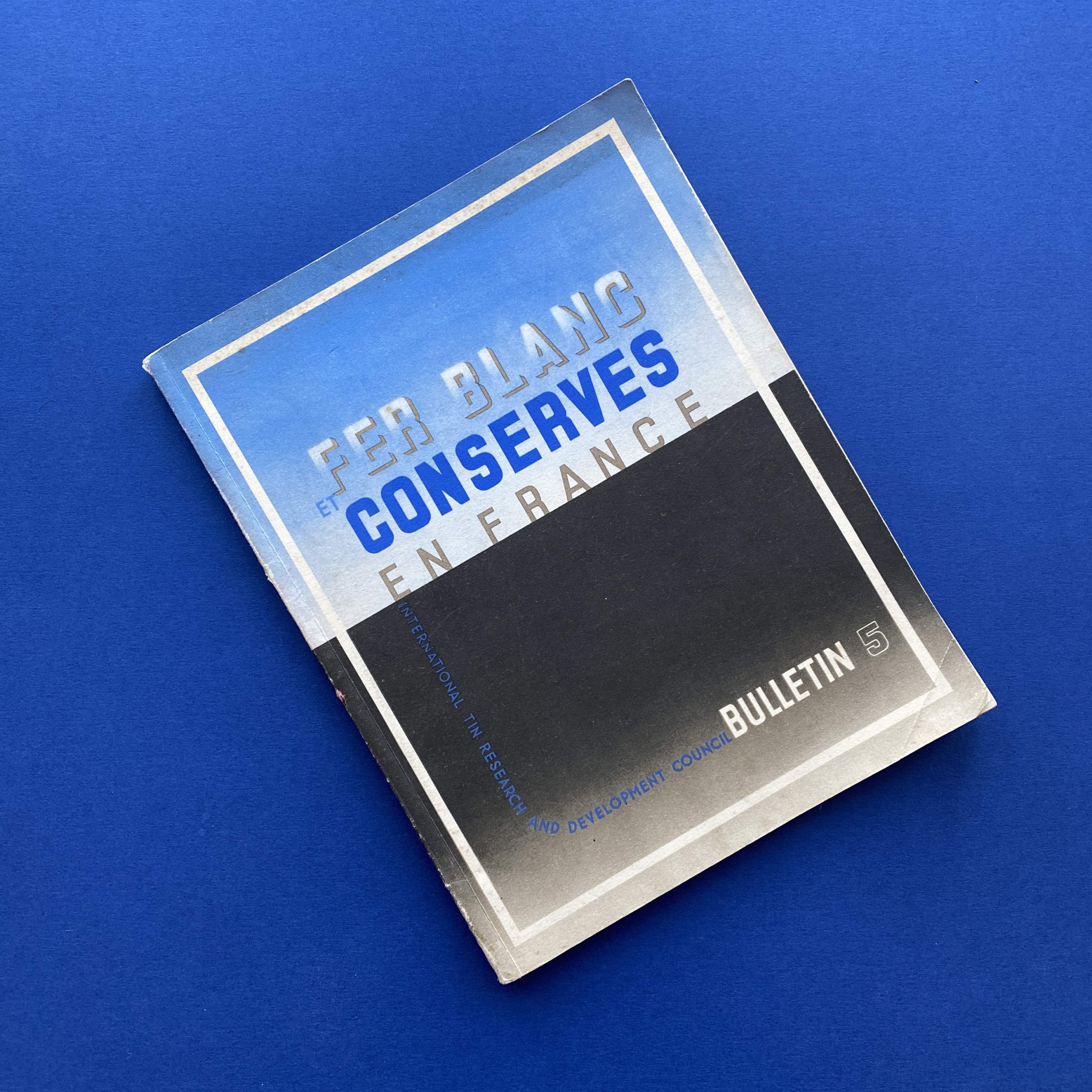 Fer blanc et conserves en France #5, International tin research and development council/ OTUA, Printed in Great Britain, February 1937, 21 x 27 cm, 96 pp. The is one insert. Copy in good condition, covers show some signs of wear.