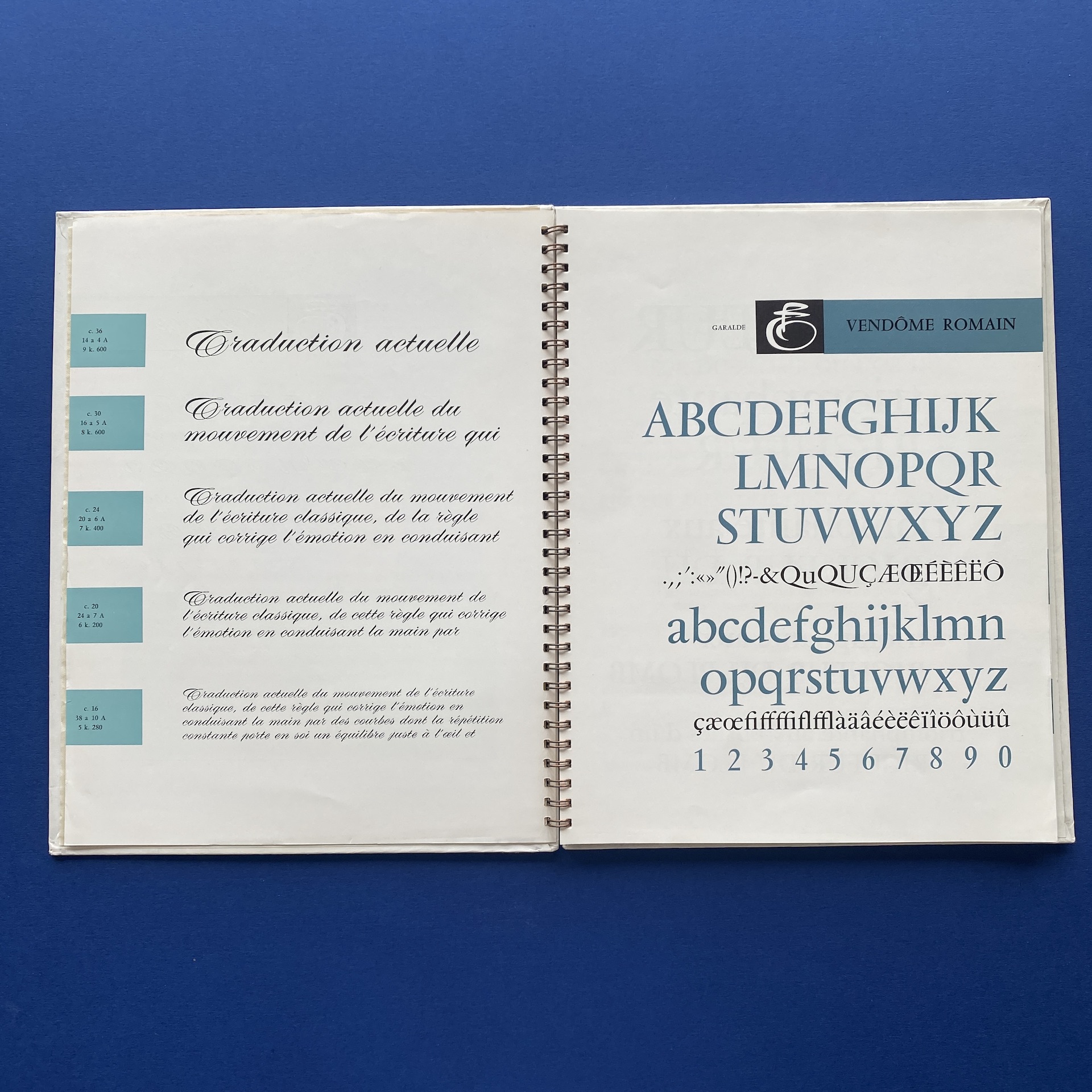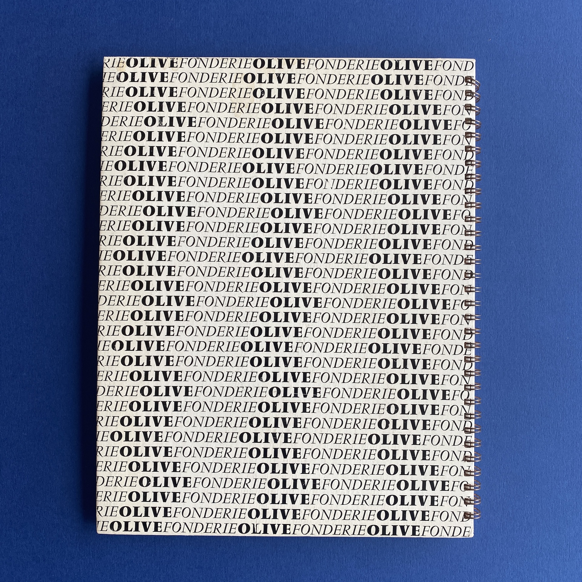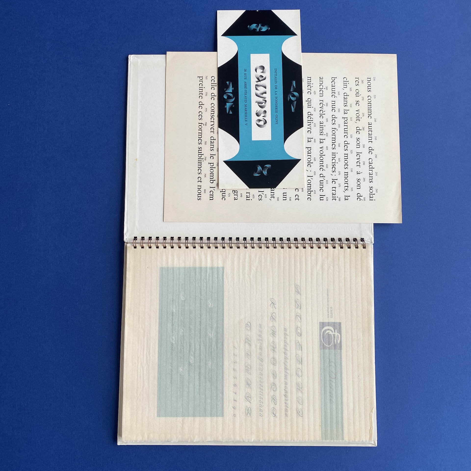 Fonderie olive, Séries récentes, Marseille, Fonderie Olive, 1960s, 23 x 29 cm. Gorgeous specimen book in very good condition. Two inserts: a leaflet of Calypso initials and a calibration table. Metal spiral binding.