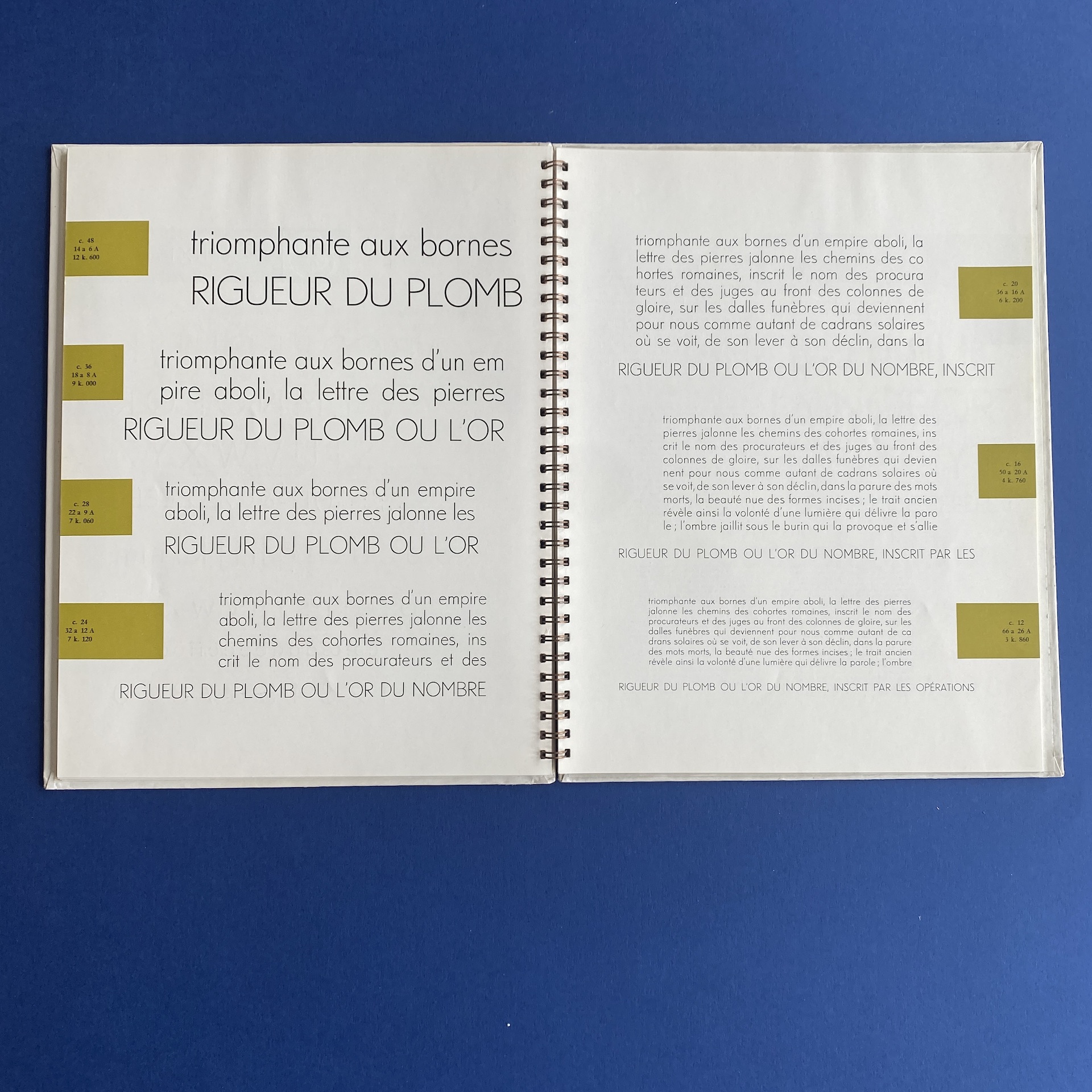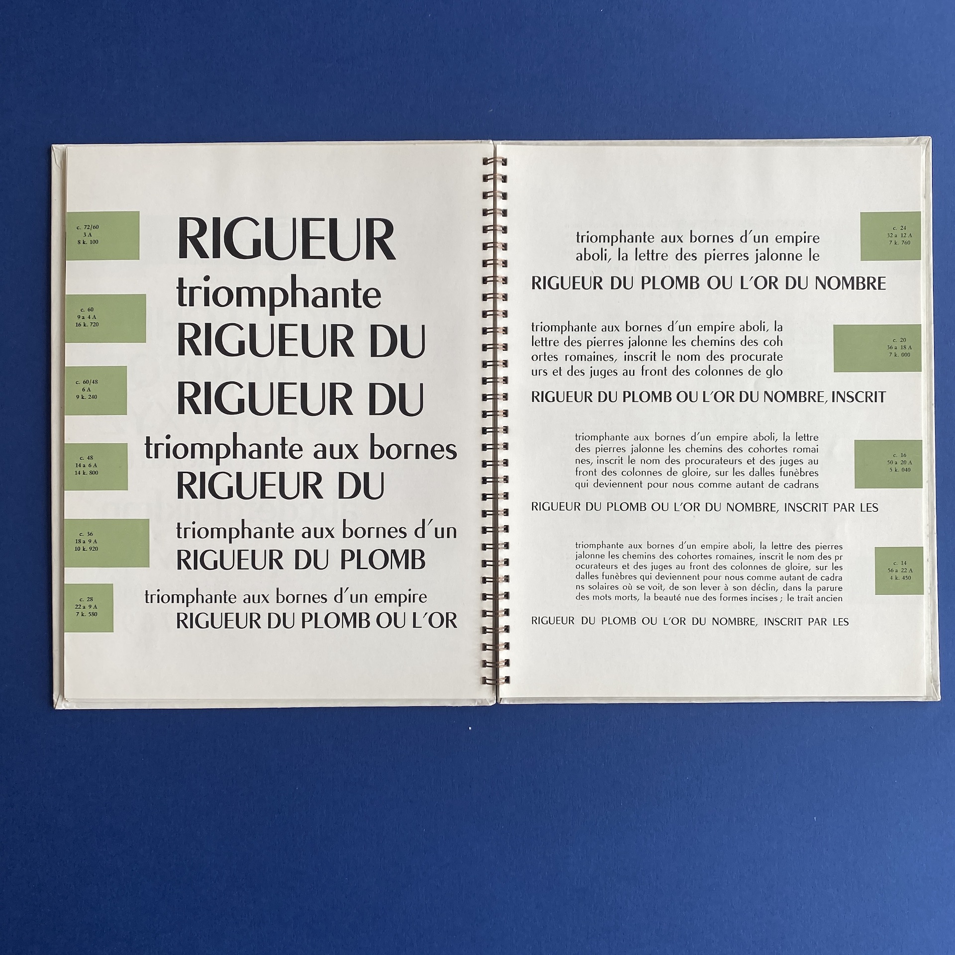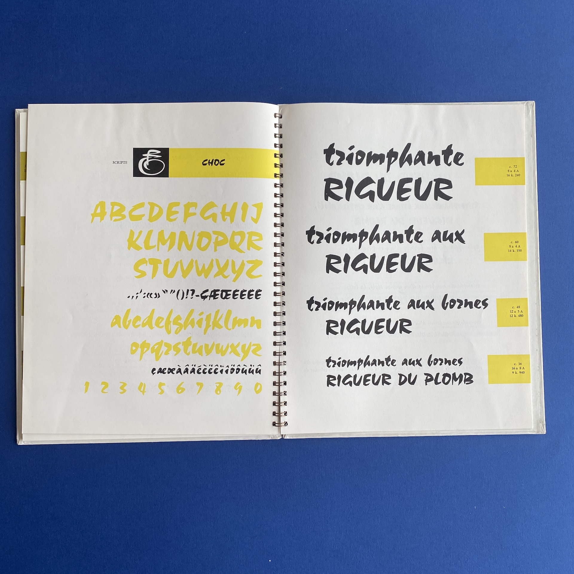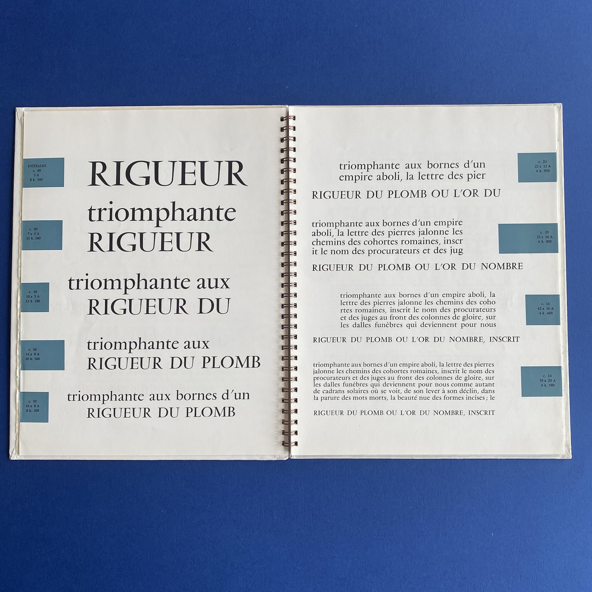 Fonderie olive, Séries récentes, Marseille, Fonderie Olive, 1960s, 23 x 29 cm. Gorgeous specimen book in very good condition. Two inserts: a leaflet of Calypso initials and a calibration table. Metal spiral binding.