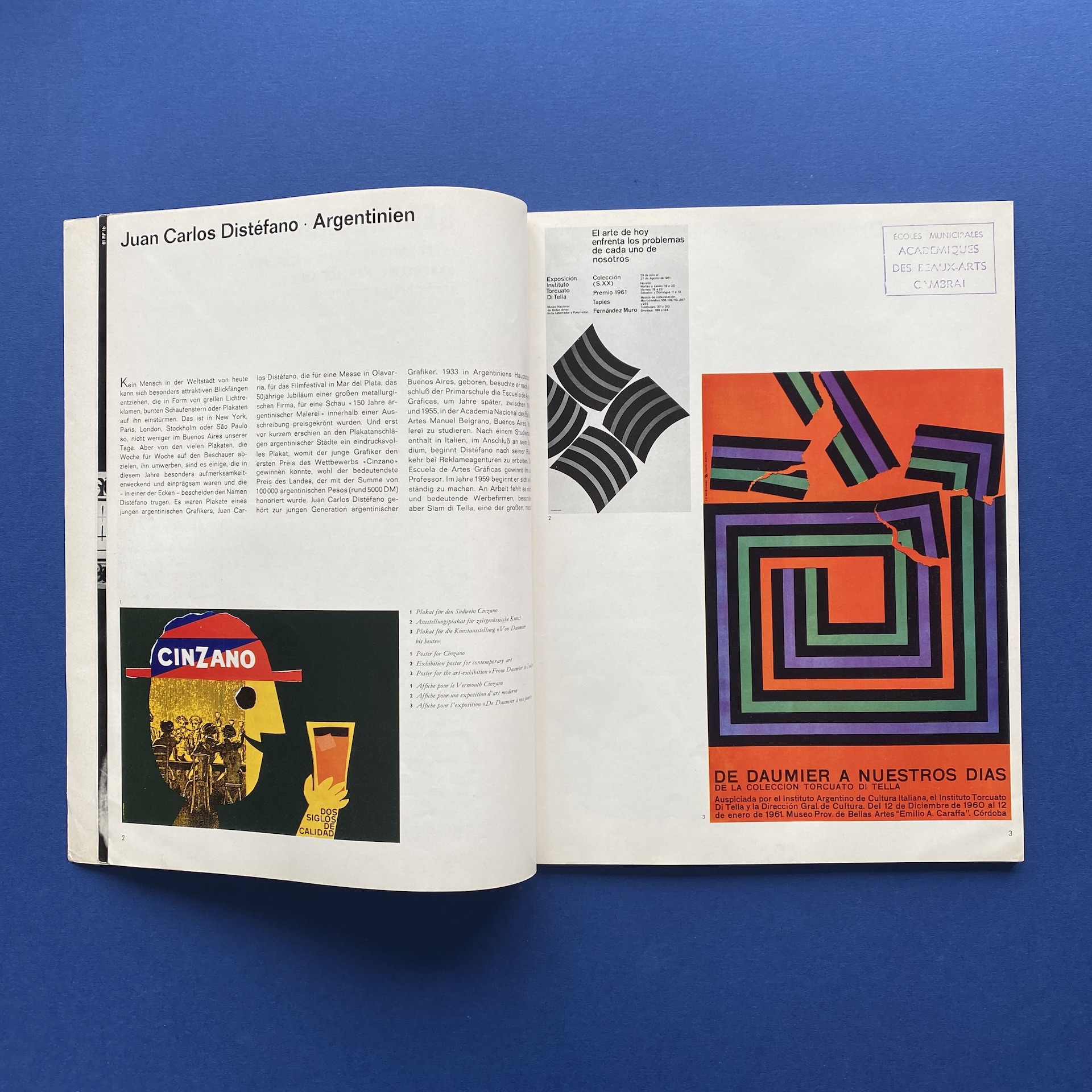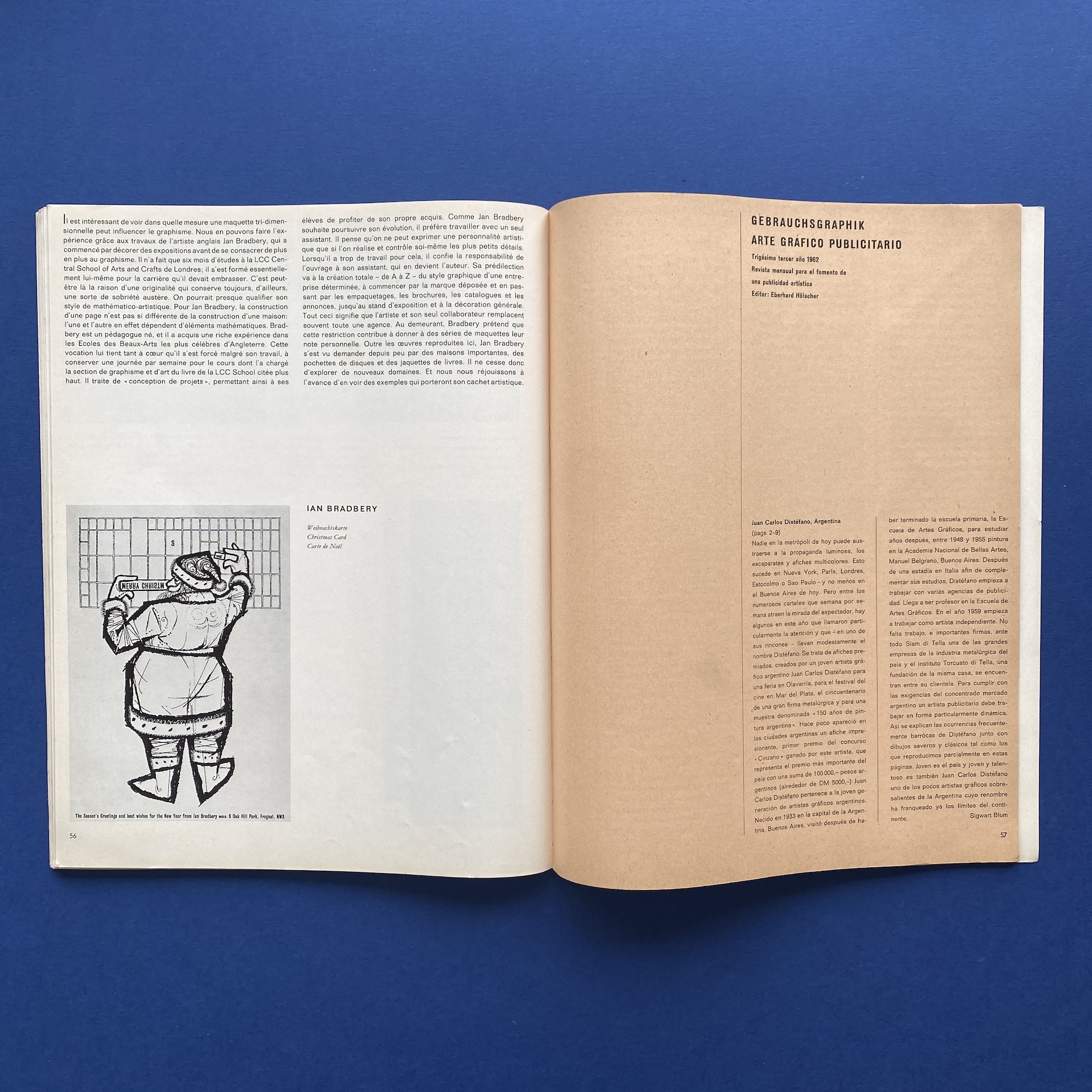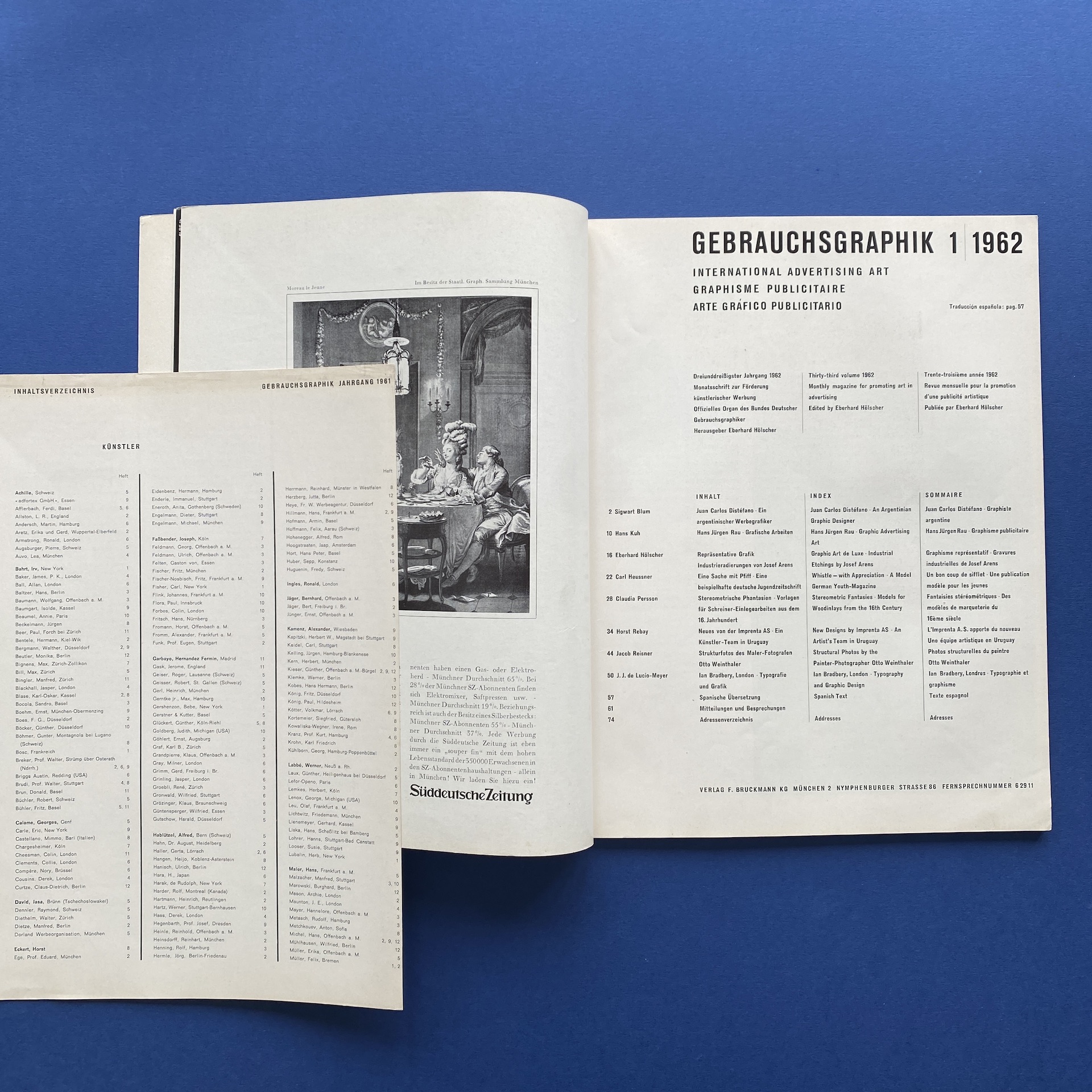 Gebrauchsgraphik 1, International advertising art, München, Eberhard Hölscher, Jan 1962, 23 x 30 cm. Lang: Ger., Eng., Fre. & Spa. Cover by Toni. Ex-library copy: “Beaux-arts de Cambrai” stamp, piece of kraft paper glued inside cover.