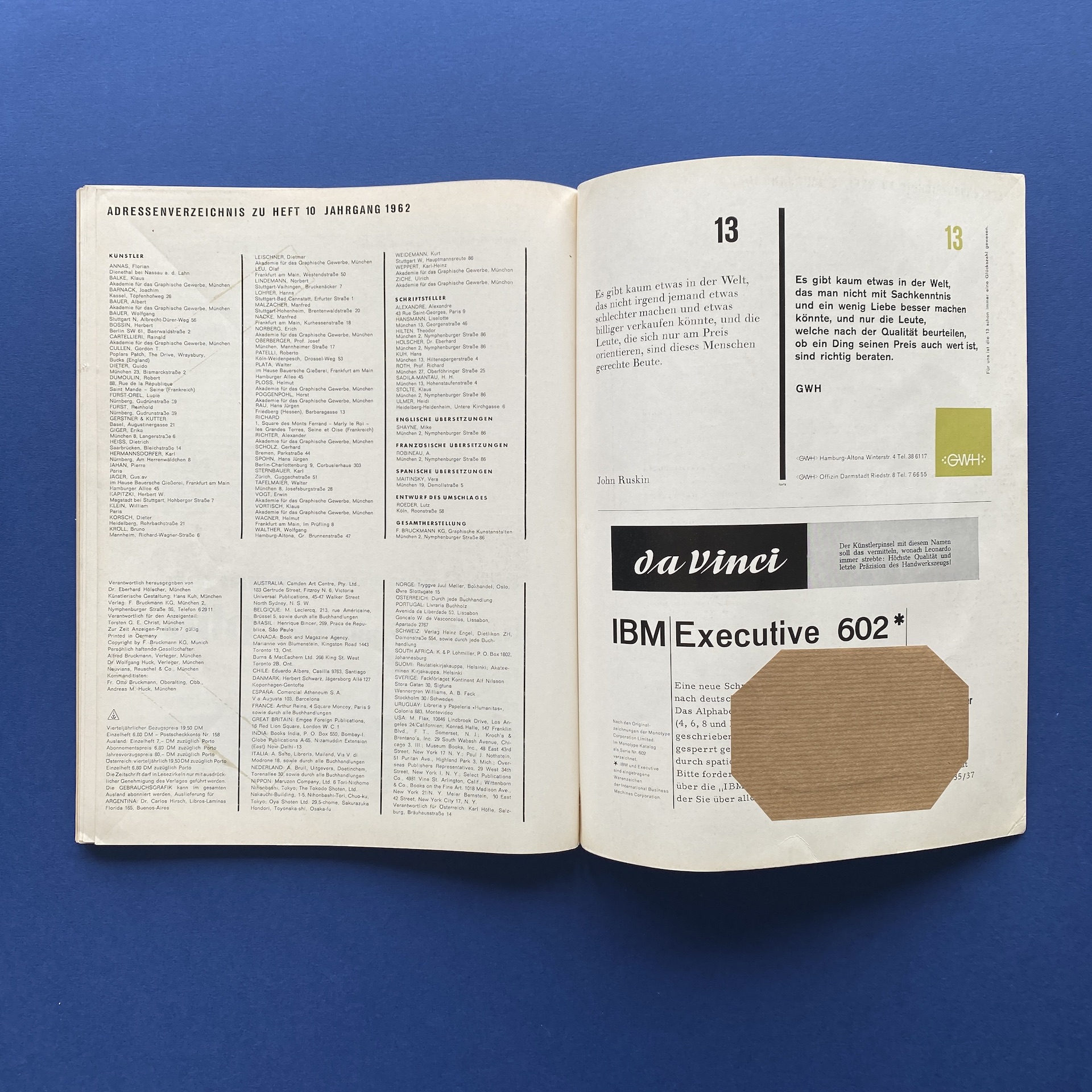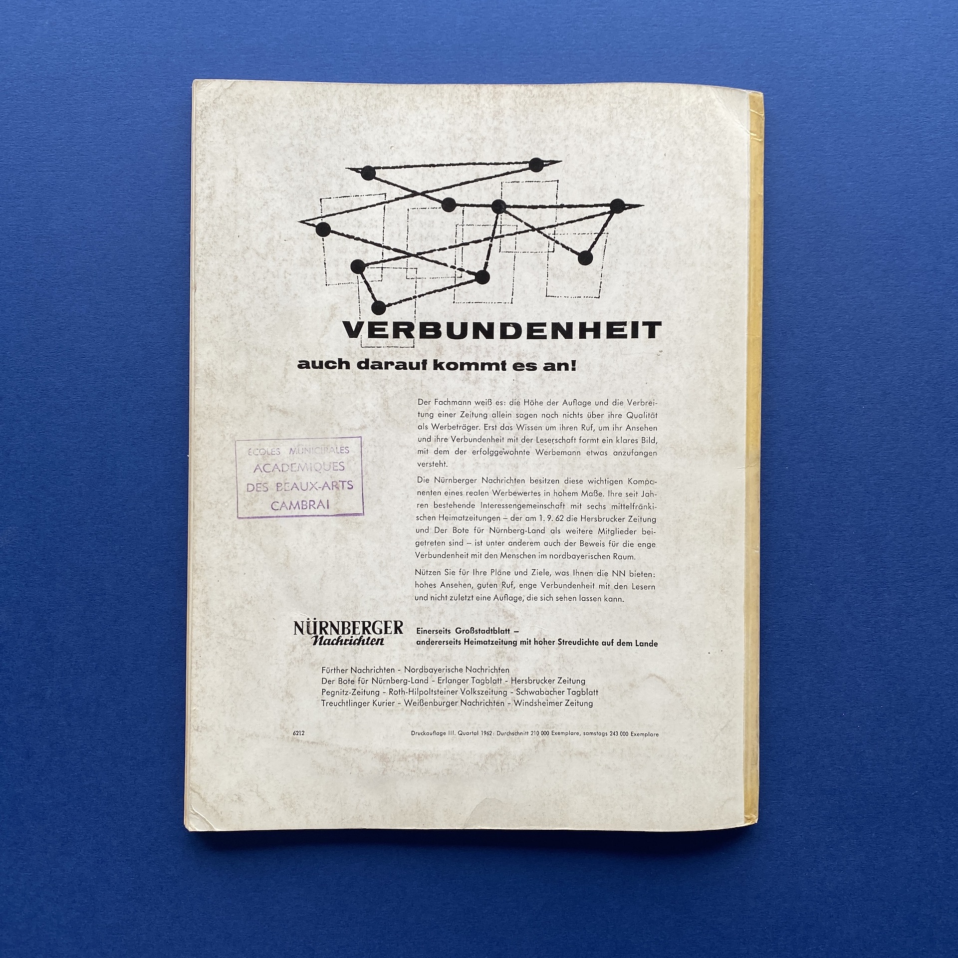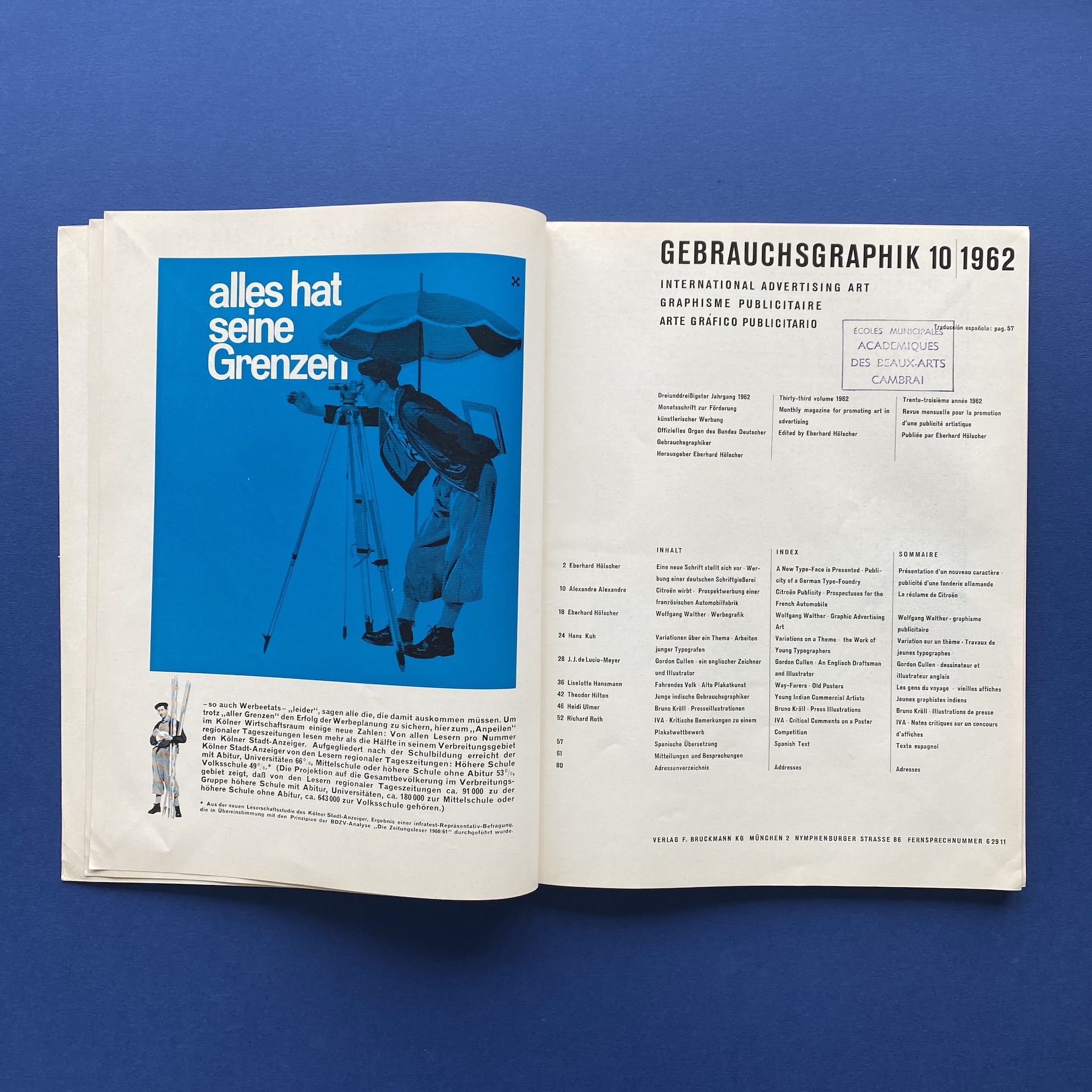 Gebrauchsgraphik 10, International advertising art, München, Eberhard Hölscher, Oct 1962, 23 x 30 cm. Lang: Ger., Eng., Fre. & Spa. Ex-library copy: “beaux-arts de Cambrai” stamp, kraft paper glued inside & tape on the spine.