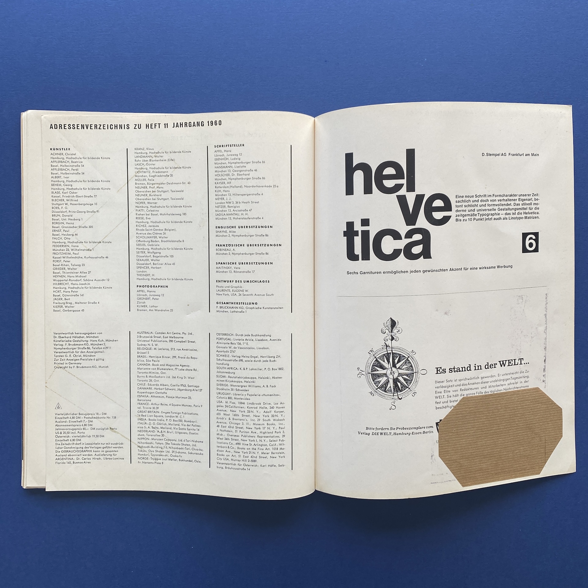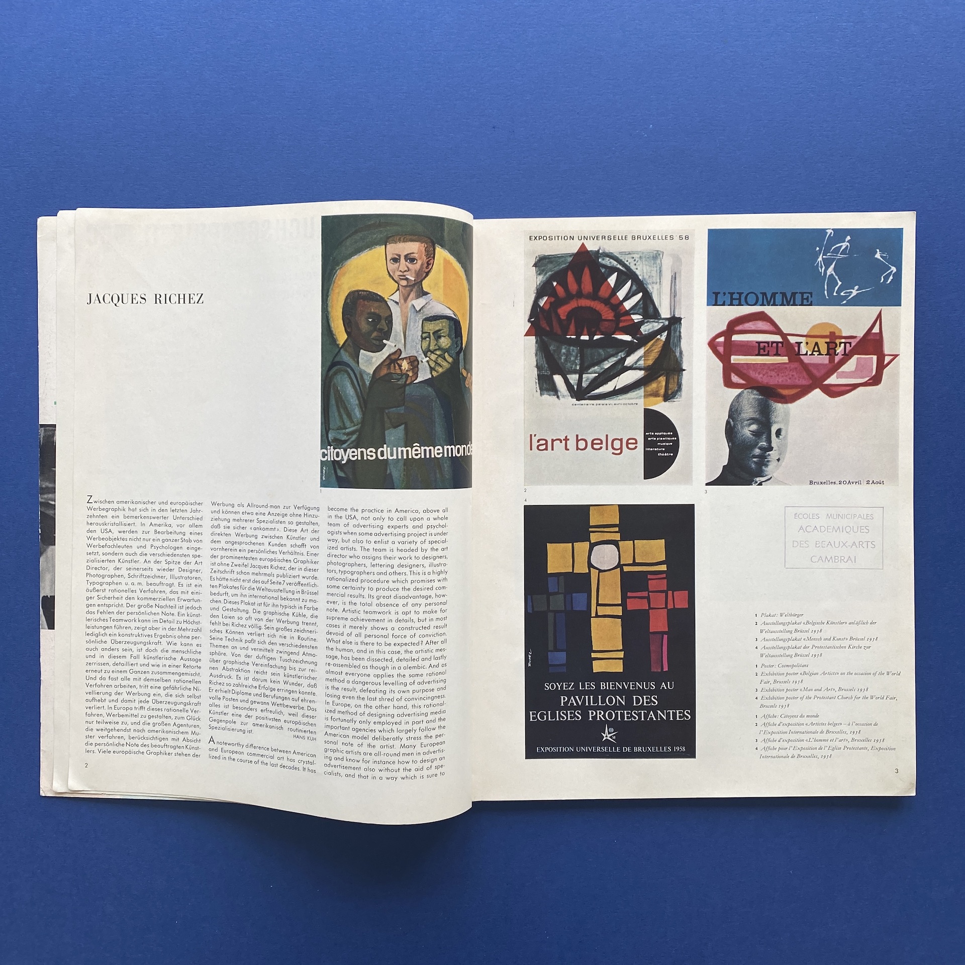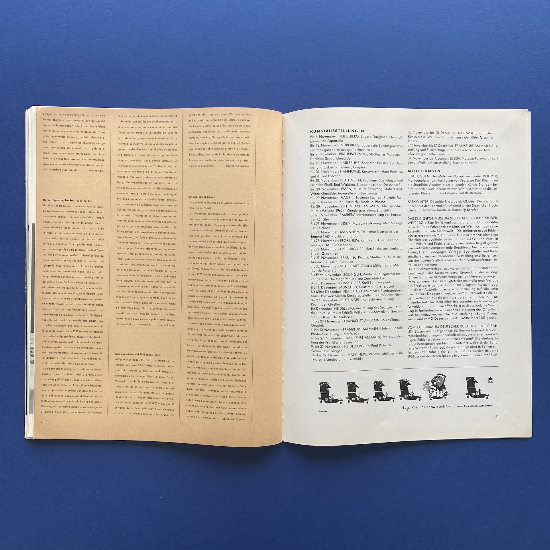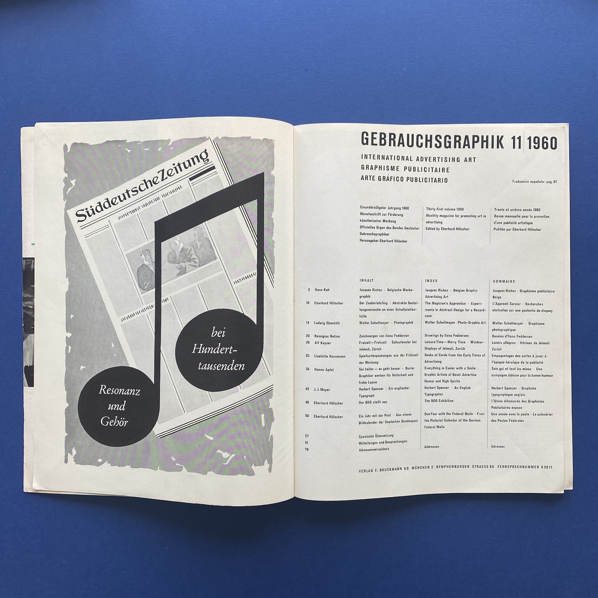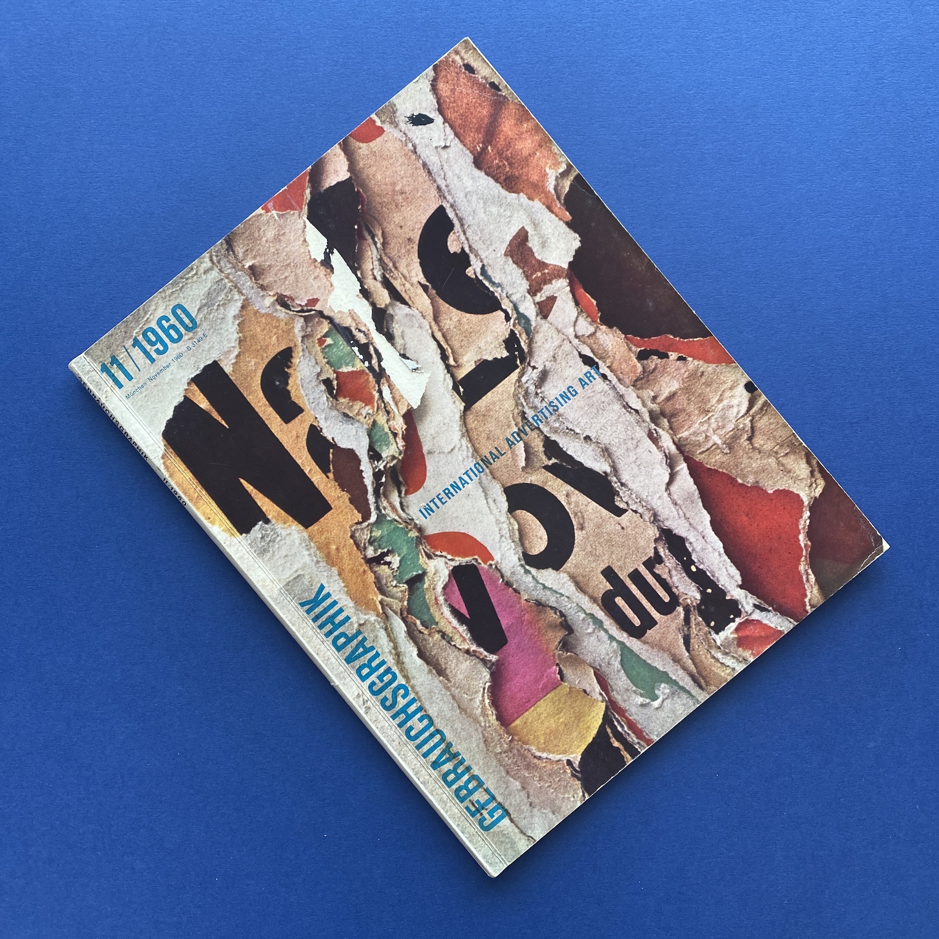 Gebrauchsgraphik 11, International advertising art, München, Eberhard Hölscher, Nov 1960, 23 x 30 cm. Lang: Ger., Eng., Fre. & Spa. Ex-library copy: “Beaux-arts de Cambrai” stamp, piece of kraft paper glued inside cover.