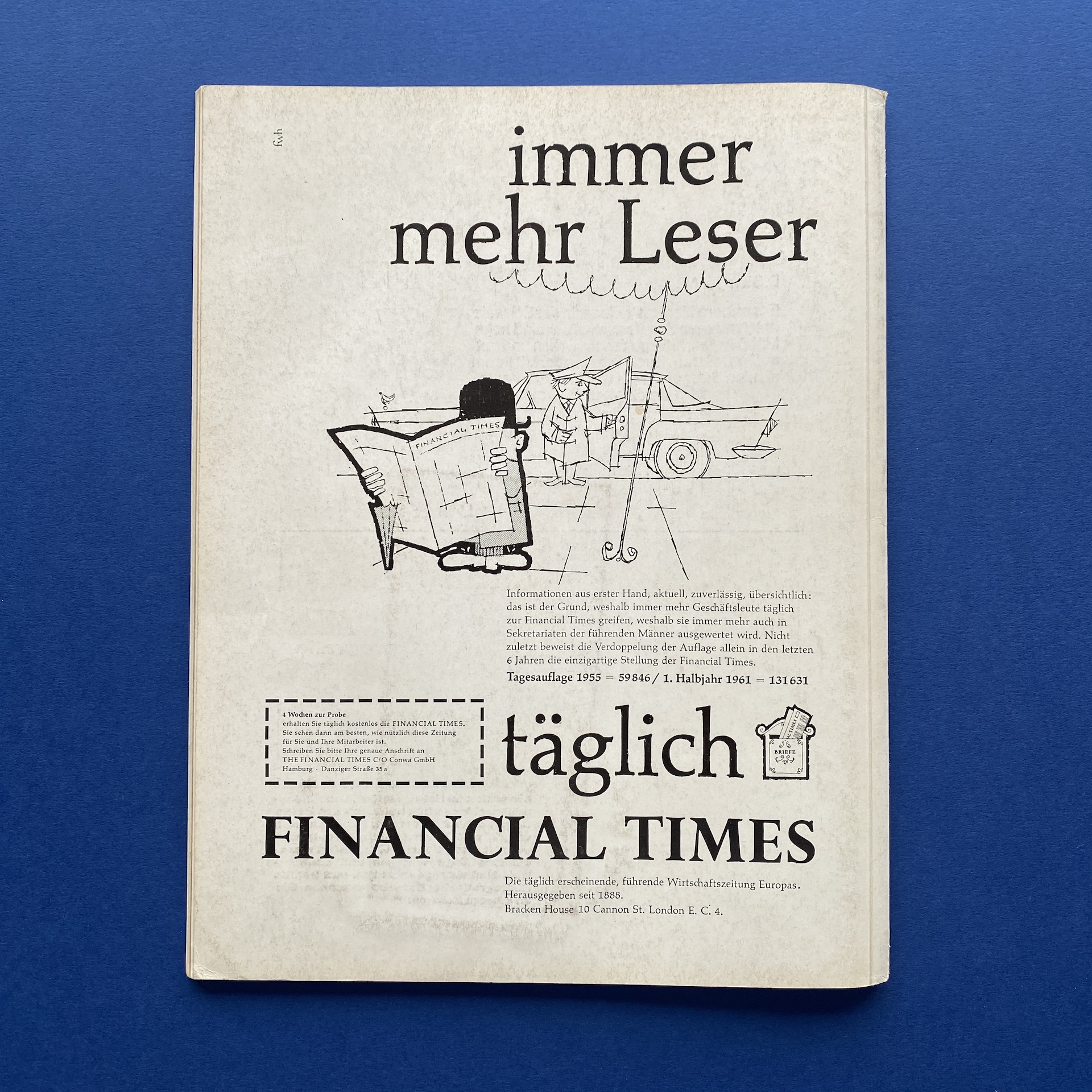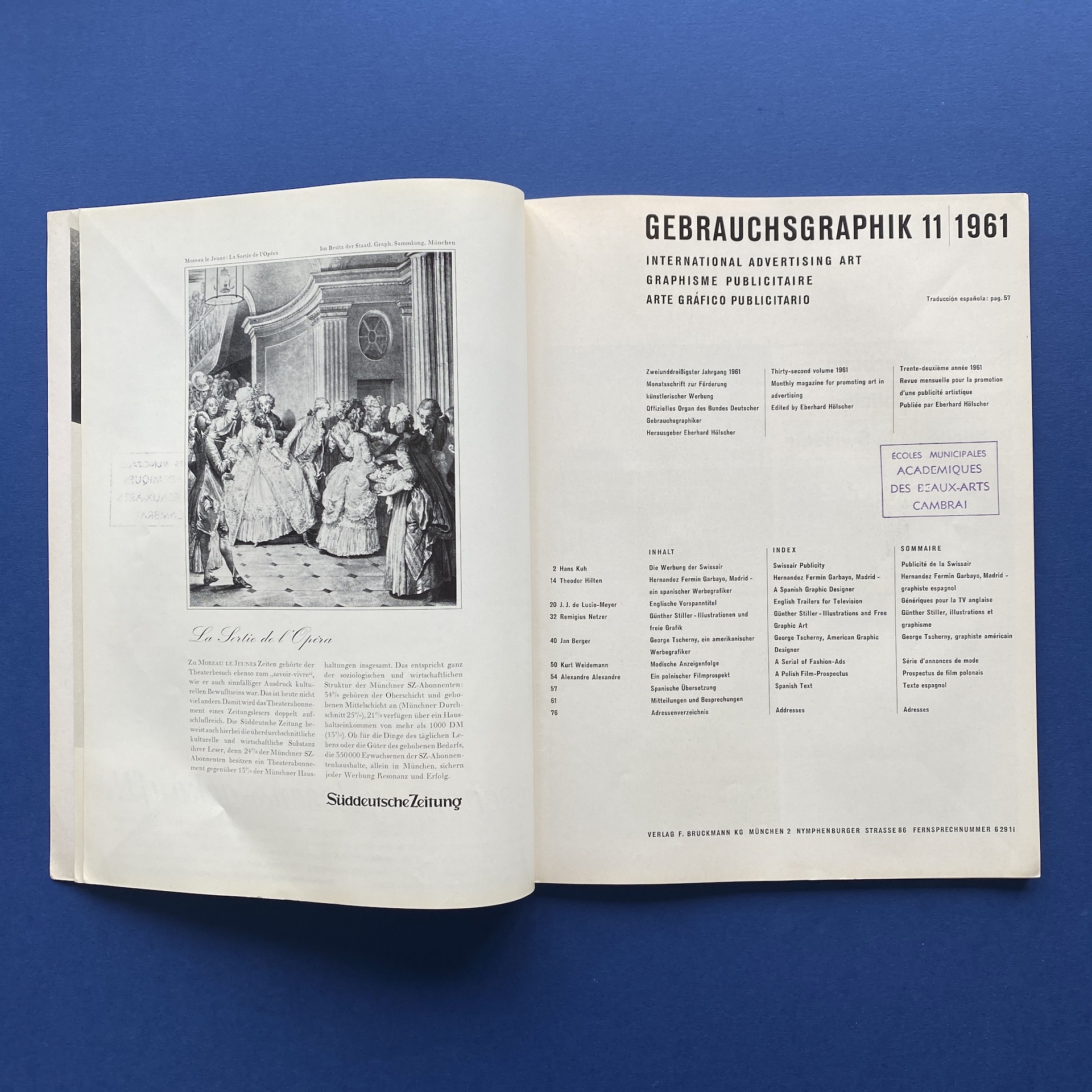 Gebrauchsgraphik 11, International advertising art, München, Eberhard Hölscher, Nov 1961, 23 x 30 cm. Lang: Ger., Eng., Fre. & Spa. Cover by Ernst Winkel. Ex-library copy: “Beaux-arts de Cambrai” stamp, piece of kraft paper glued inside.