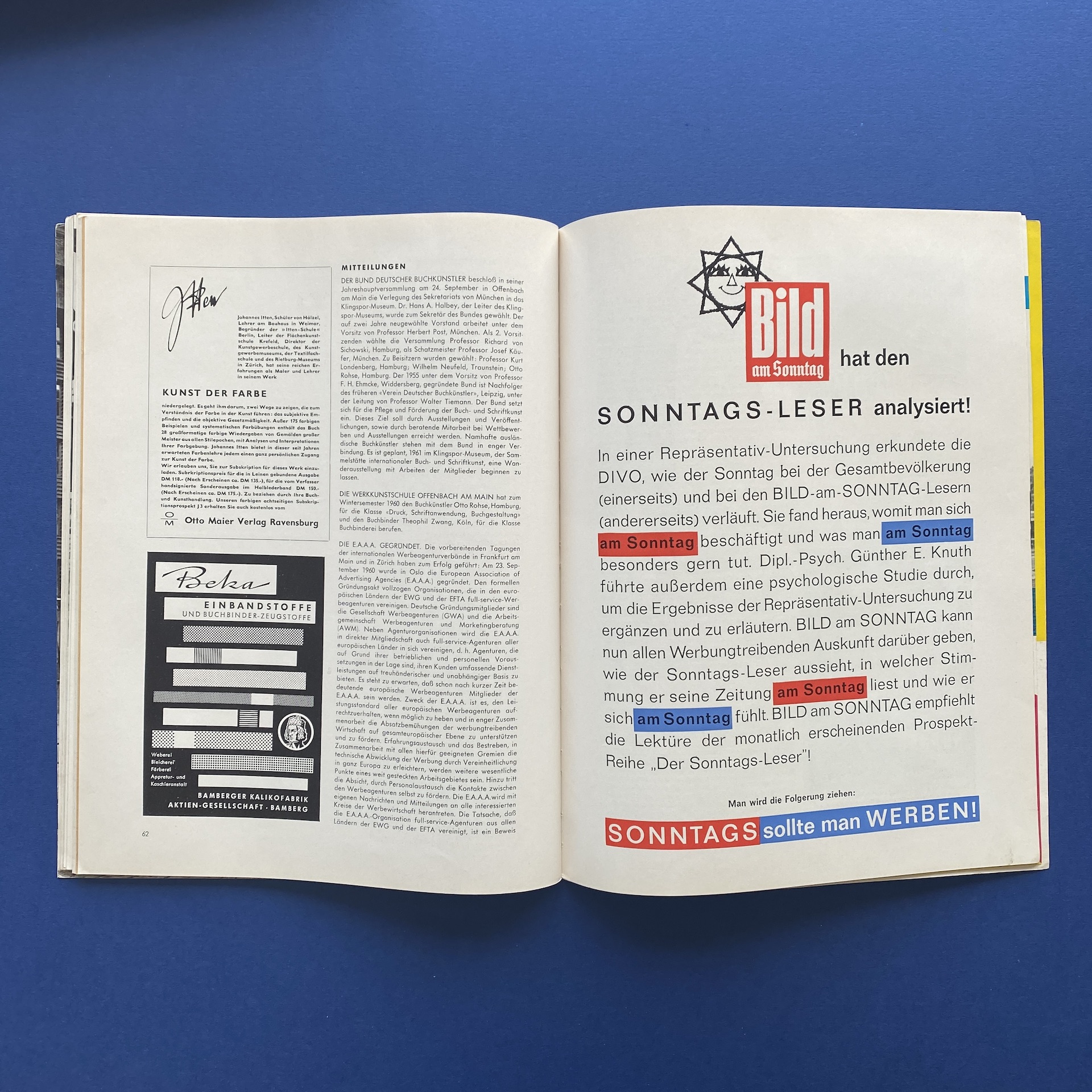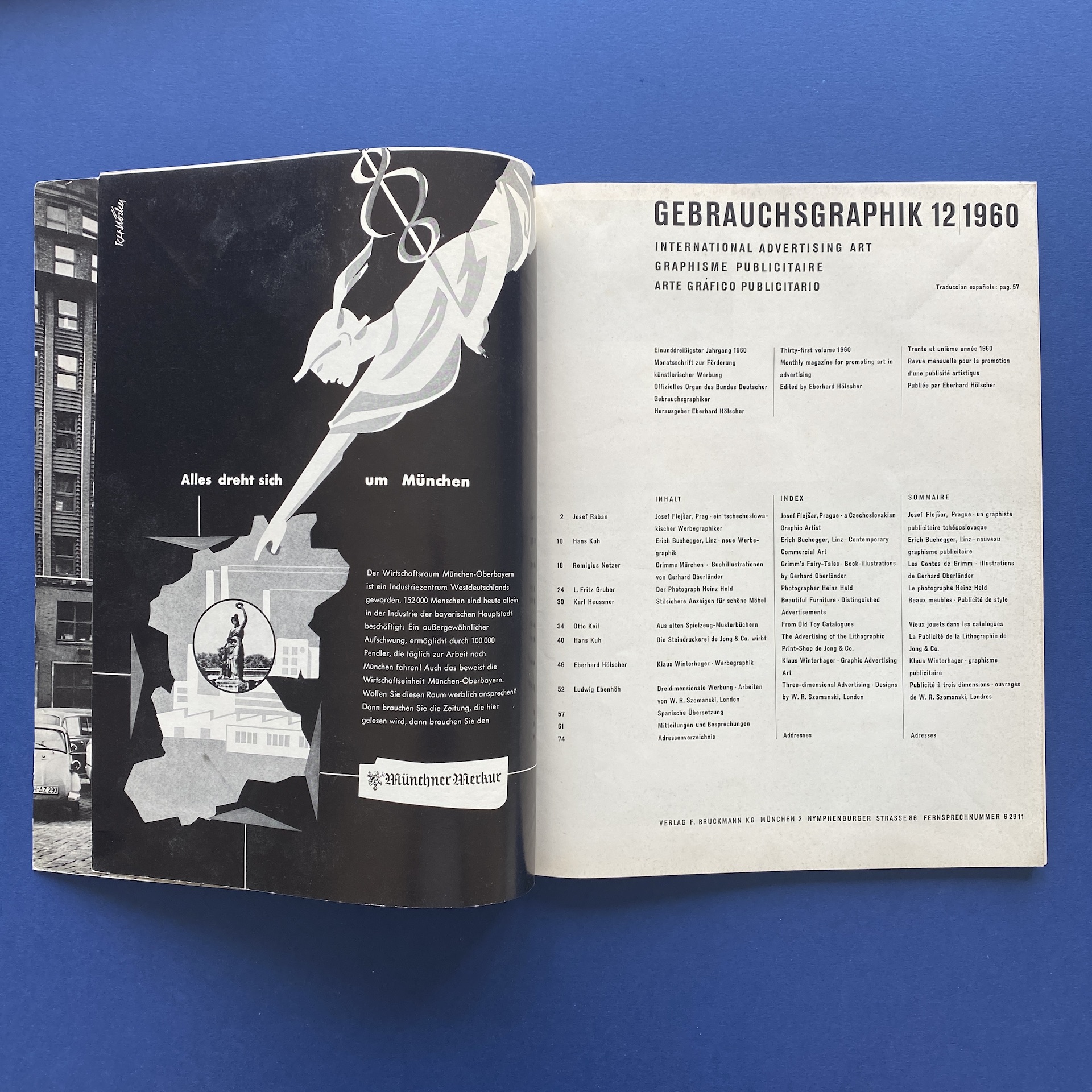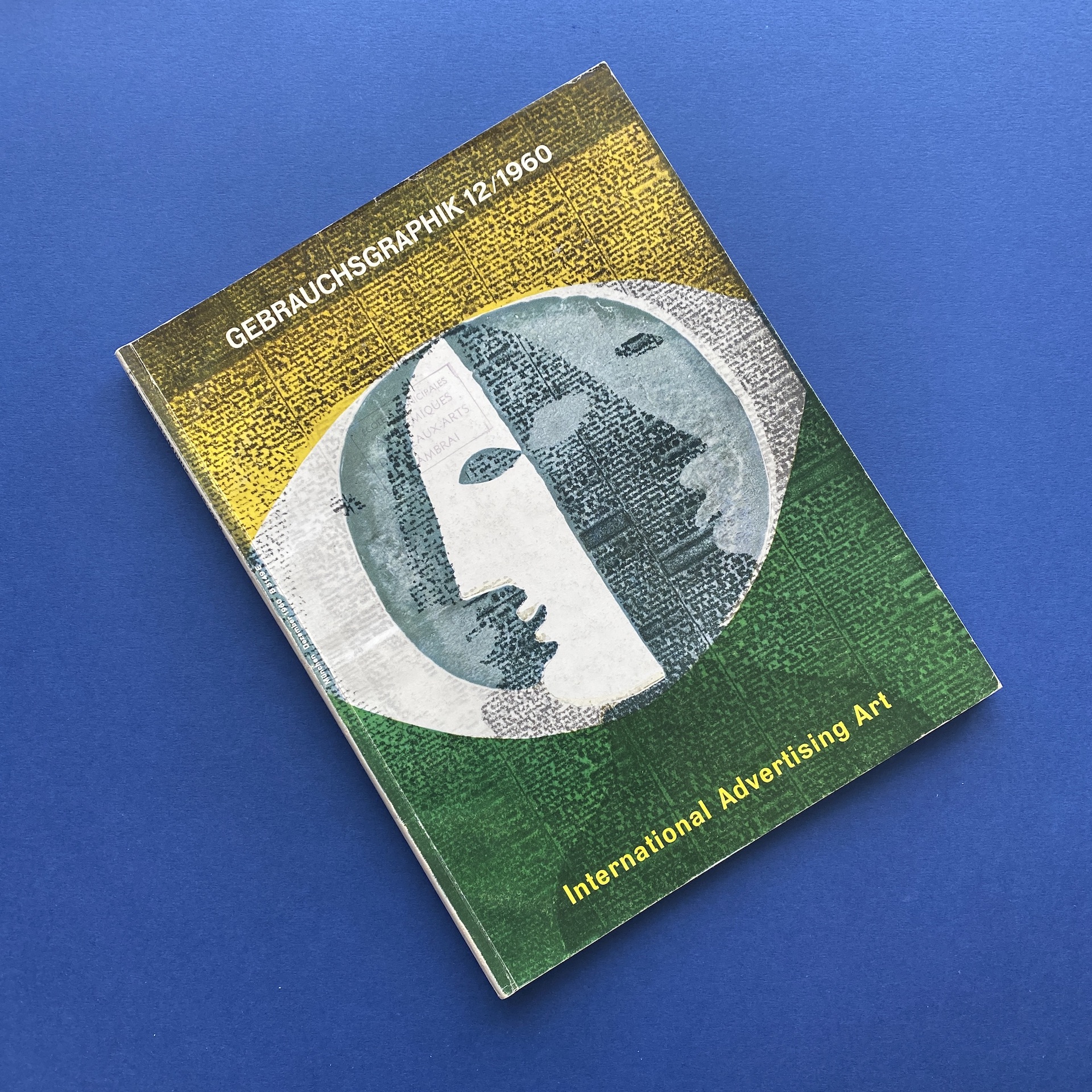 Gebrauchsgraphik 12, International advertising art, München, Eberhard Hölscher, Dec 1960, 23 x 30 cm. Lang: Ger., Eng., Fre. & Spa. Ex-library copy: “Beaux-arts de Cambrai” stamp, piece of kraft paper glued inside cover.