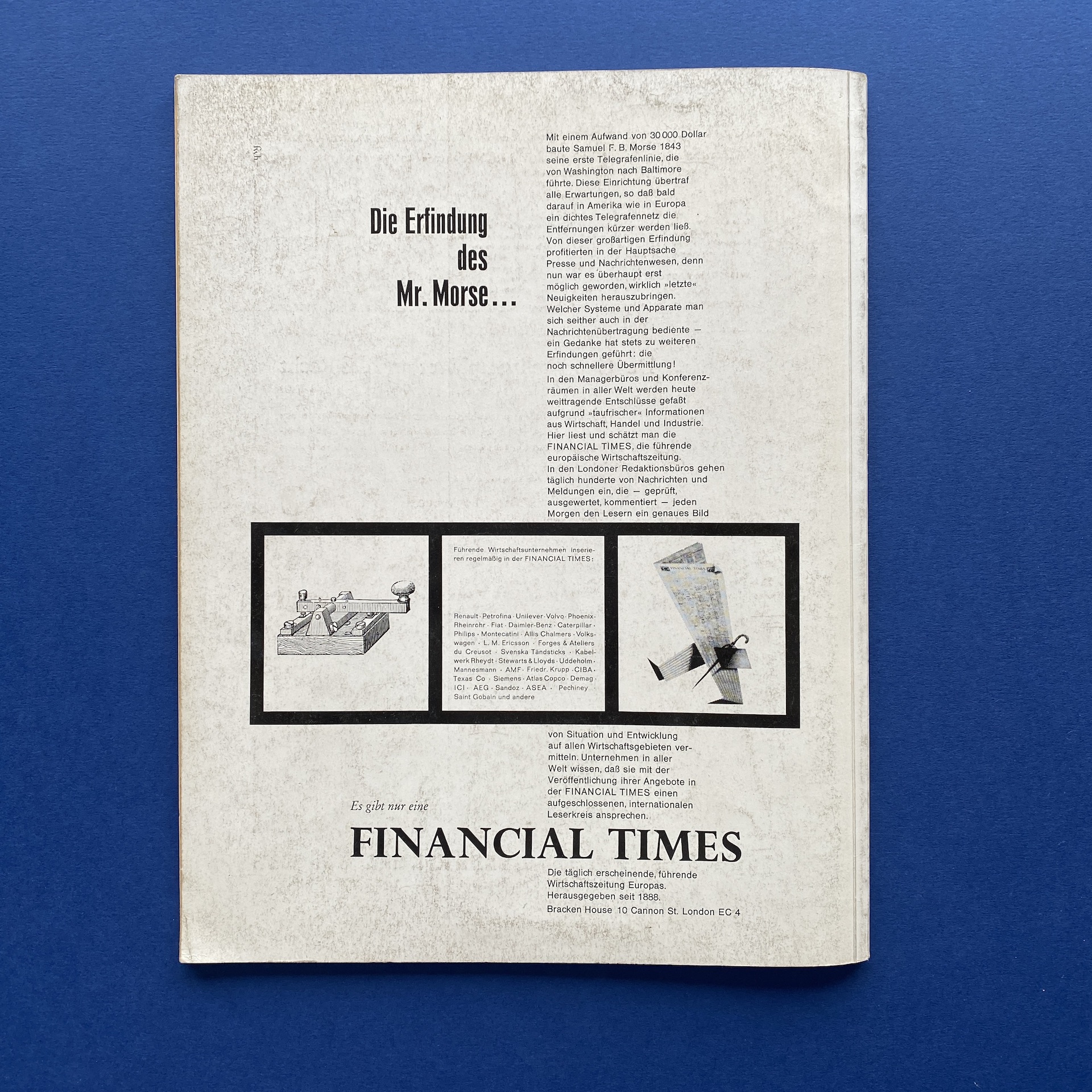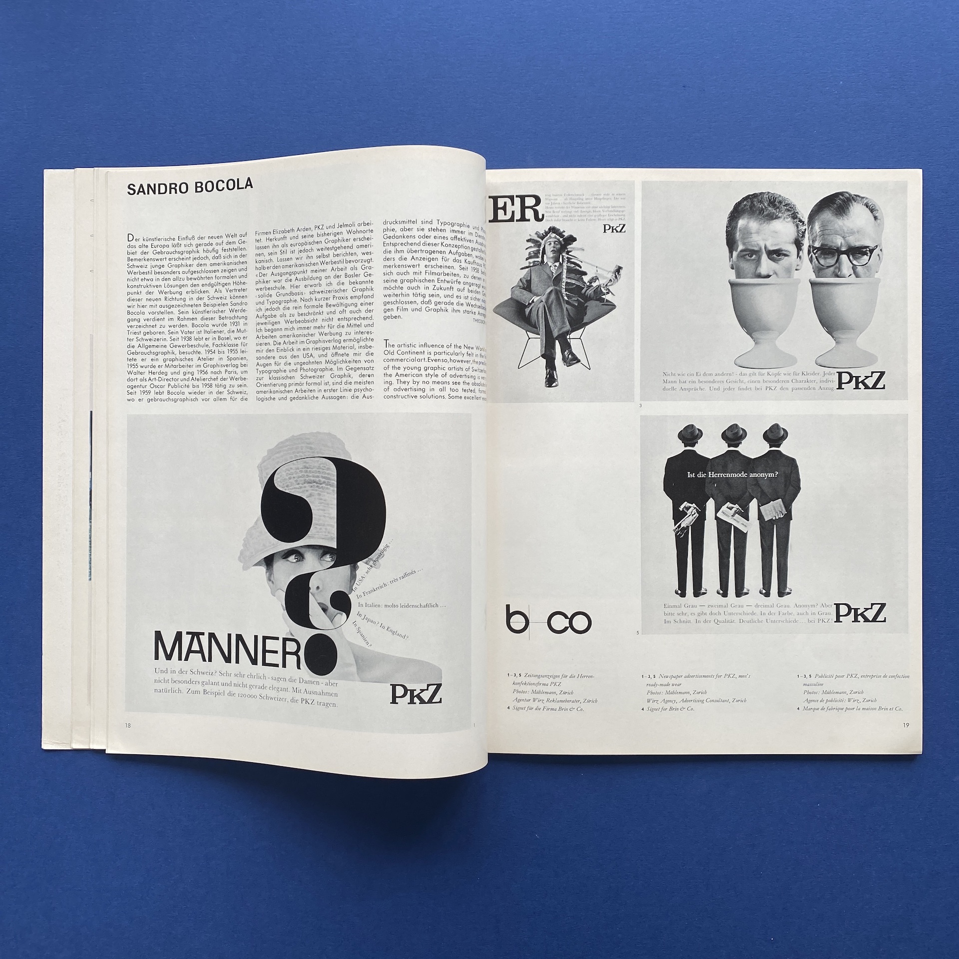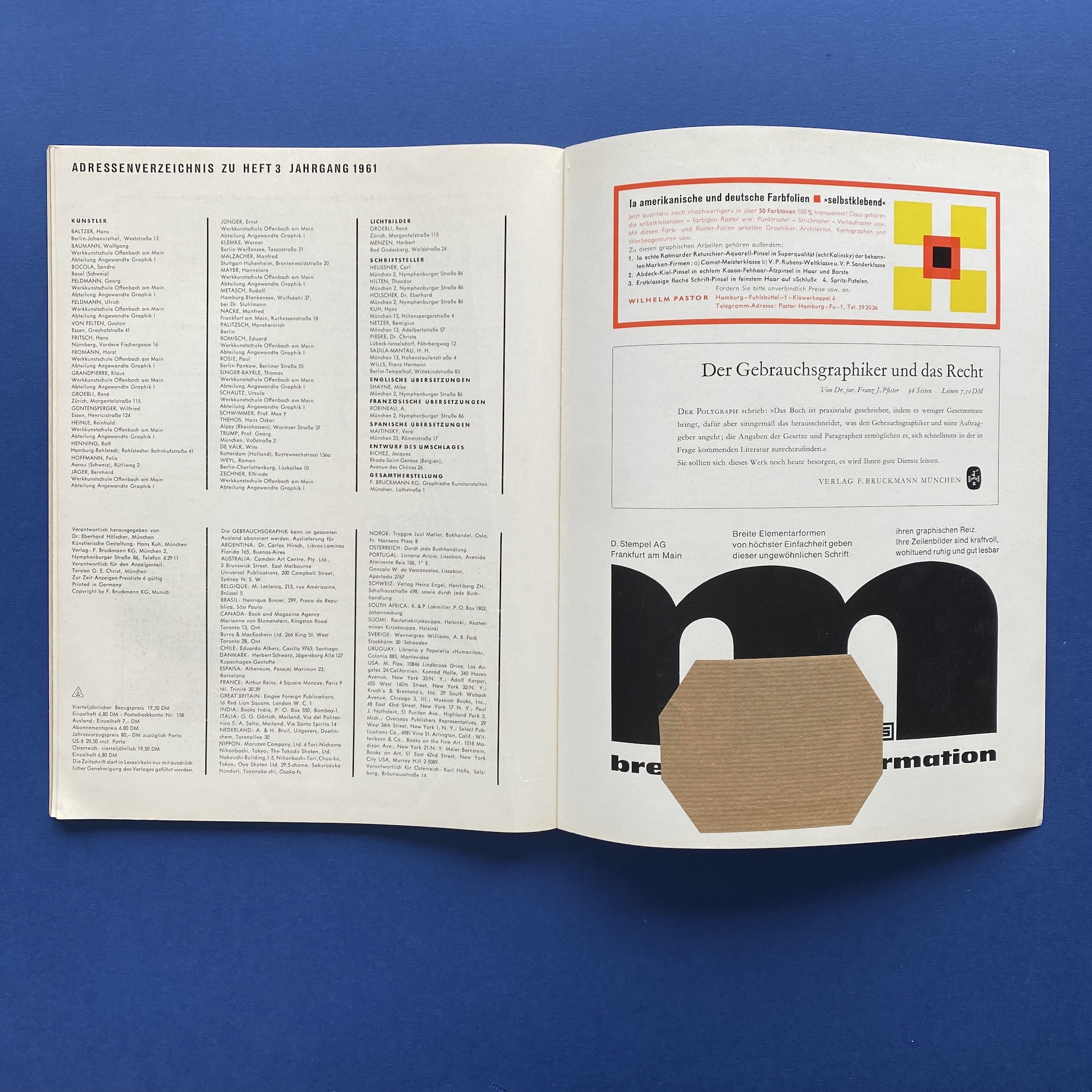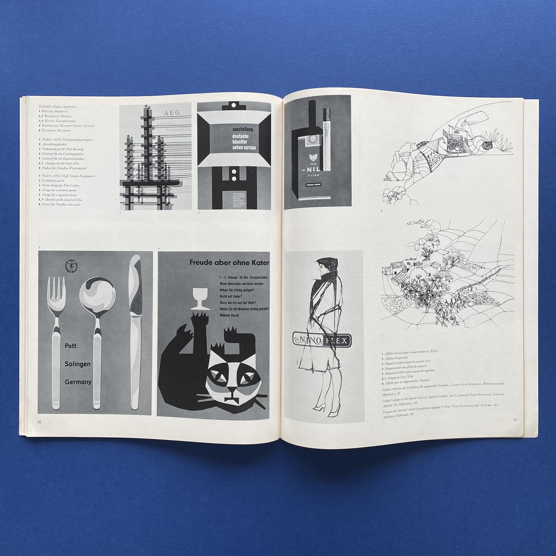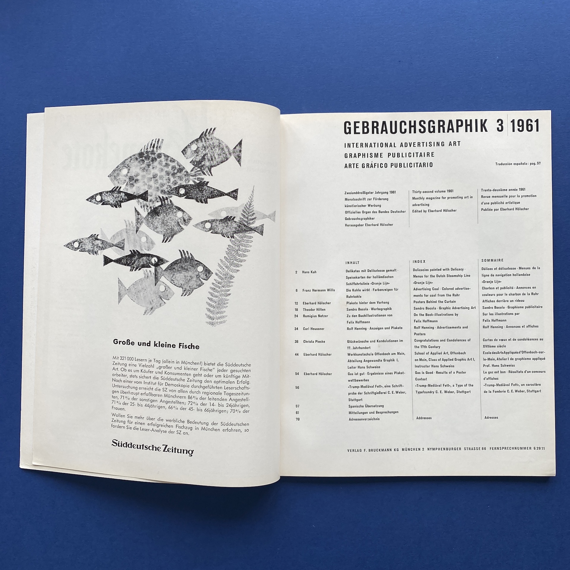 Gebrauchsgraphik 3, International advertising art, München, Eberhard Hölscher, March 1961, 23 x 30 cm. Lang: Ger., Eng., Fre. & Spa. Ex-library copy: “Beaux-arts de Cambrai” stamp, piece of kraft paper glued inside cover.