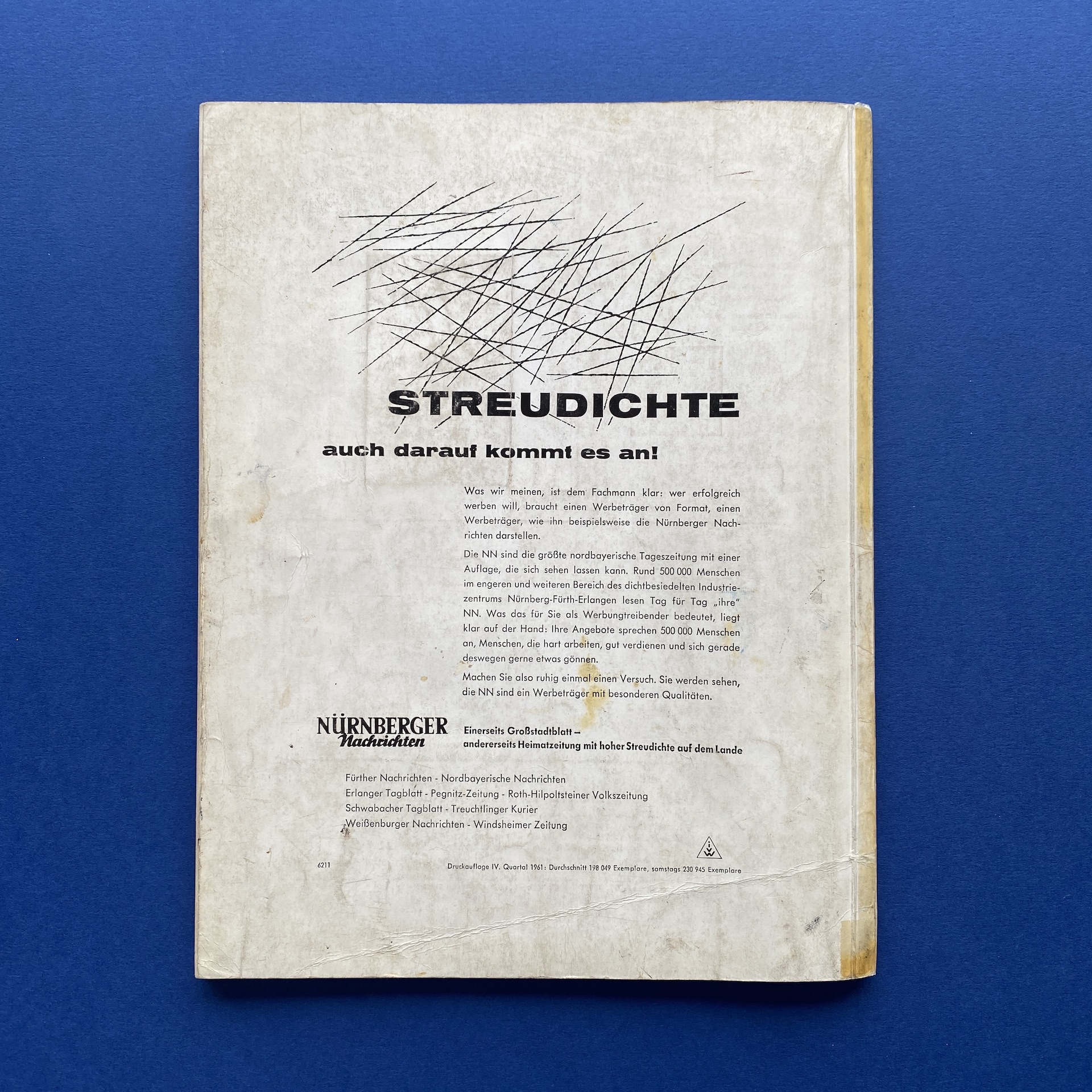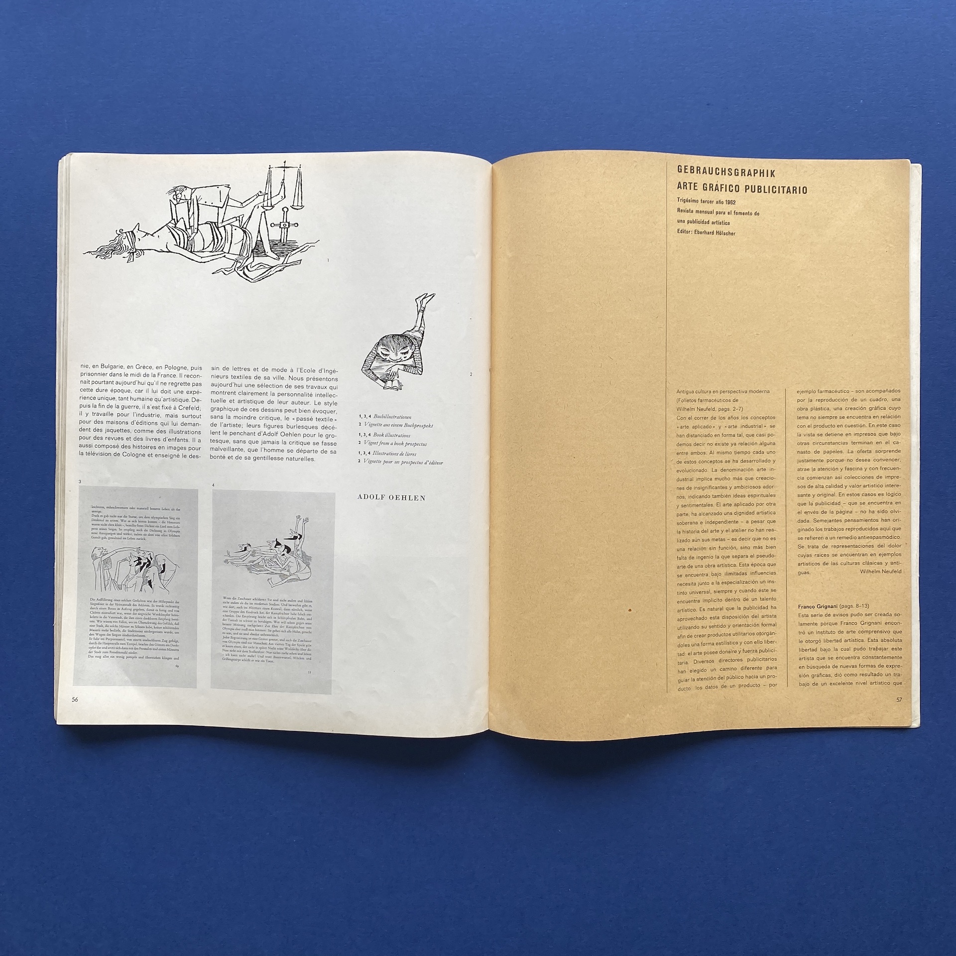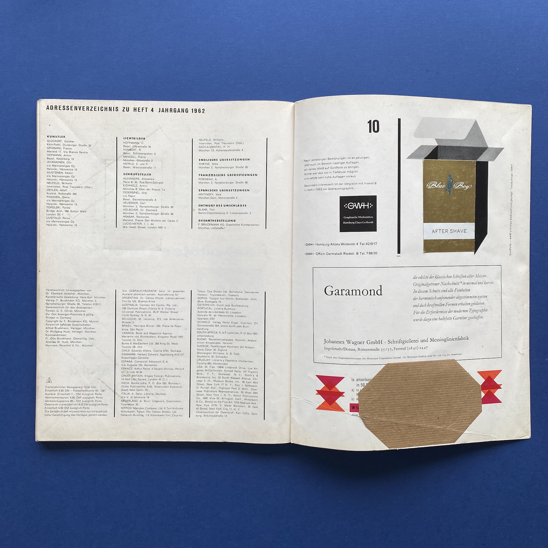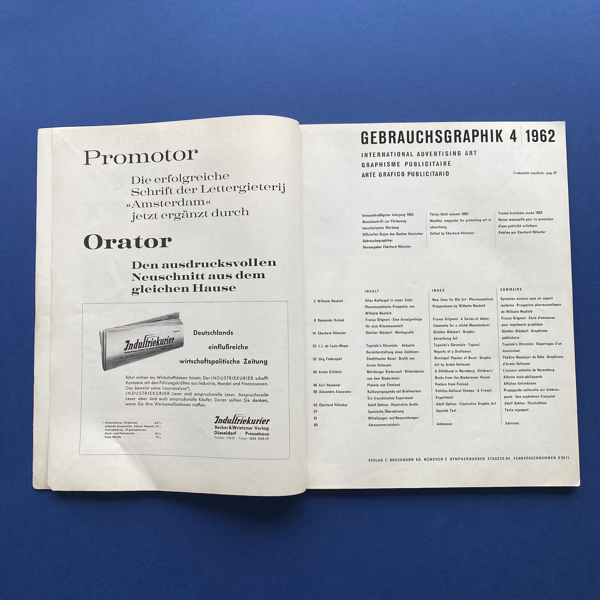 Gebrauchsgraphik 4, International advertising art, München, Eberhard Hölscher, Apr 1962, 23 x 30 cm. Lang: Ger., Eng., Fre. & Spa. Ex-library copy, kraft paper glued on the inside cover. Poor condition: binding fragile and tape on the spine.
