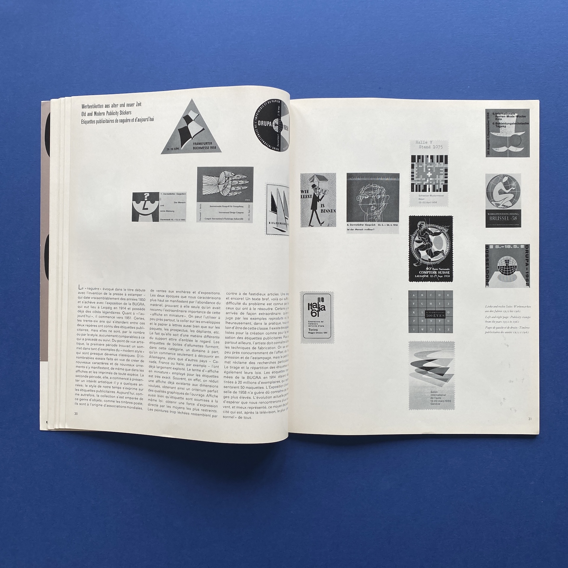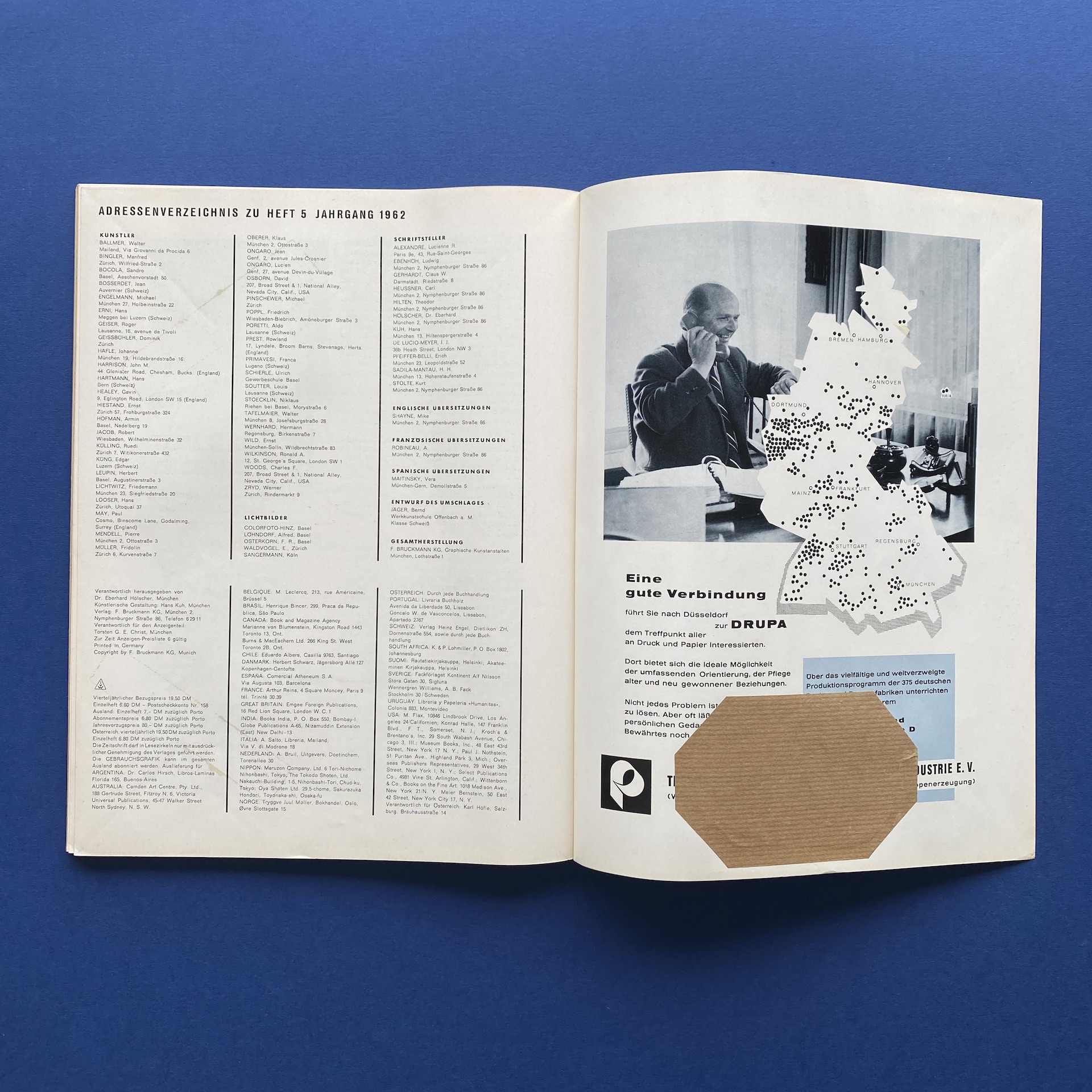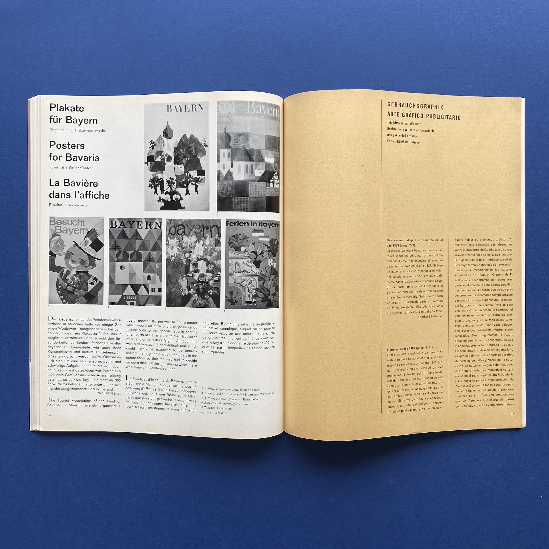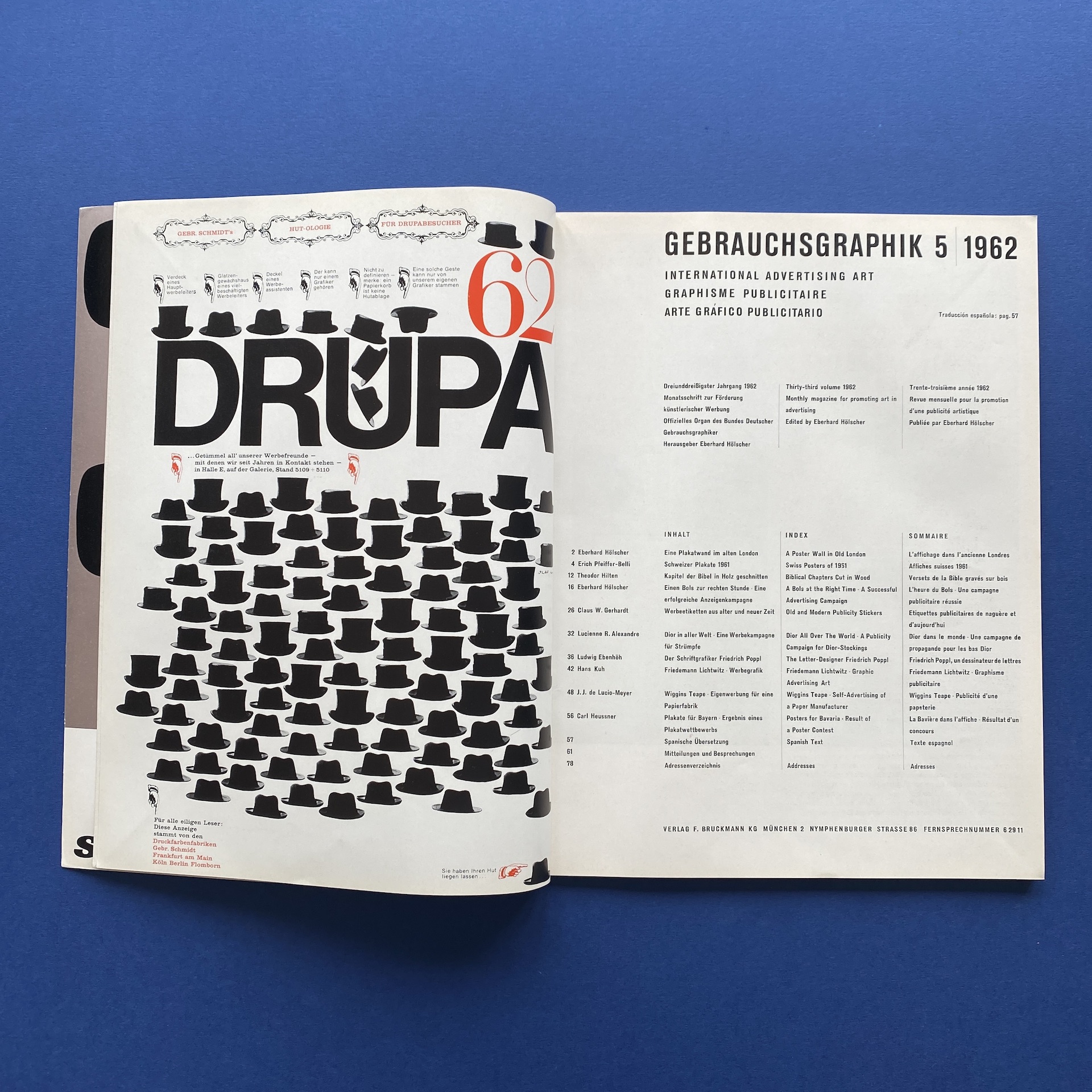 Gebrauchsgraphik 5, International advertising art, München, Eberhard Hölscher, May 1962, 23 x 30 cm. Lang: Ger., Eng., Fre. & Spa. Ex-library copy: “Beaux-arts de Cambrai” stamp, piece of kraft paper glued inside cover.
