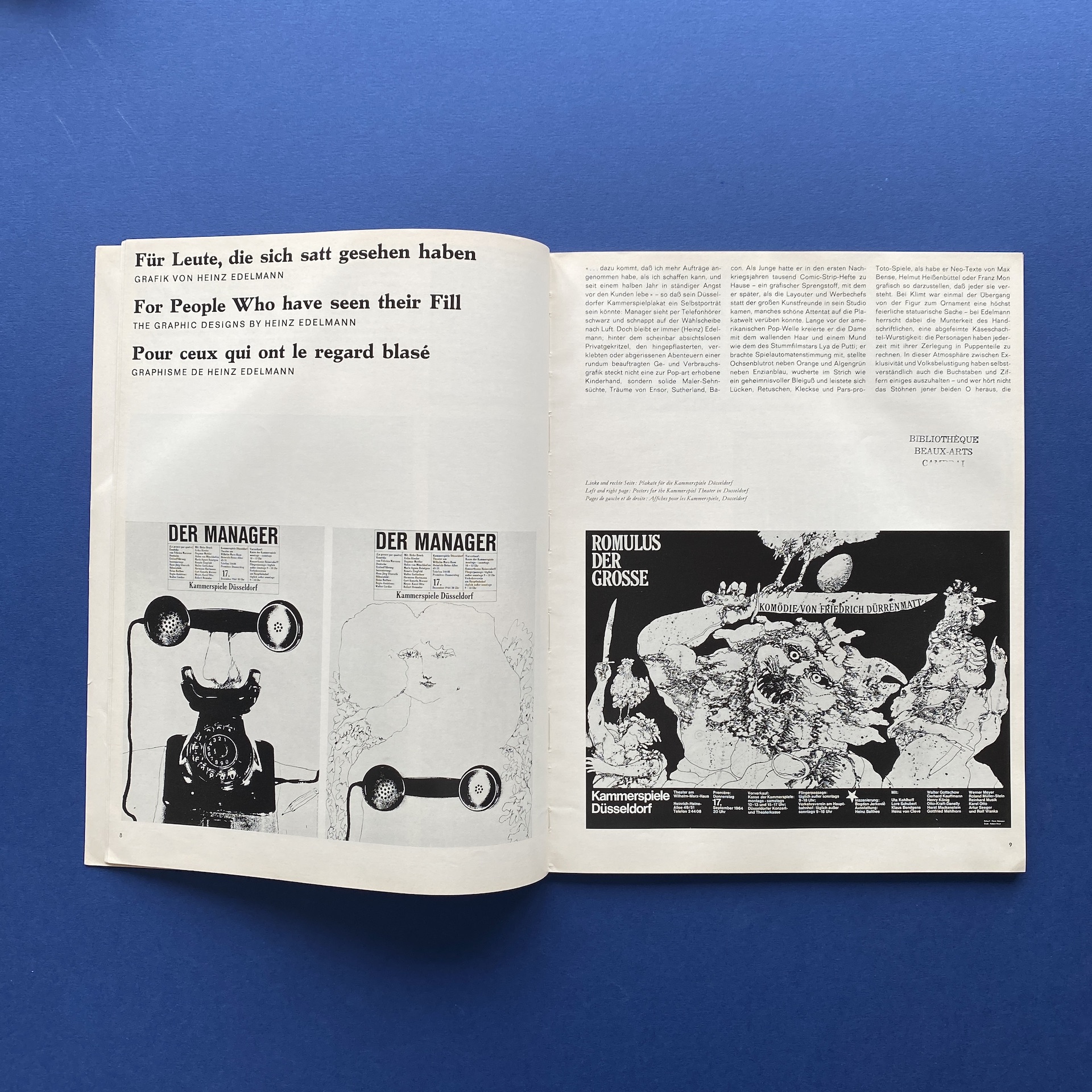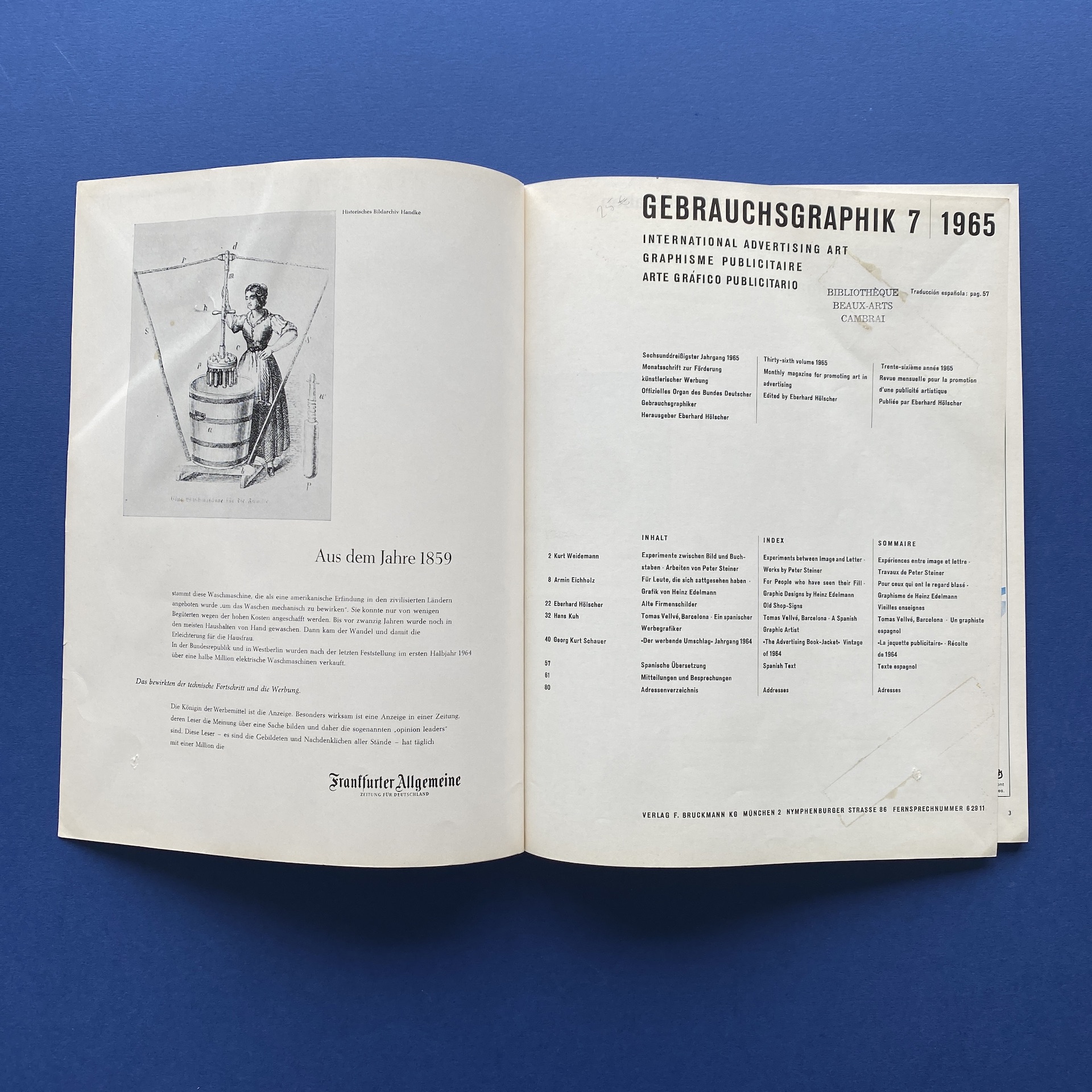 Gebrauchsgraphik 7, International advertising art, München, Eberhard Hölscher, July 1965, 23 x 30 cm. Lang: Ger., Eng., Fre. & Spa. Ex-library copy: “Beaux-arts de Cambrai” stamp, kraft paper glued on the inside cover.