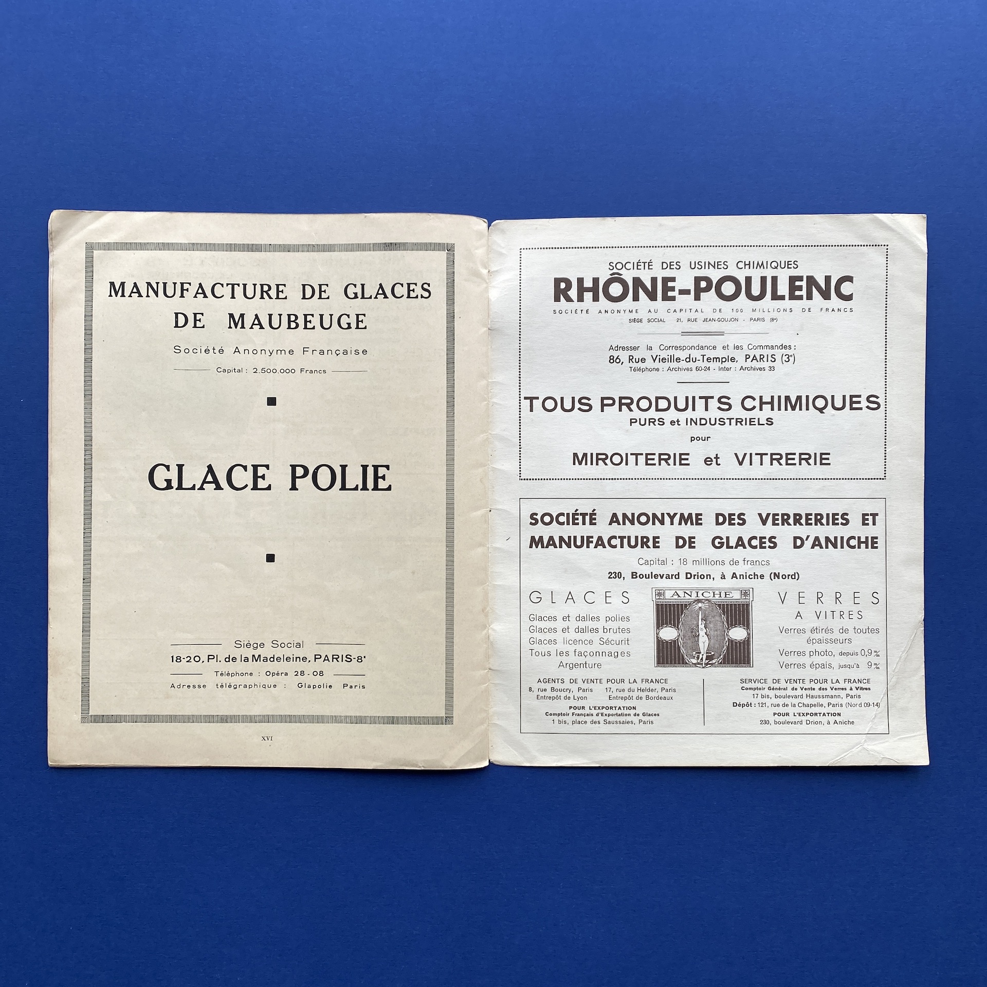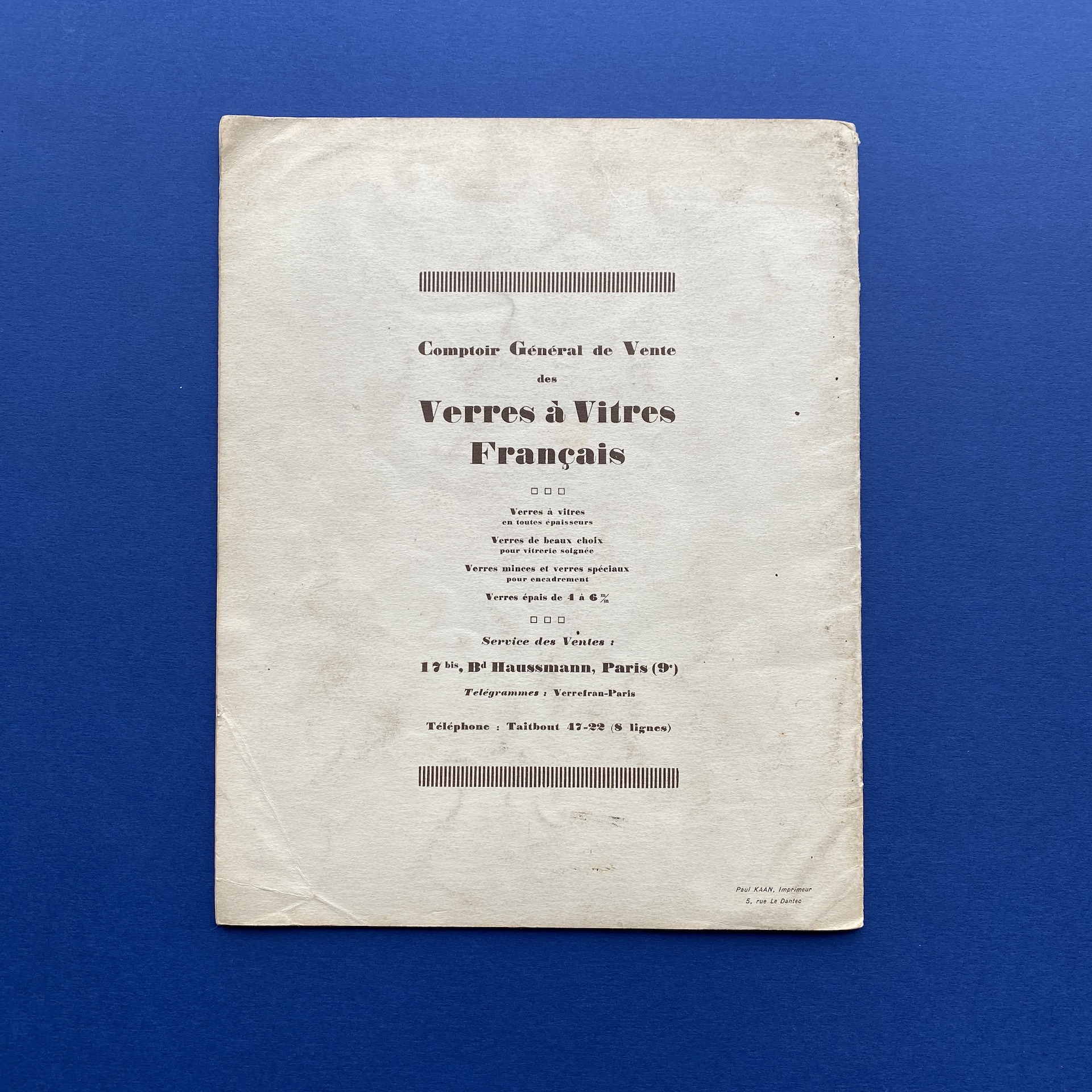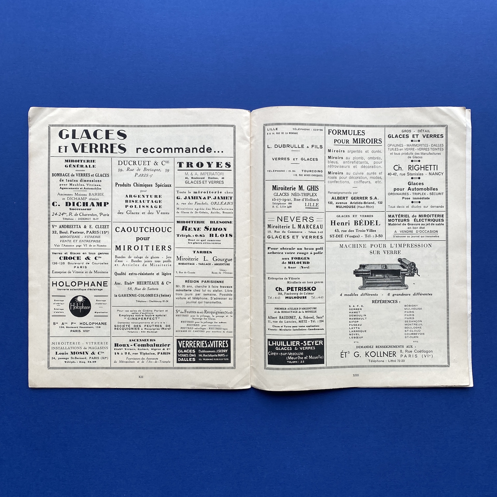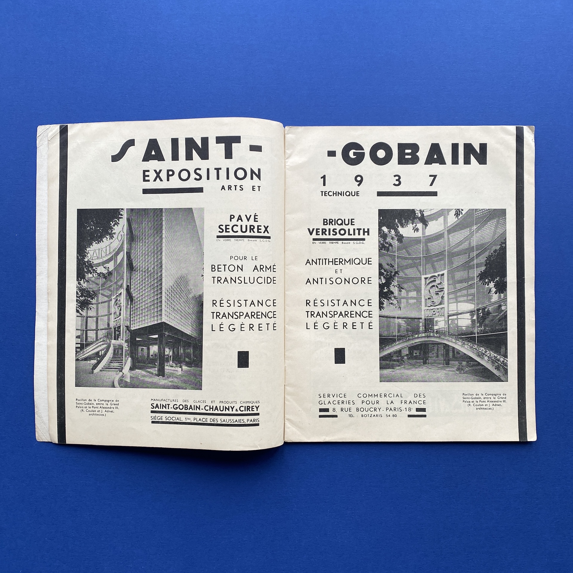 Glaces et verres, n°52, Paris, Paul Kaan Imprimeur & Édition de la société d’étude et de publicité, Oct 1937, 22,3 x 27,2 cm. R. Lhotte (dir.). Copy in good condition: covers a bit yellowed by the time, interior in good condition.