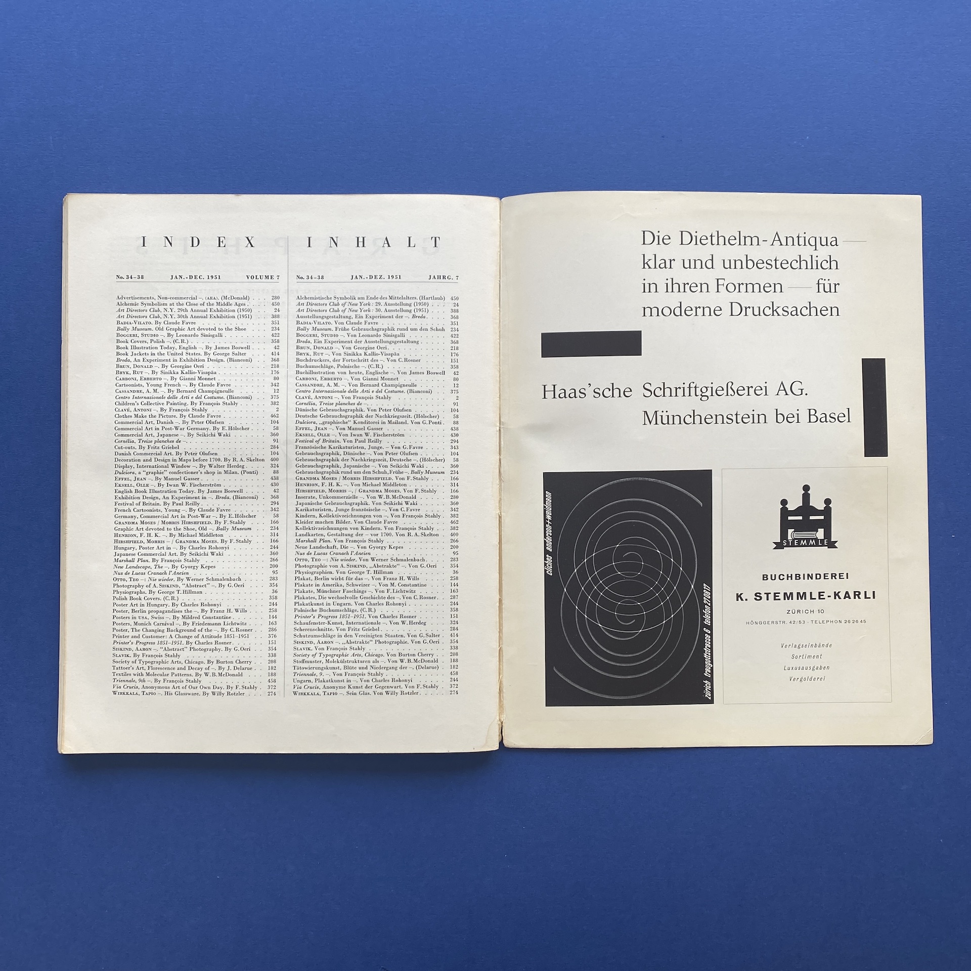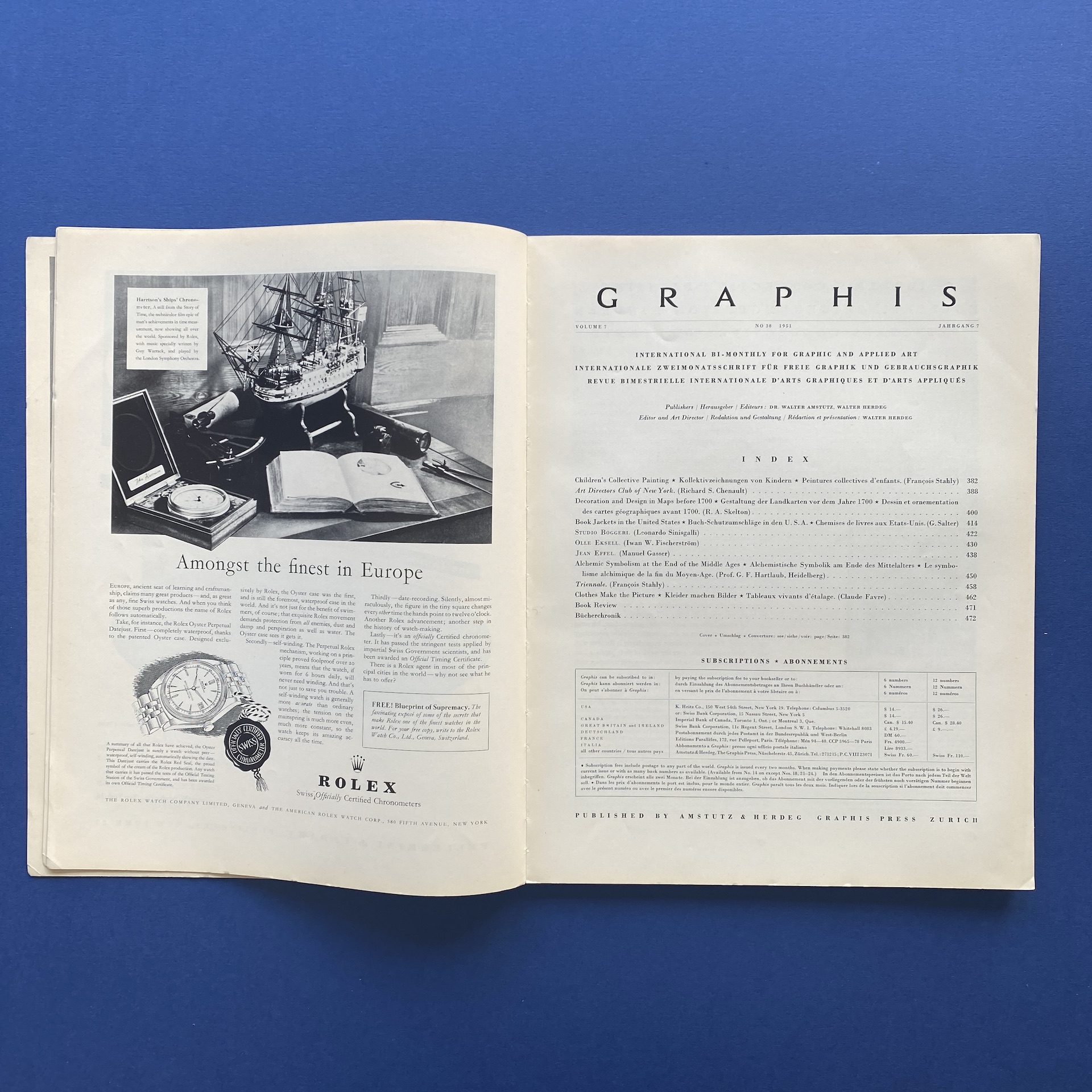 Graphis n°38, volume 7, International bi-monthly for graphic and applied art, Zurich, Ed. Amstutz & Herdeg Graphis Press, 1951, 23,5 x 30 cm. Lang: Fre, Ger & Eng. Copy in good condition: binding a bit fragile.