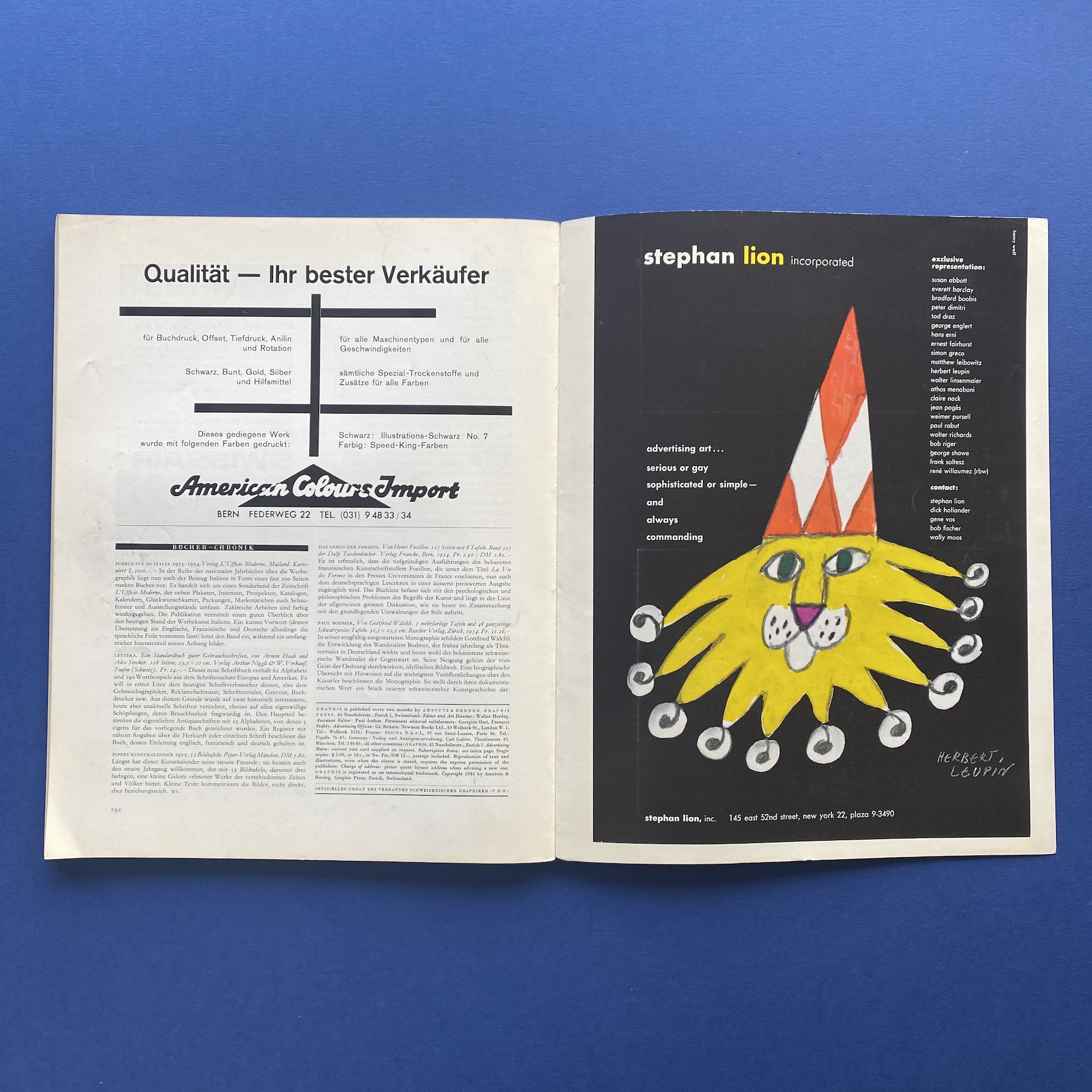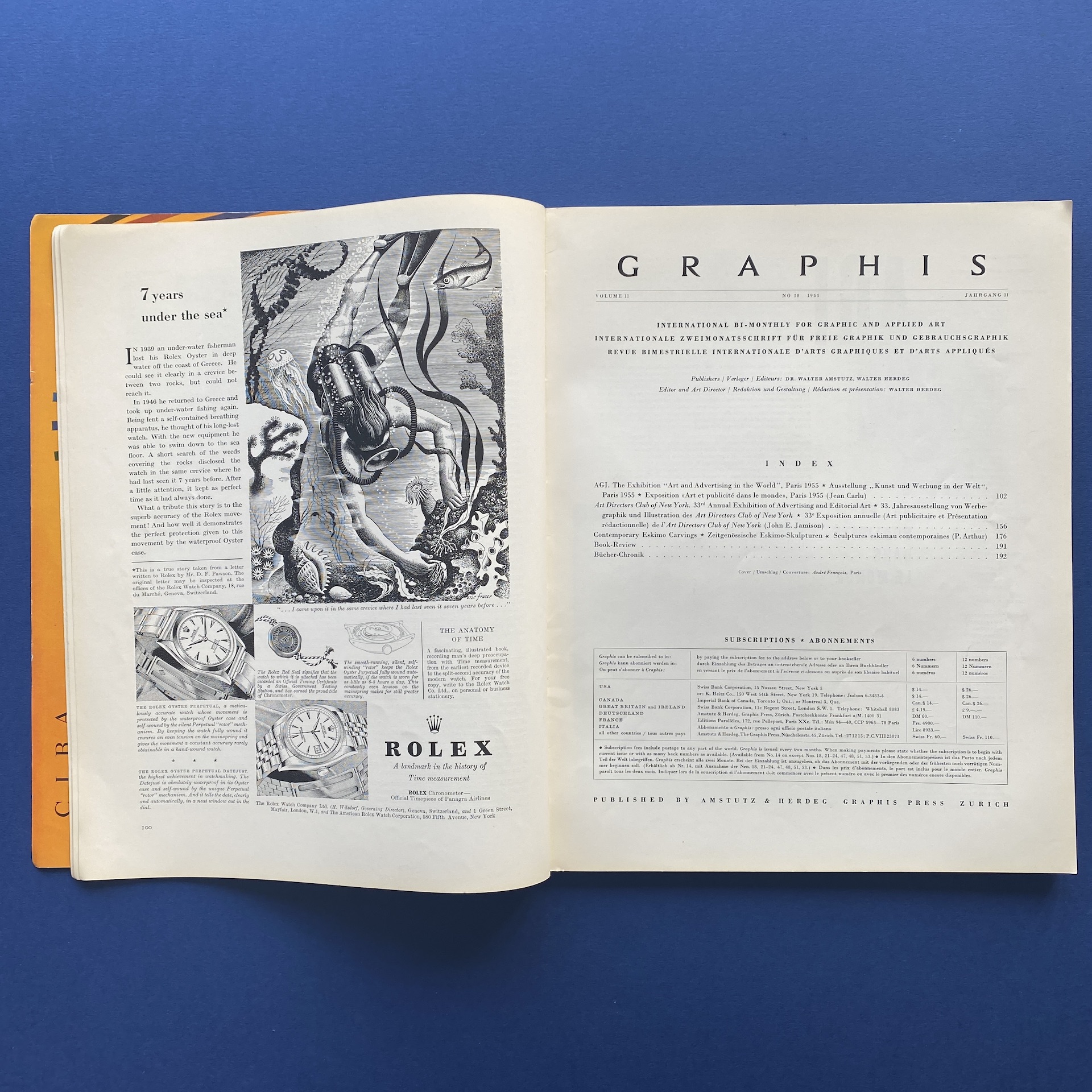 Graphis n°58 volume 11, International bi-monthly for graphic and applied art, Zurich, Ed. Amstutz & Herdeg Graphis Press, 1955, 23,5 x 30 cm. Lang: Fre, Ger & Eng. Front cover by André François. Copy in good condition: binding a bit fragile.