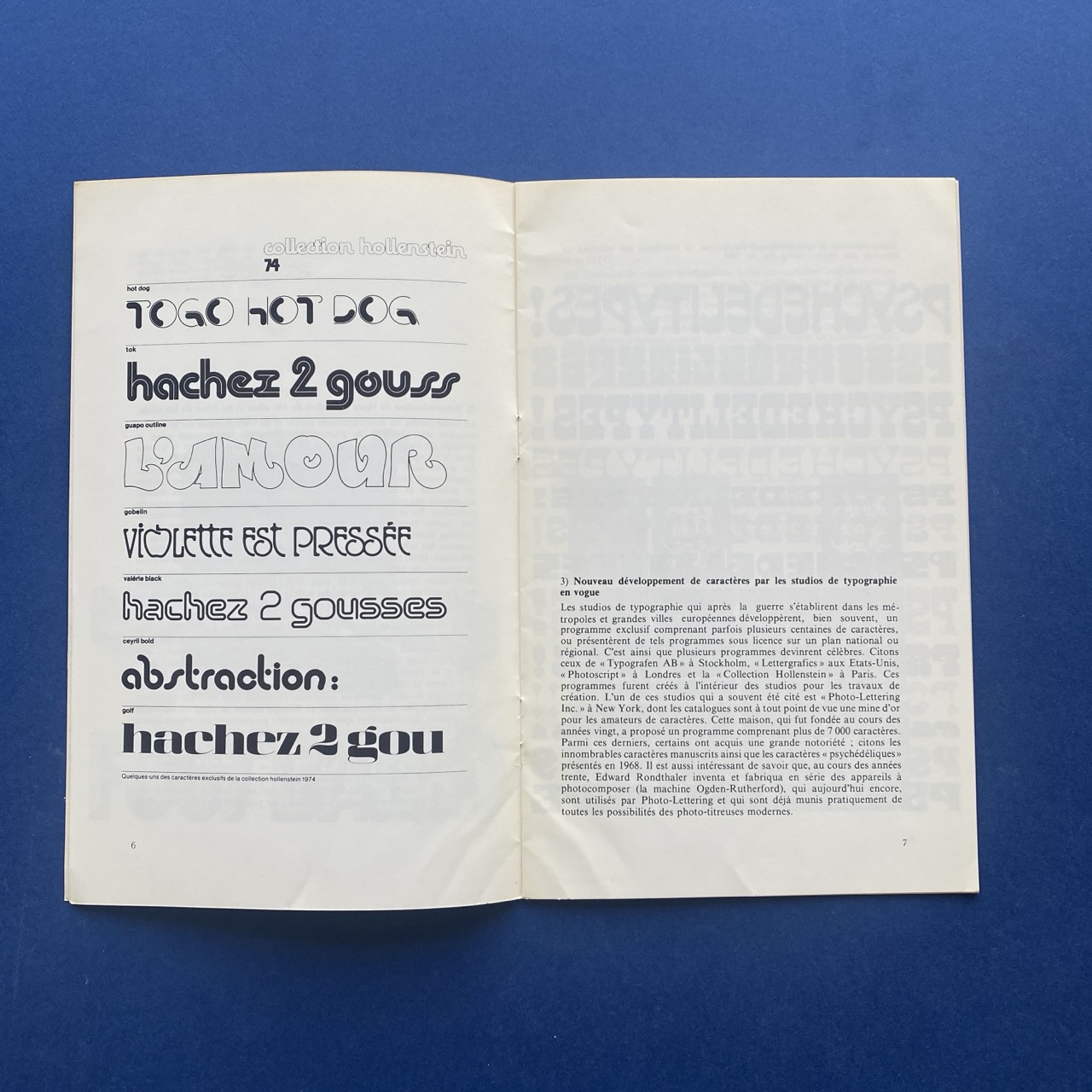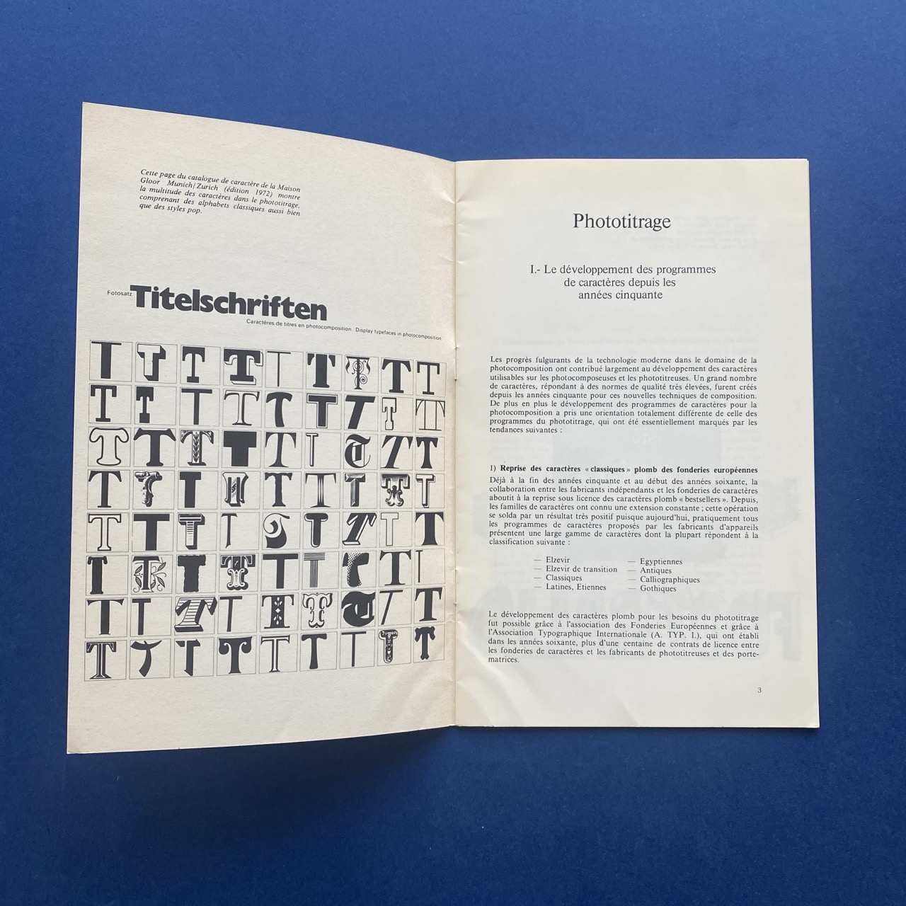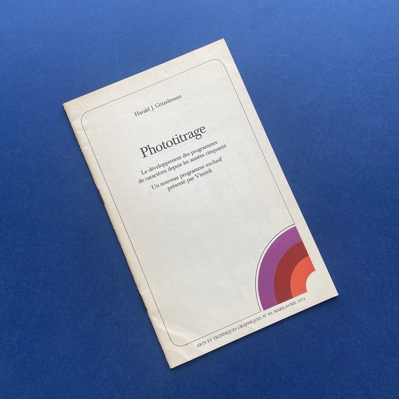 Harald J. Götzelmann, Phototitrage, Le Développement des programmes de caractères depuis les années cinquante, Arts et techniques graphiques n°89, March/April 1974, 20 pp, 17 x 27,4 cm.