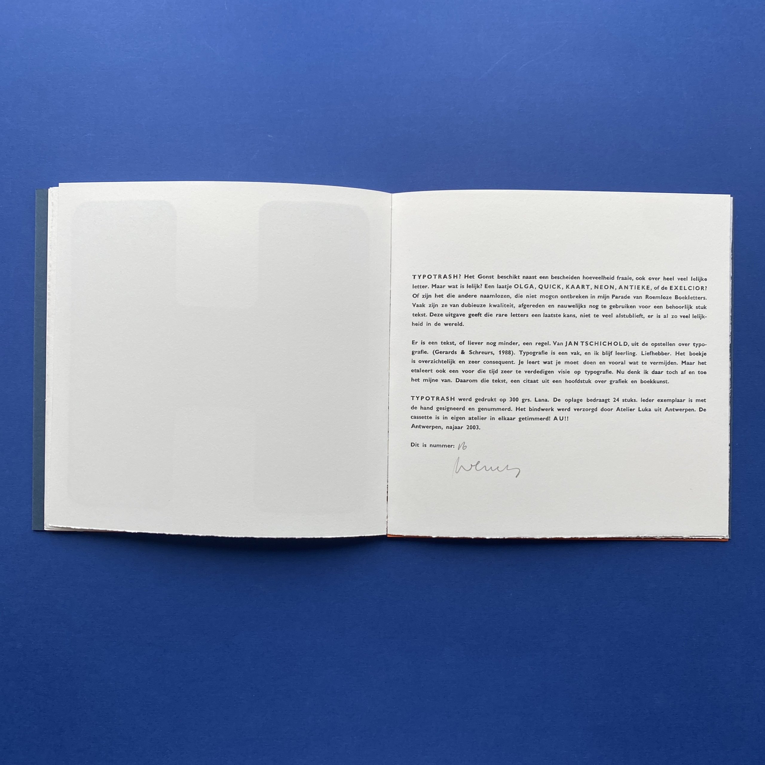Het Gonst, Typotrash, Antwerpen, 2003, 26,5 x 27,5 cm, 22 pp. Numbered 16/24. Gorgeous letterpressed book in wooden box in very good condition.