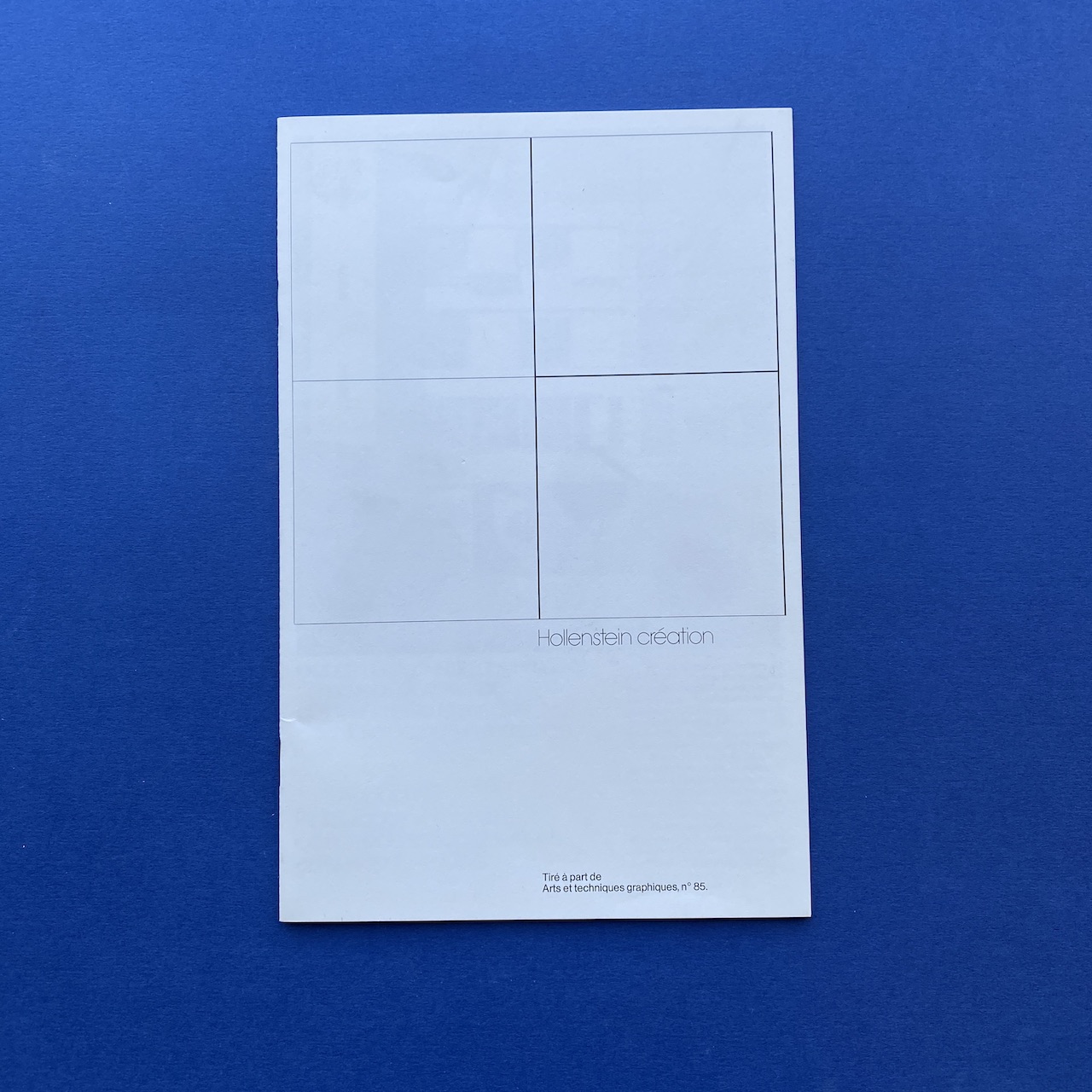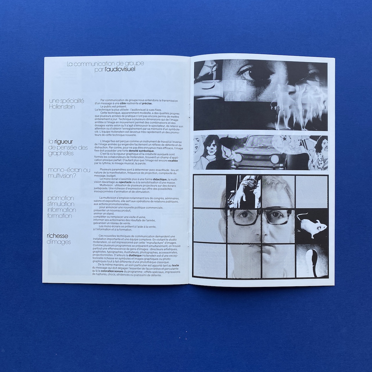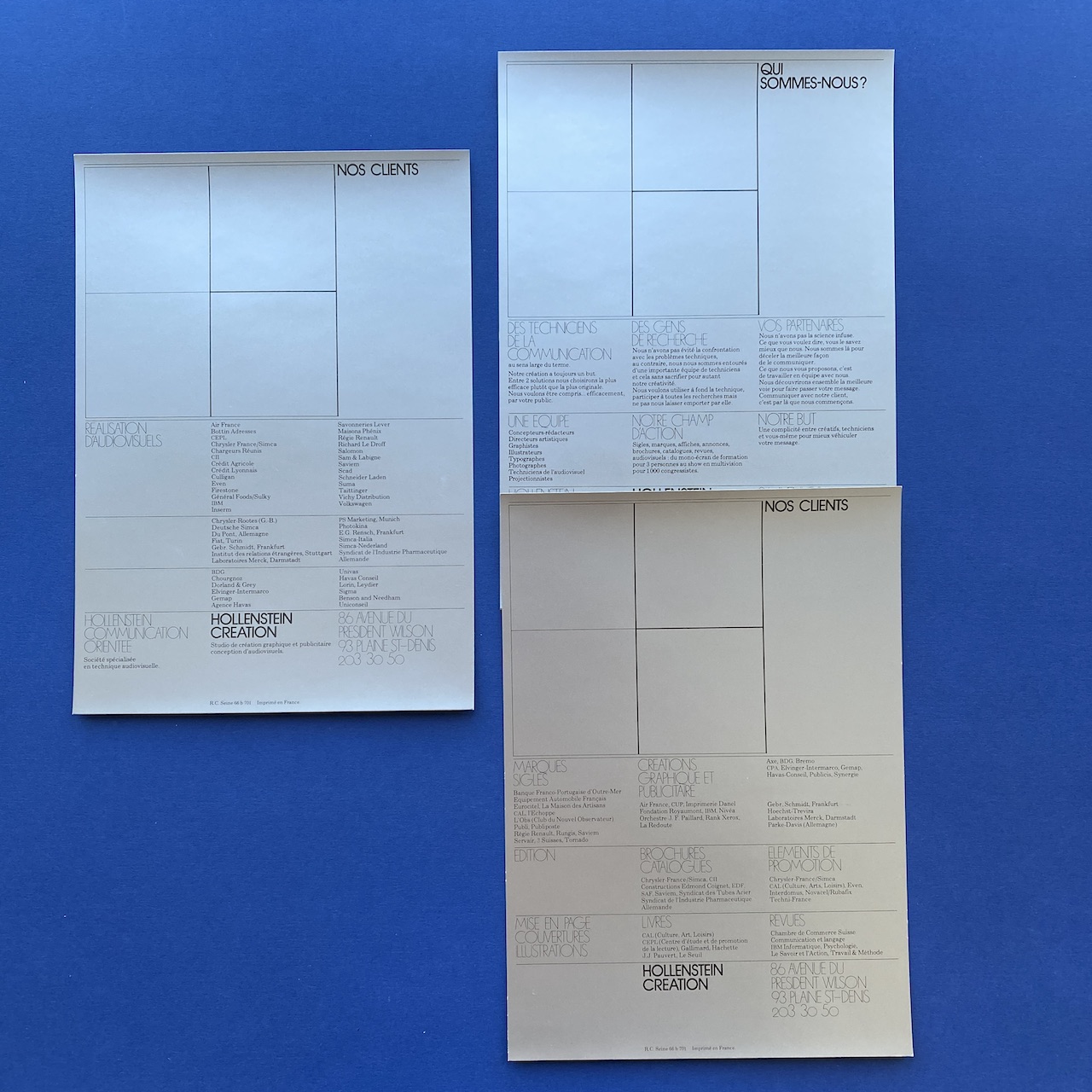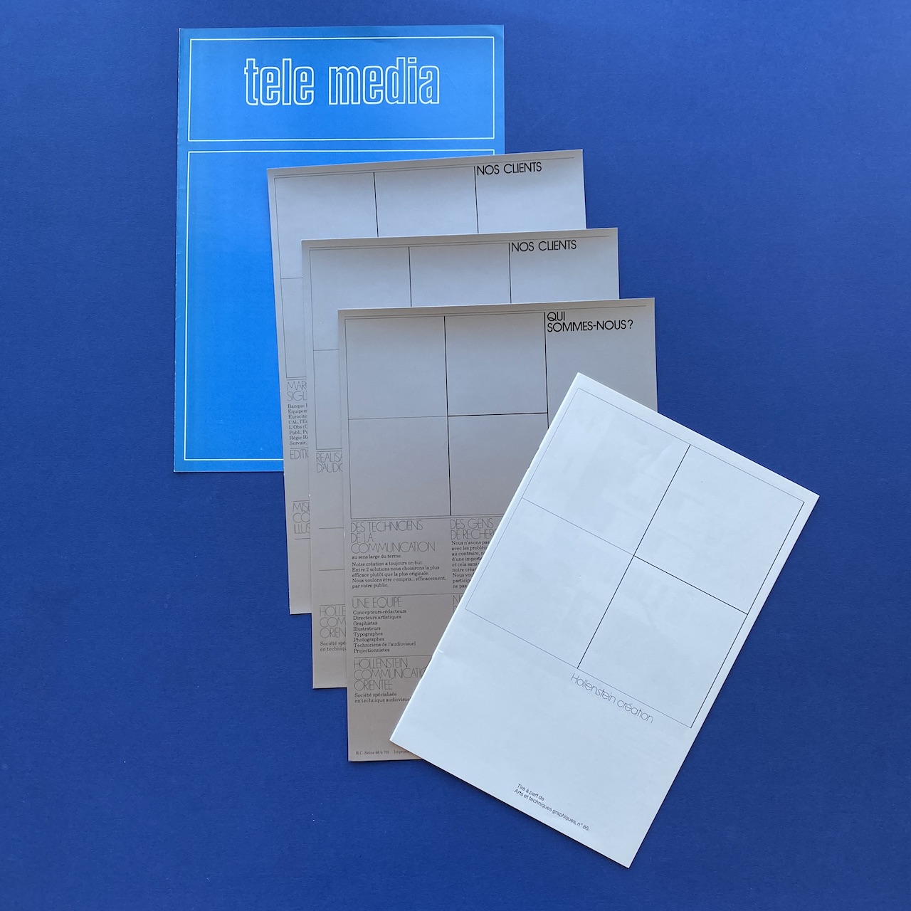 Hollenstein client file, 1970s, 22 x 31 cm. Rigid white paper folder with one brochure, Hollenstein creation, a Télé média leaflet and three advertising cards. Folder and content in very good condition.