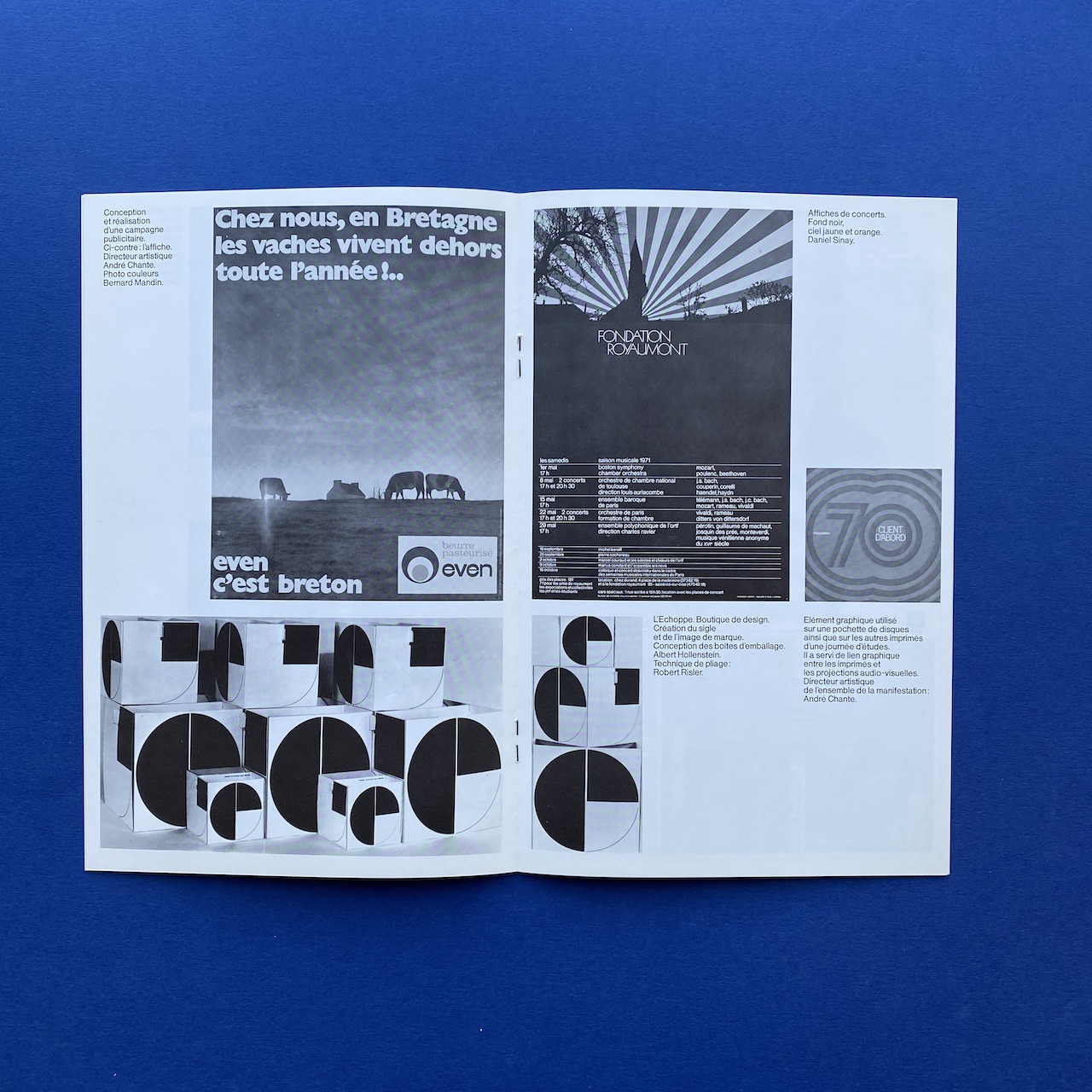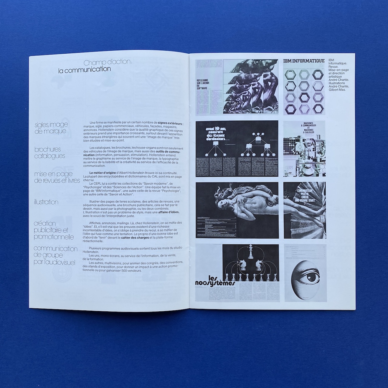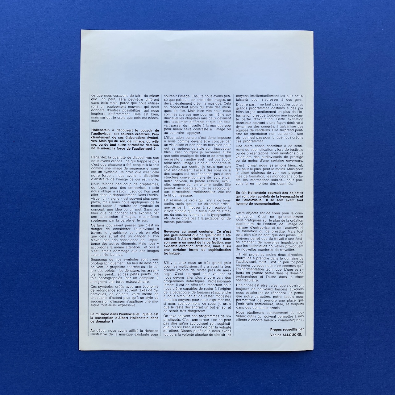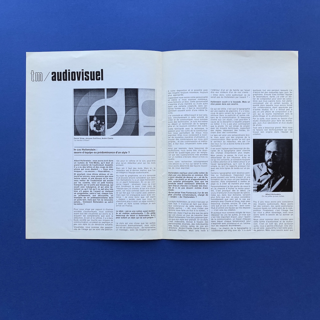 Hollenstein client file, 1970s, 22 x 31 cm. Rigid white paper folder with one brochure, Hollenstein creation, a Télé média leaflet and three advertising cards. Folder and content in very good condition.