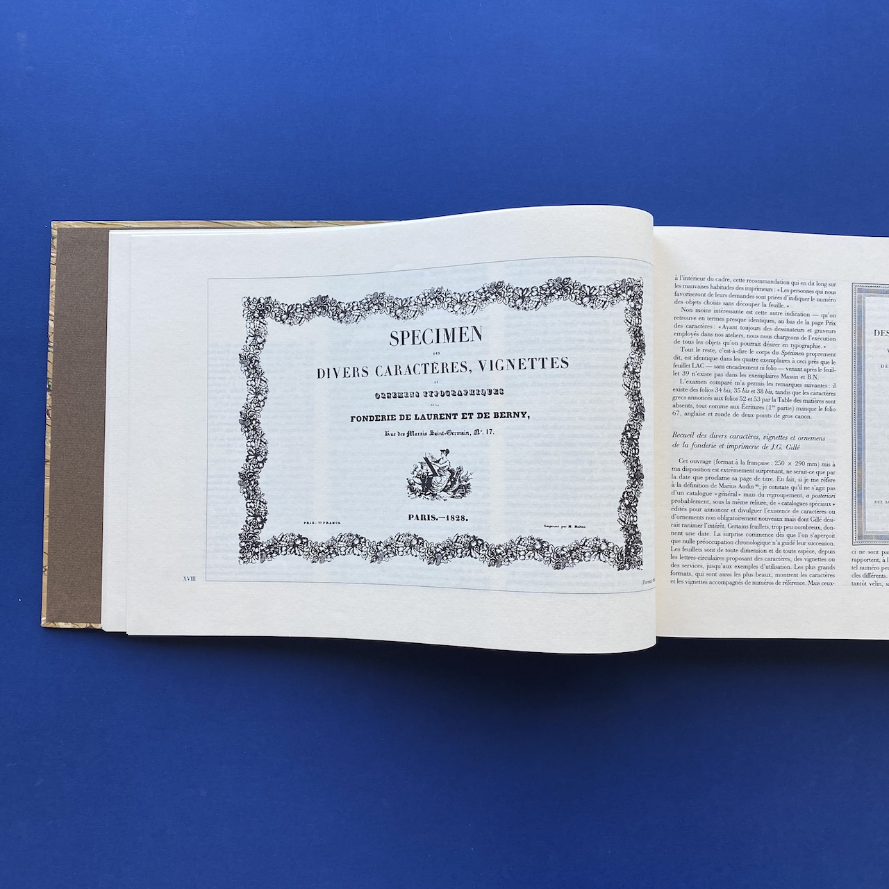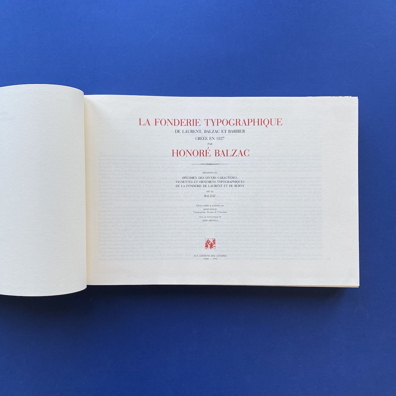 Honoré Balzac, Spécimen des divers caractères, vignettes et ornements typographiques de la Fonderie de Laurent et de Berny, Éditions des Cendres, Paris, 1992, 36,5 x 25 cm, 400 pp. Reprint of the 1828 specimen. Numbered 435. In very good condition, rigid covers.