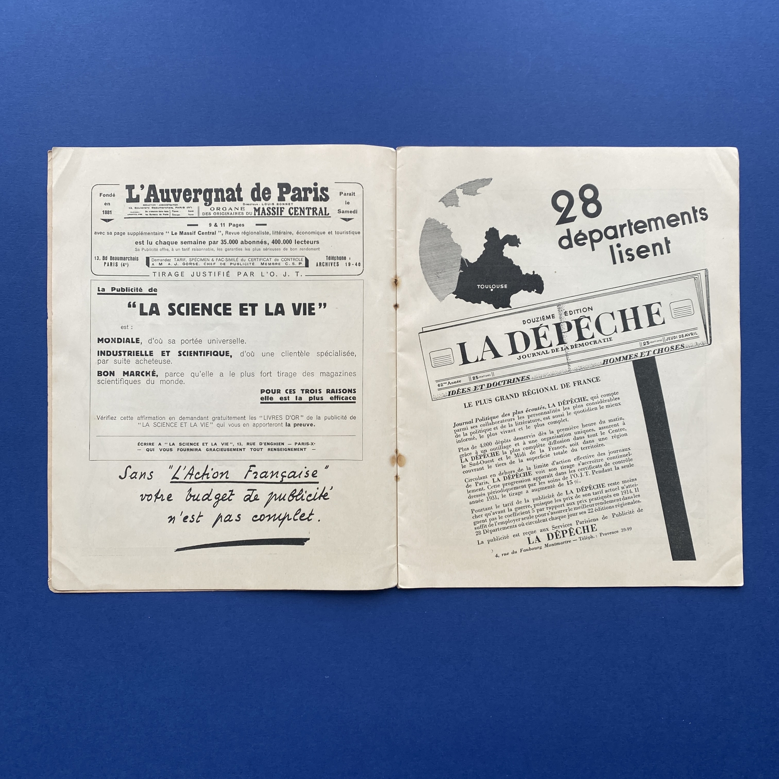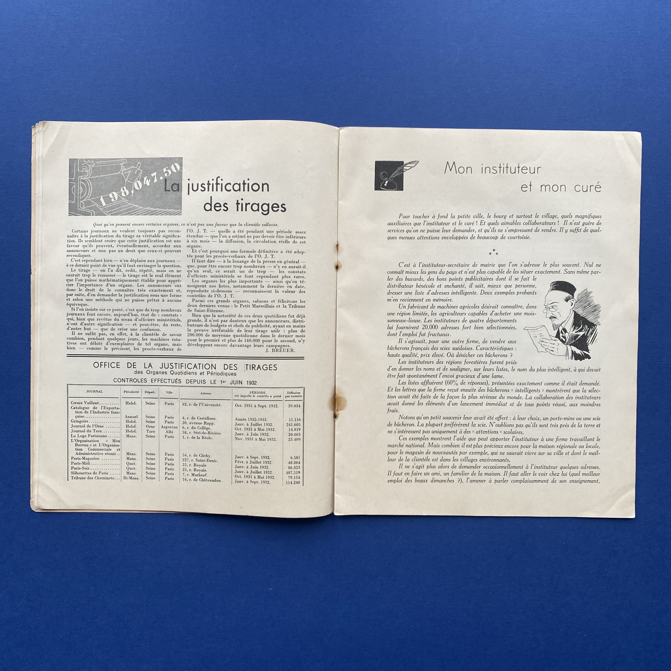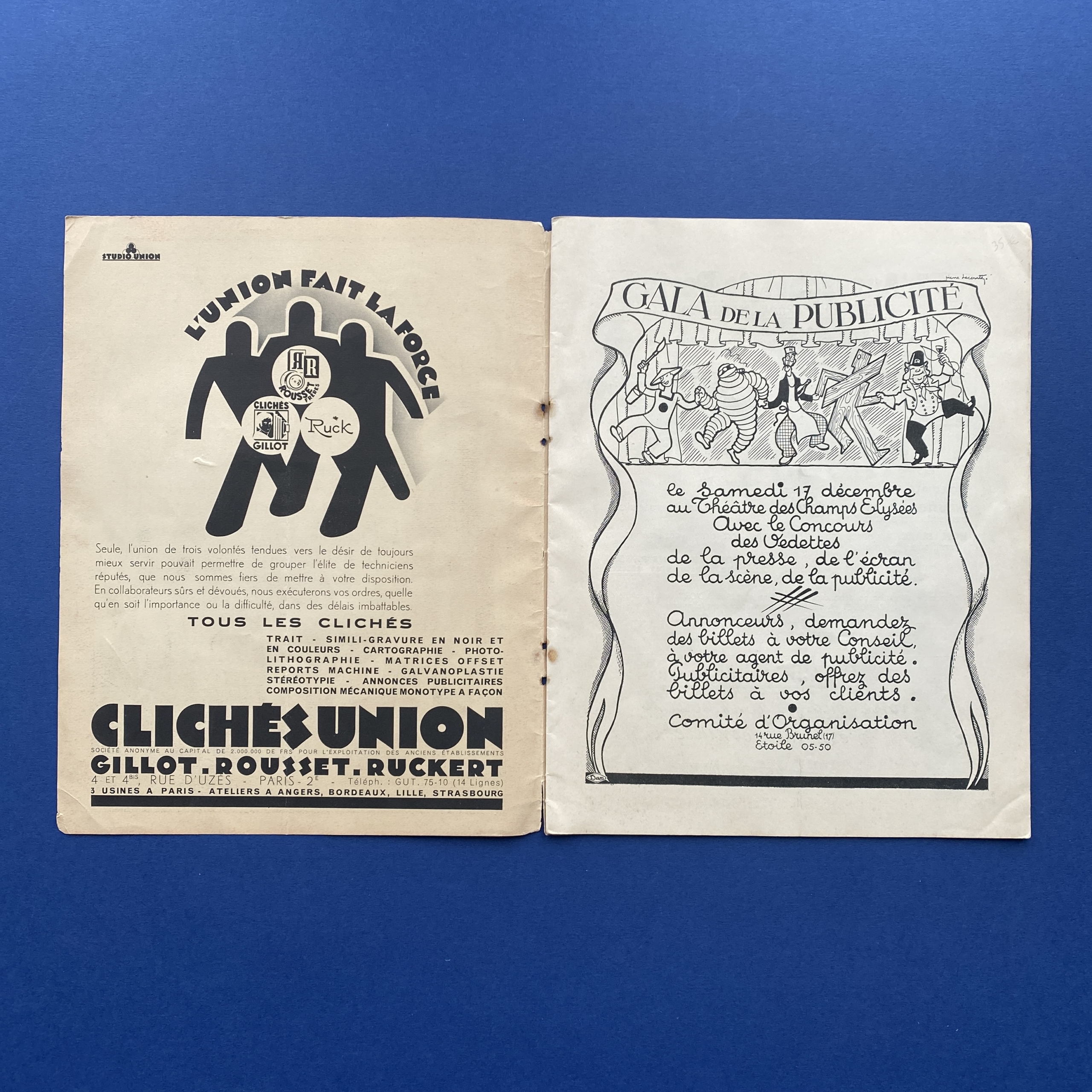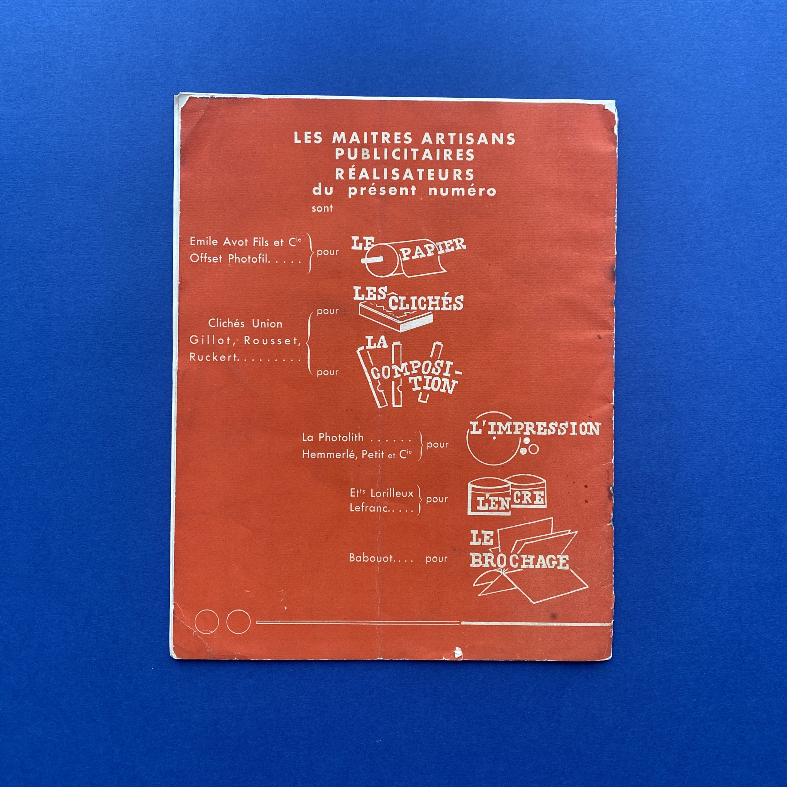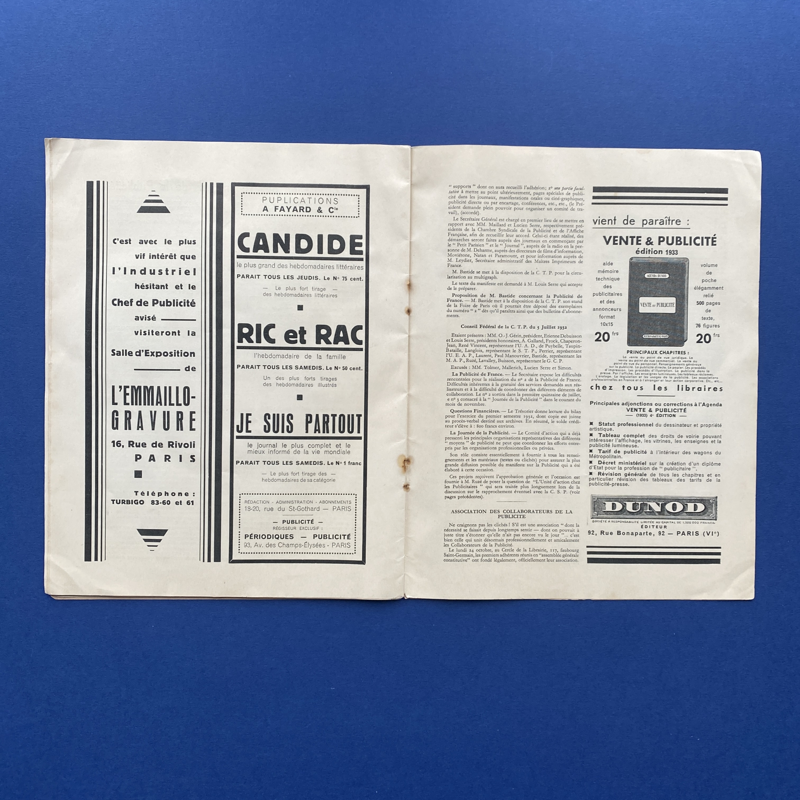 La publicité française, Bulletin 3, 1930’s, Paris 14 pp. Official bulletin of the corporation of advertising technicians. This copy is complete but it is no longer bound because the fasteners are missing. Cover by Jean Chaperon.
