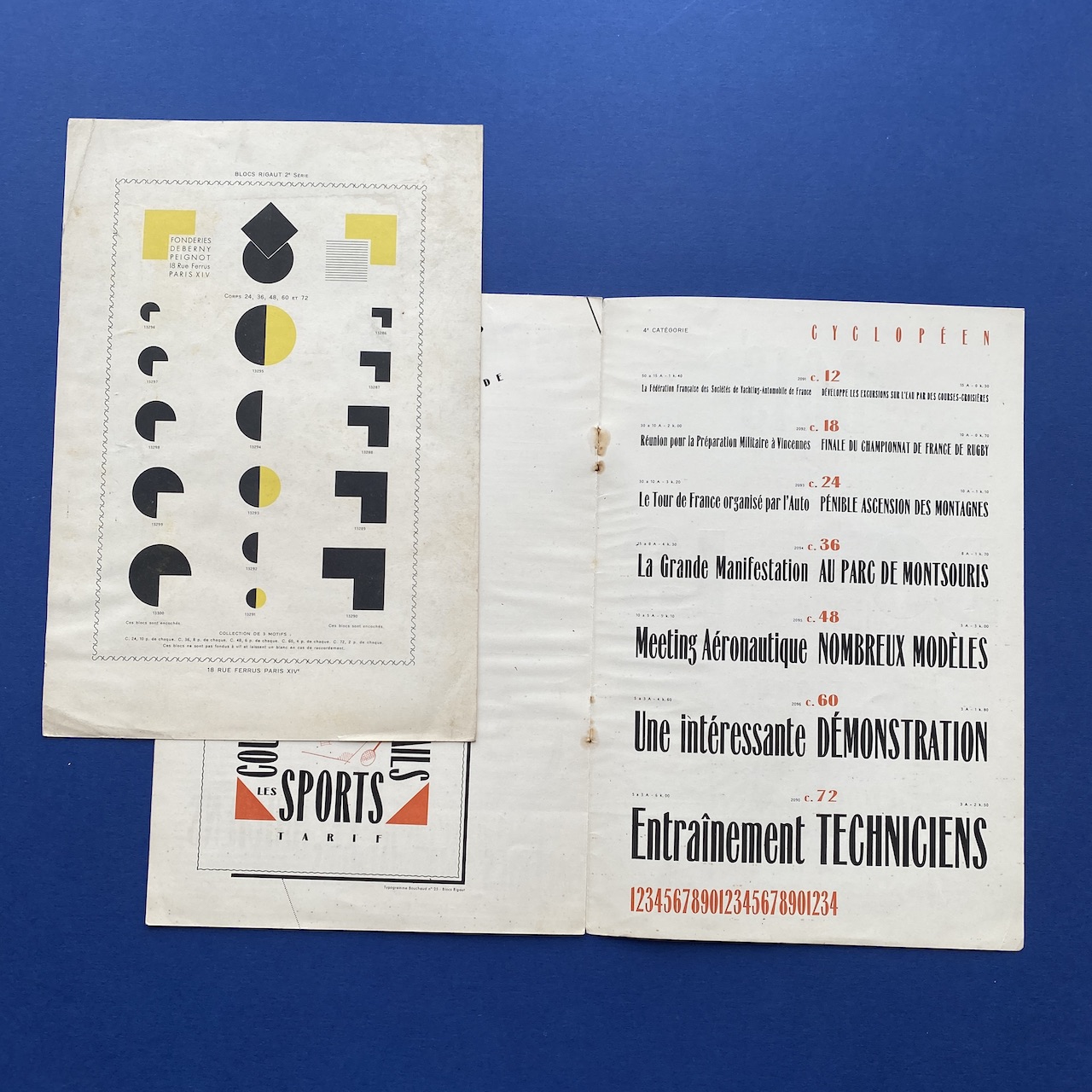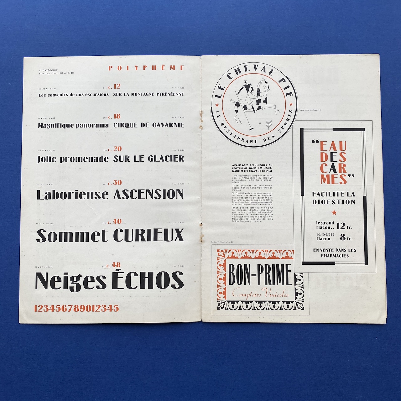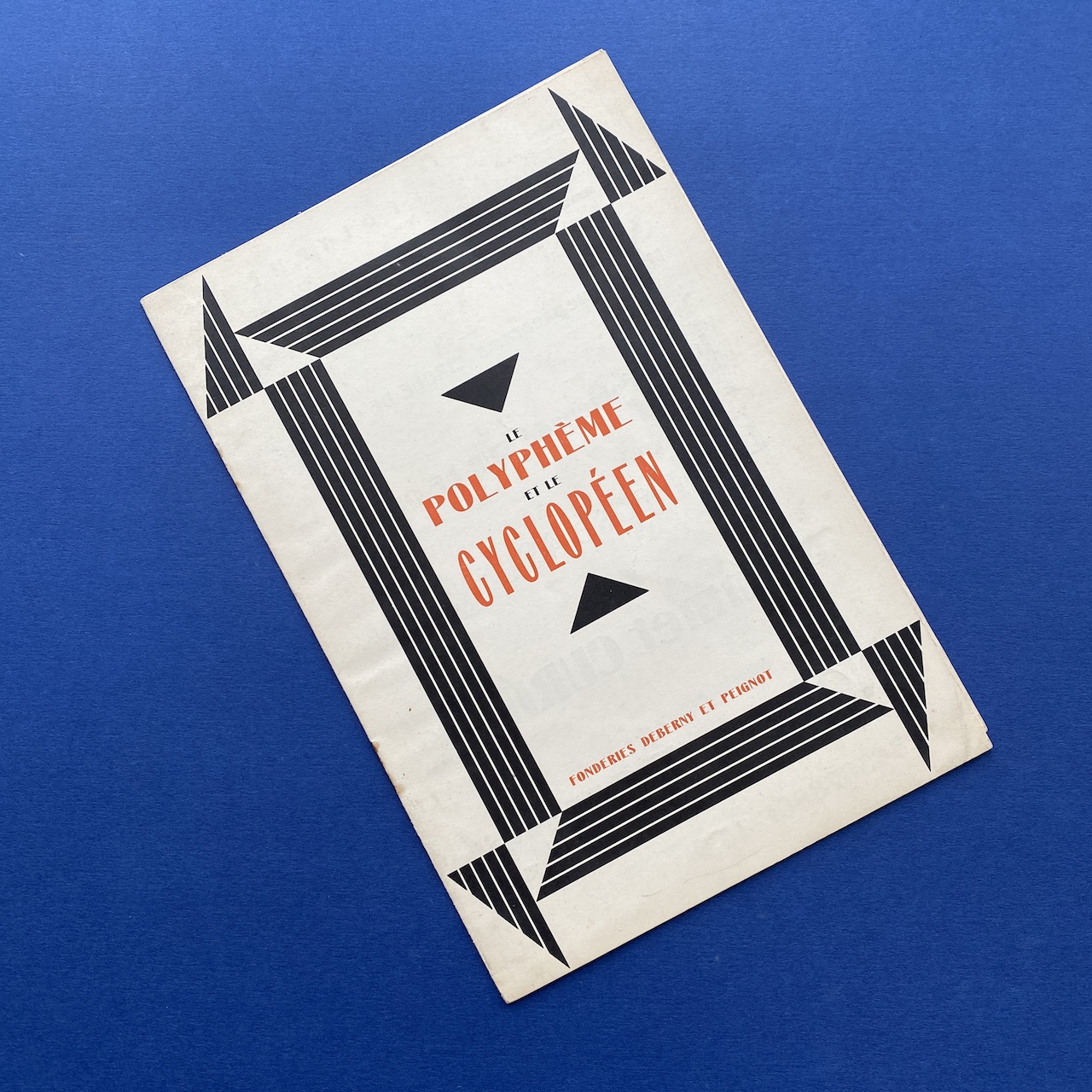 Le Polyphème et le Cyclopéen, 1936, Deberny et Peignot, 18,3 x 27 cm. 8 pp. + insert. The typefaces are introduced in the 1903 Spécimen général and presented later in a L’Europe specimen. Booklet in good condition, rusty staples.
