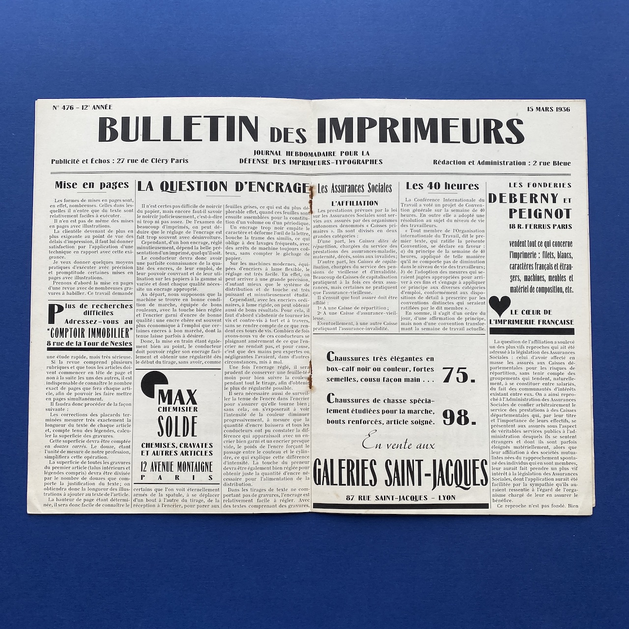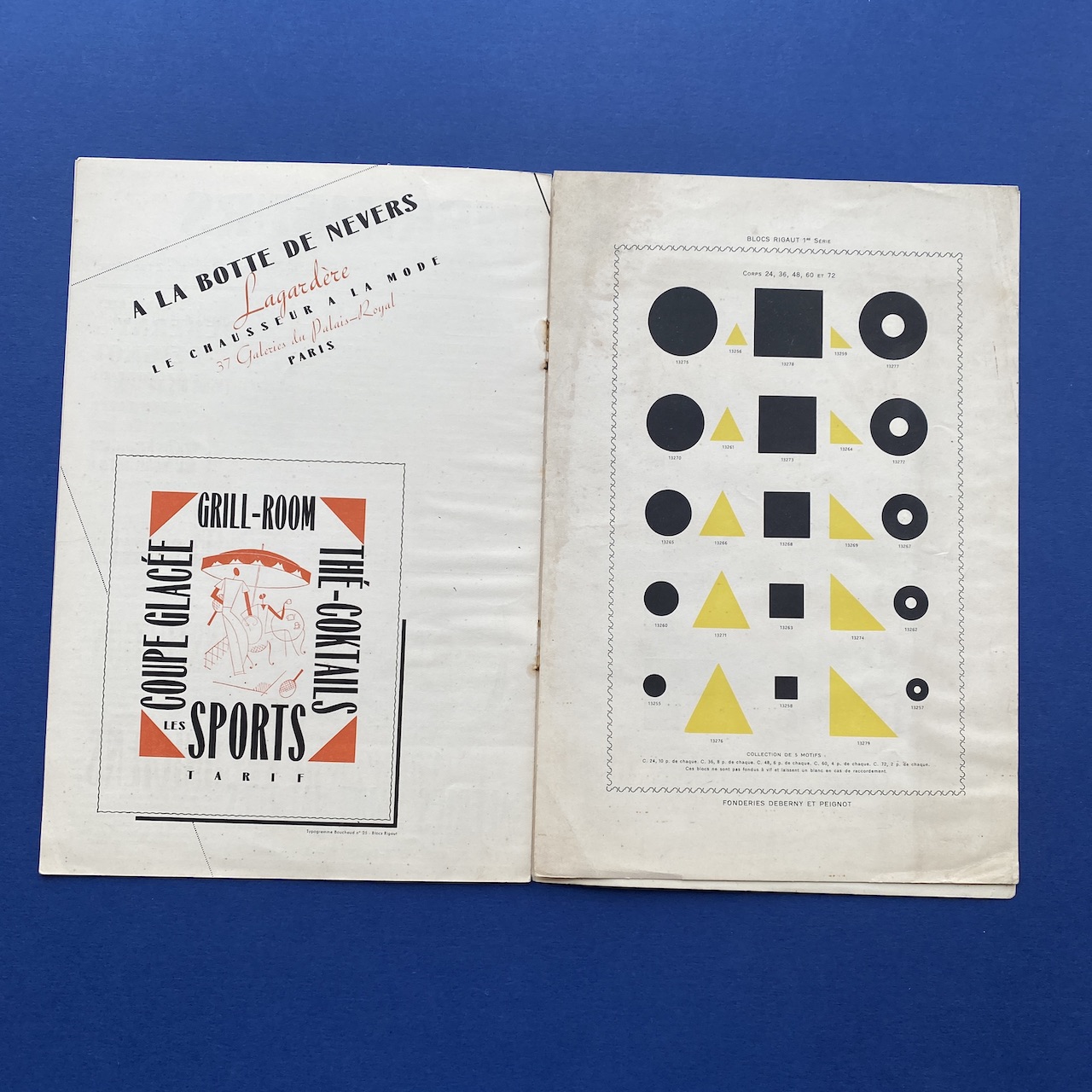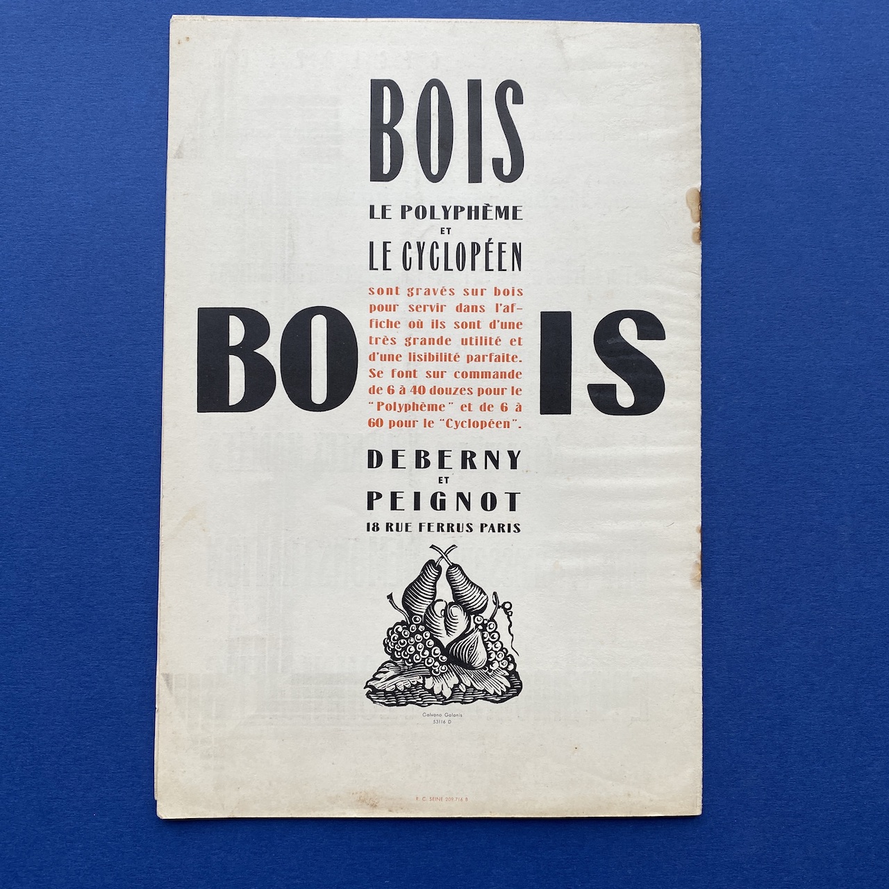 Le Polyphème et le Cyclopéen, 1936, Deberny et Peignot, 18,3 x 27 cm. 8 pp. + insert. The typefaces are introduced in the 1903 Spécimen général and presented later in a L’Europe specimen. Booklet in good condition, rusty staples.