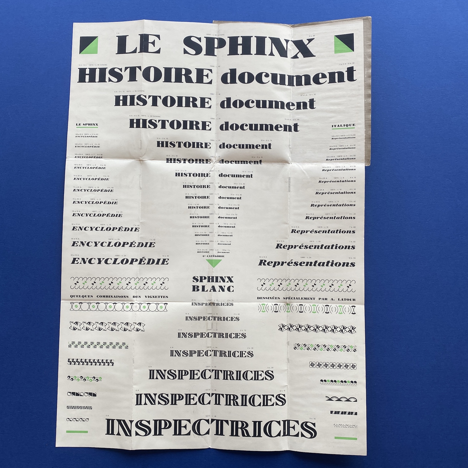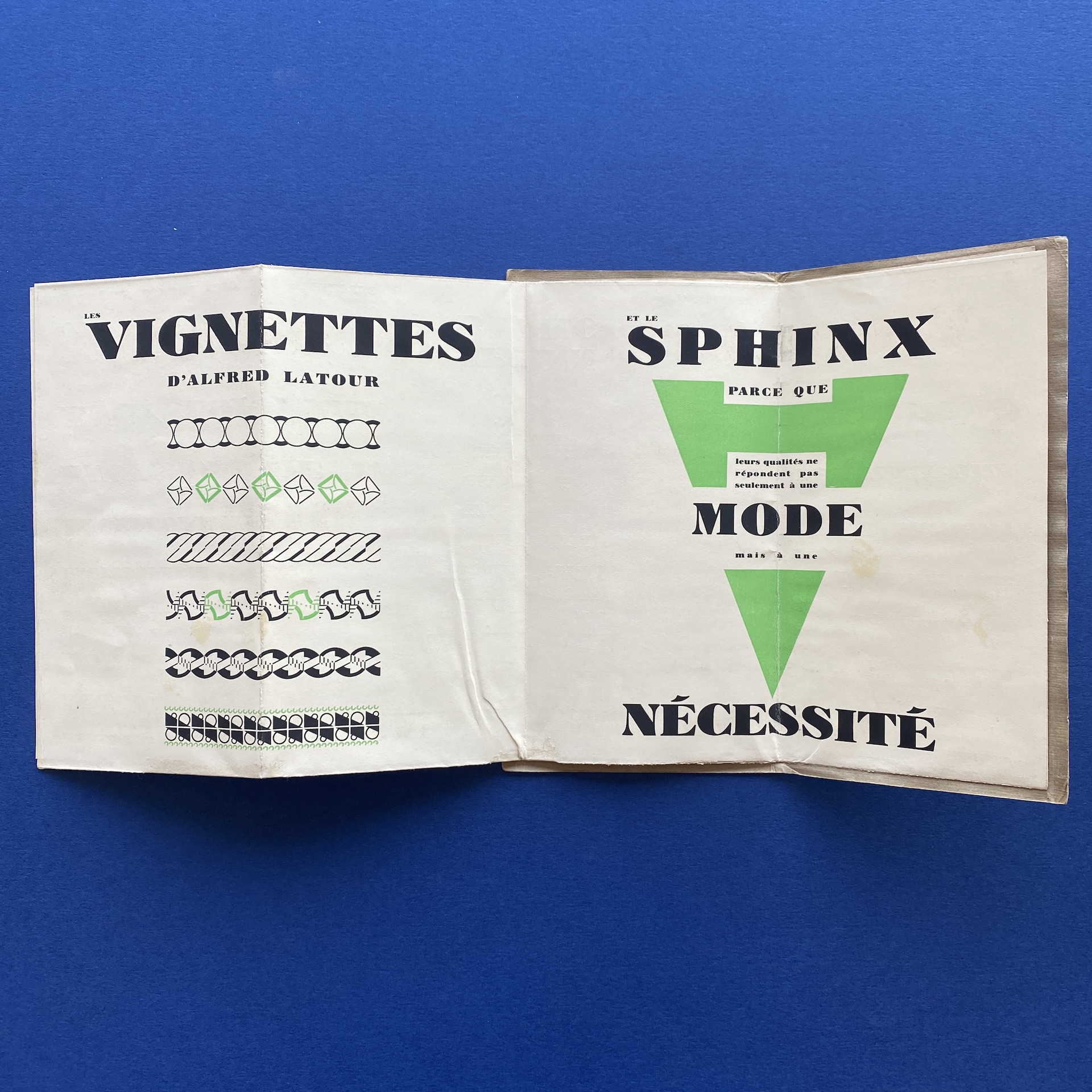 Le Sphinx, Paris, Deberny et Peignot c., 1931, 8,5 x 16 cm. Pocket-sized fold out brochure in very good condition. Type designed by Alfred Latour.