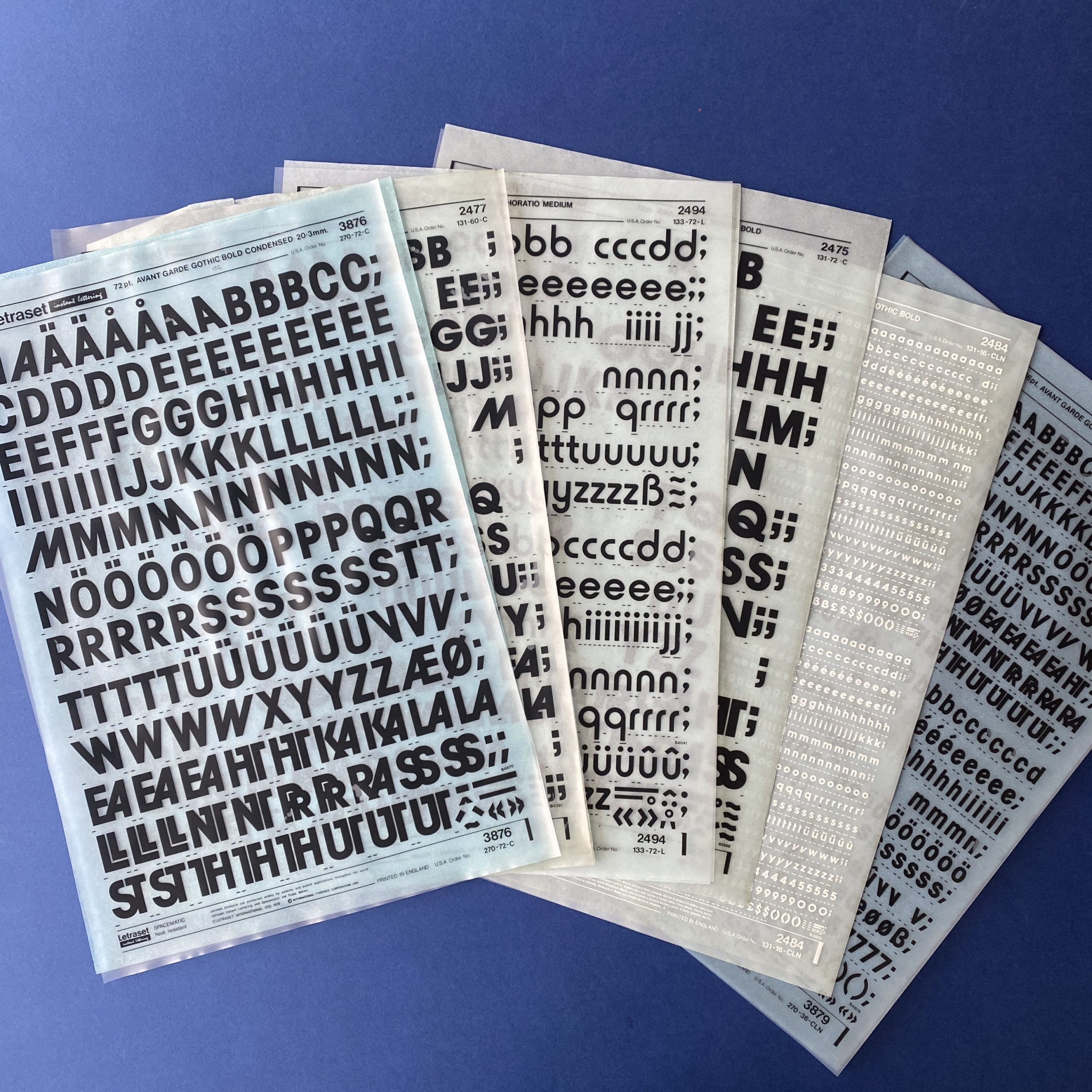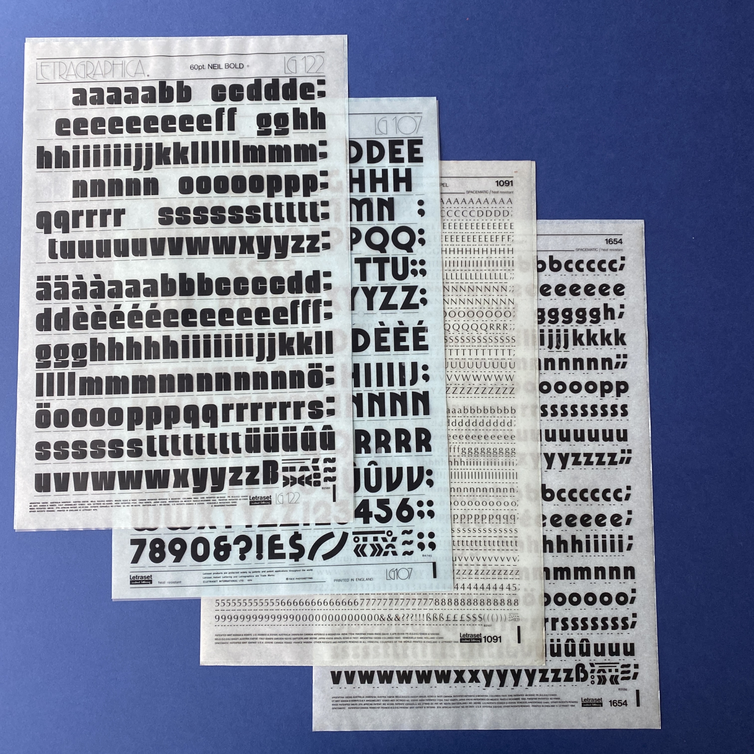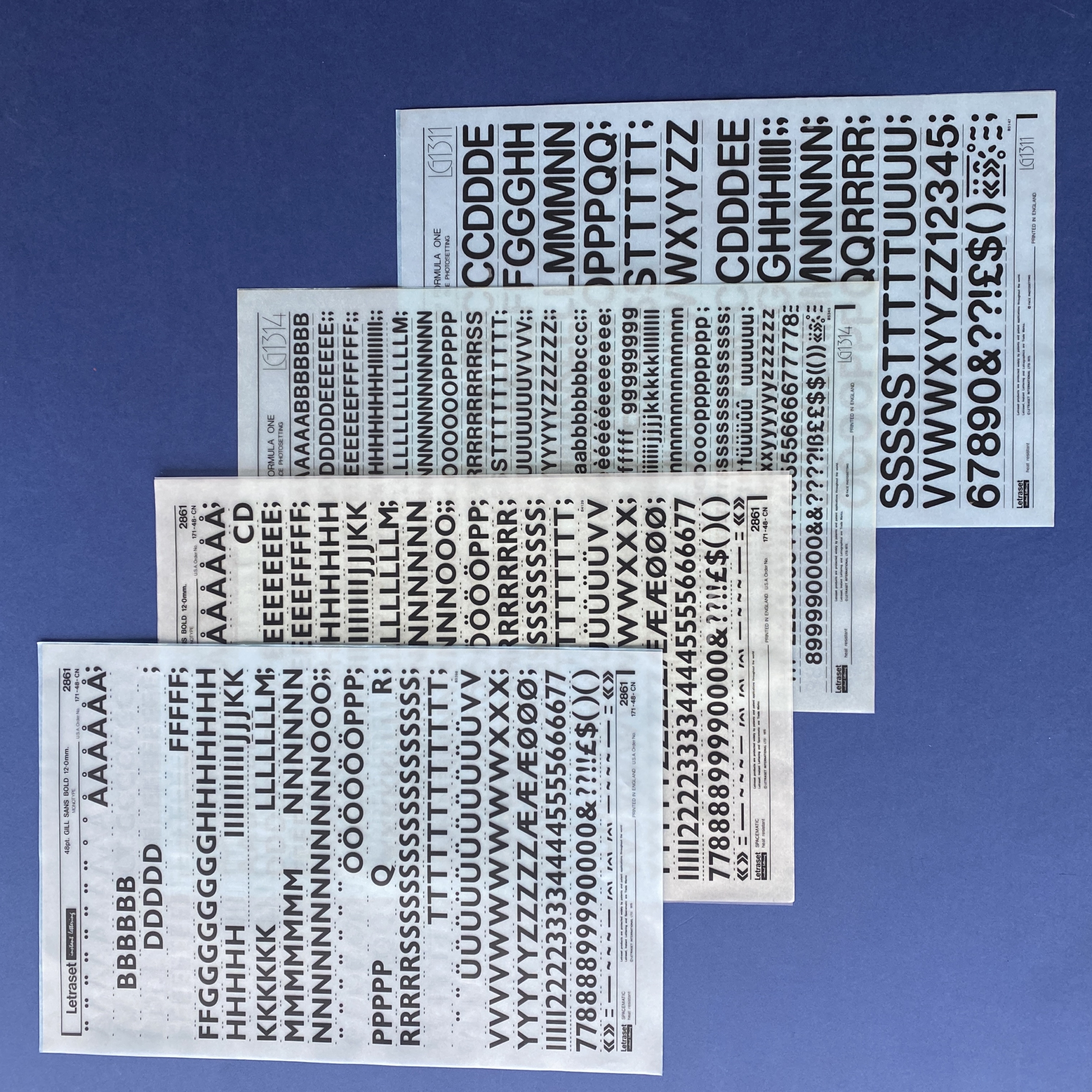 Transfer typeface sheets used by graphic designers for page layout before the advent of computers and PAO software. The Letraset brand is the best-known on the market, but other brands such as Mecanorma or Decadry also exist.