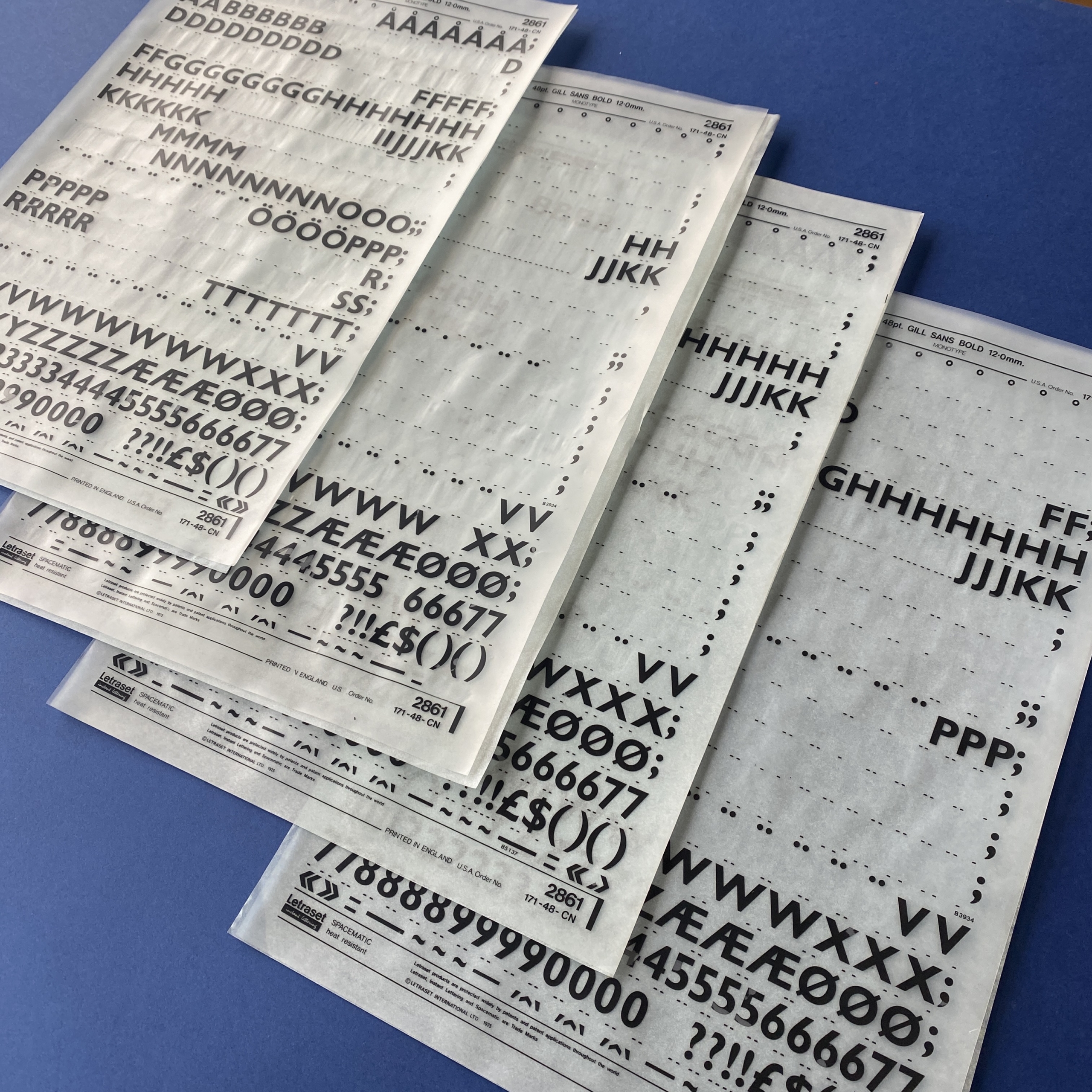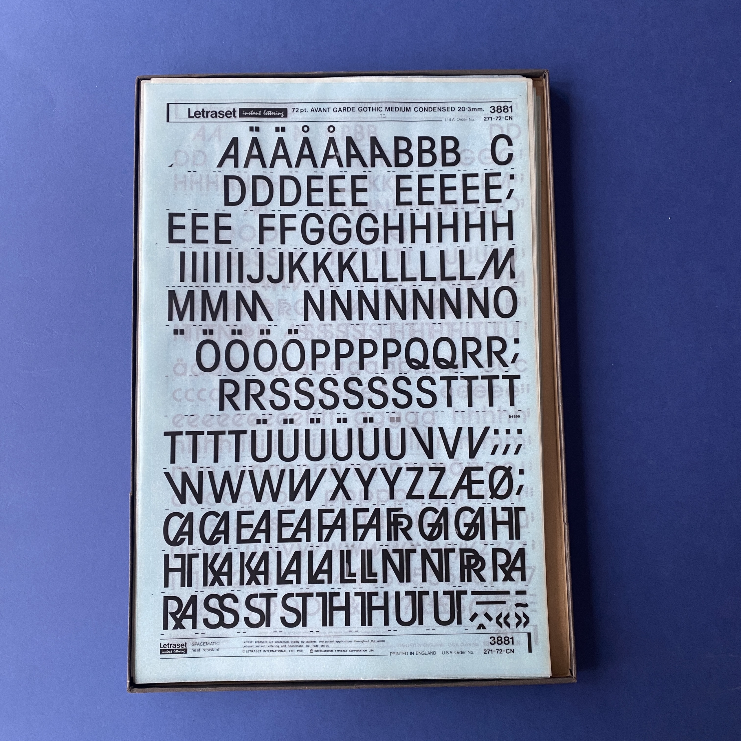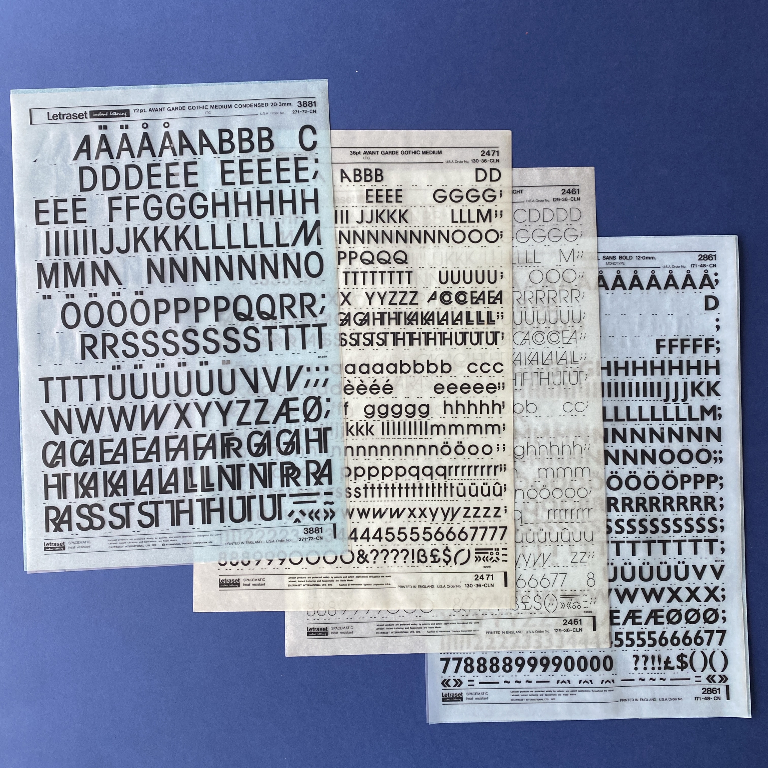 Transfer typeface sheets used by graphic designers for page layout before the advent of computers and PAO software. The Letraset brand is the best-known on the market, but other brands such as Mecanorma or Decadry also exist.