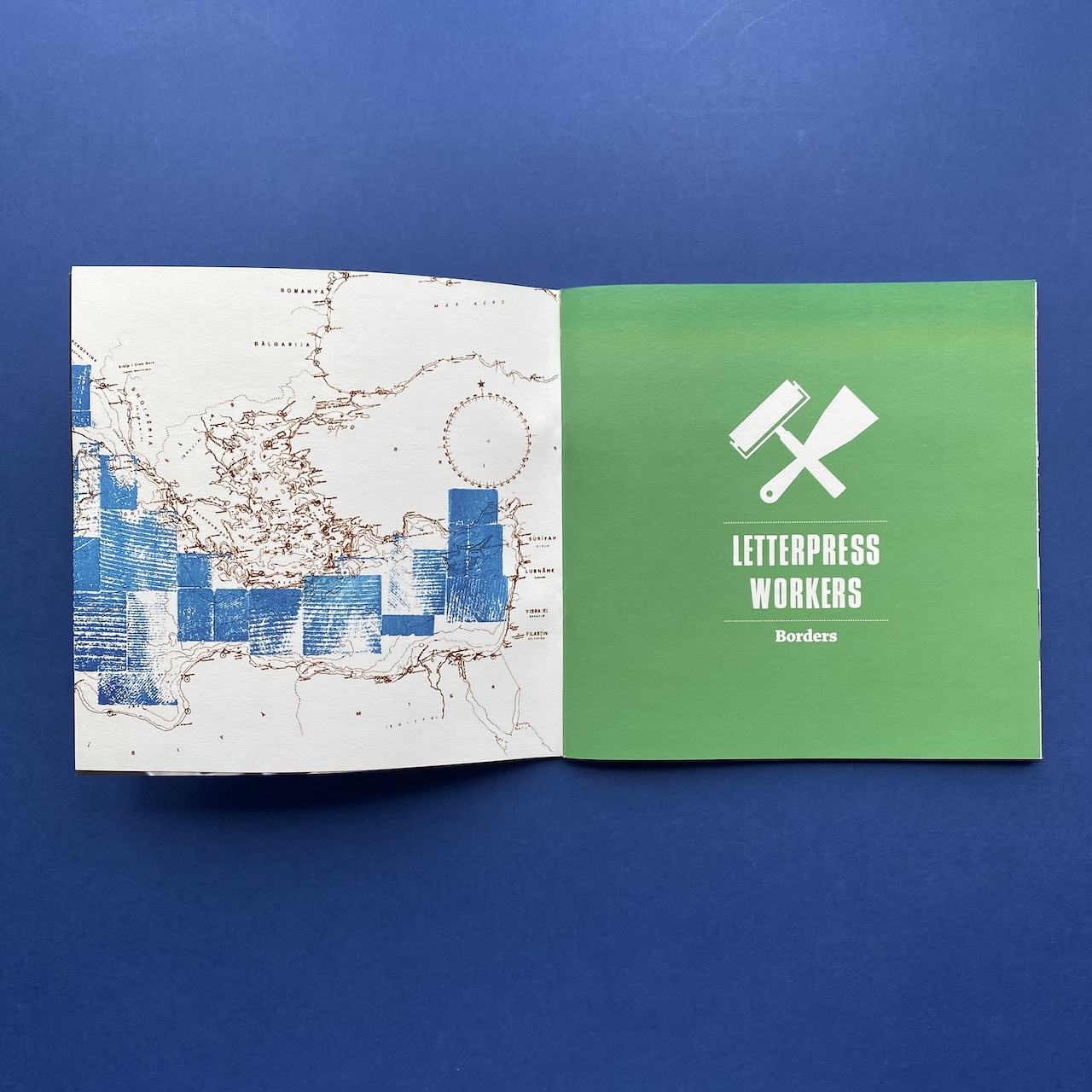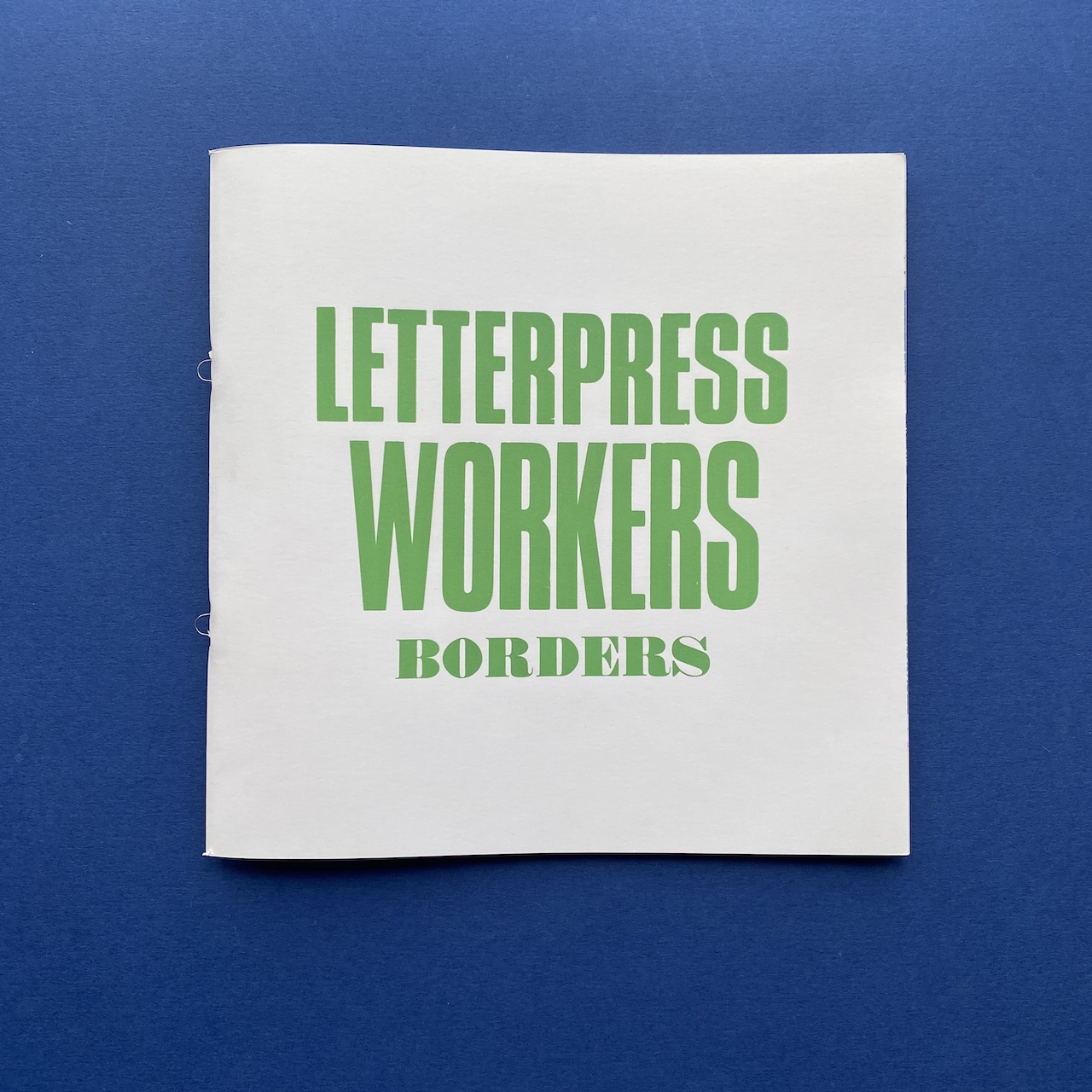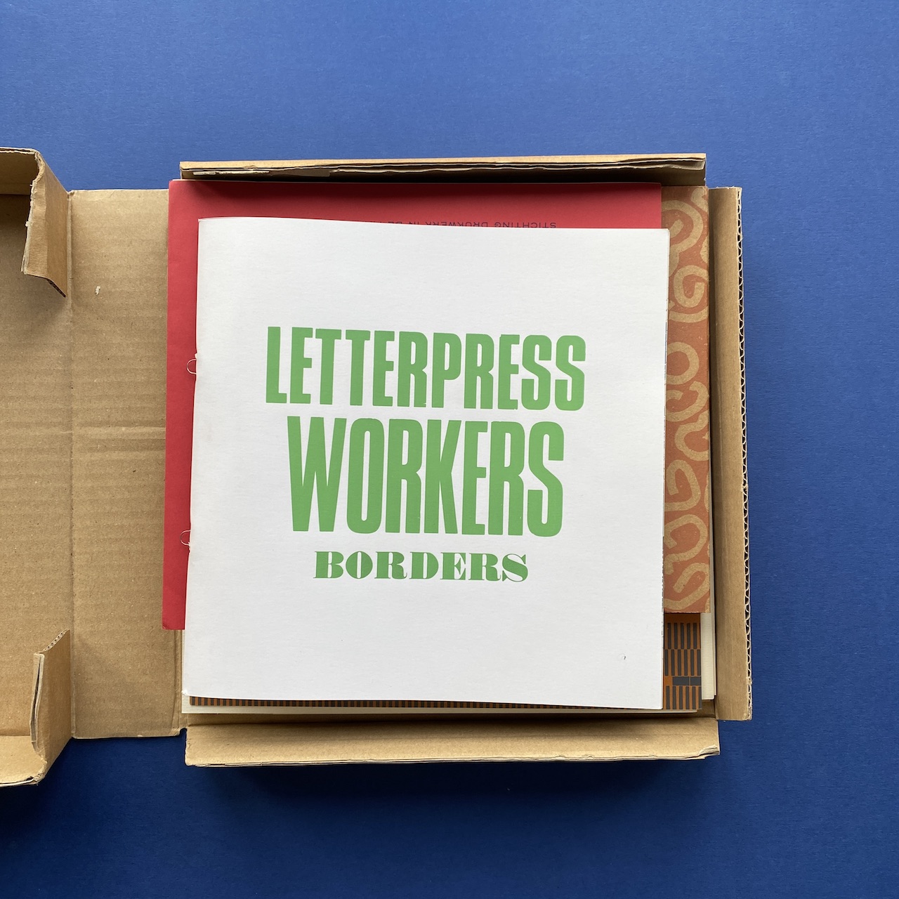 Letterpress workers, Borders, Milano, Officina Tipografica Nove Punti, 2015. 27,7 x 27,5 x 5 cm, 120 copies, silkscreened cardboard box containing 20 prints, 2 letterpressed books and a booklet made by the participants of the 2015 Letterpress workers summit.