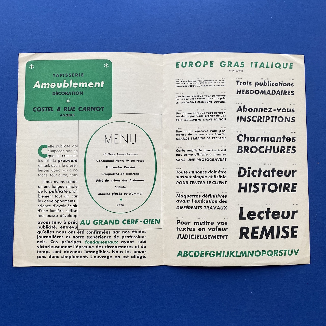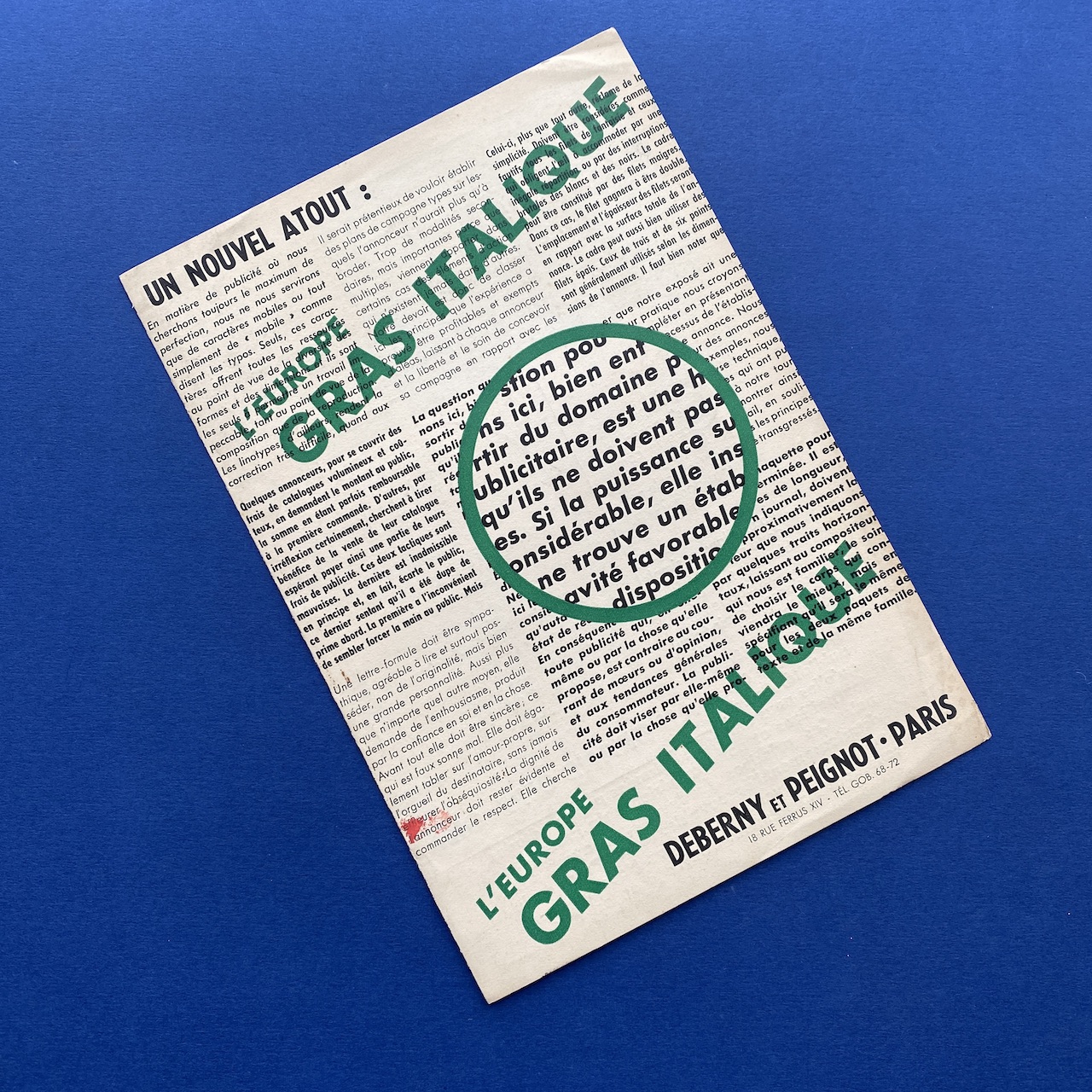 L’Europe, Gras italique, 1930s, Deberny et Peignot, Paris, 18,5 x 27 cm. 4-page leaflet in very good condition.