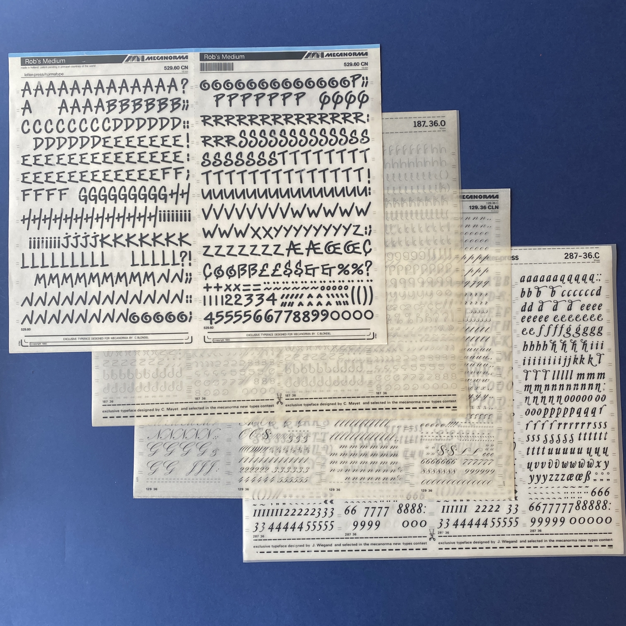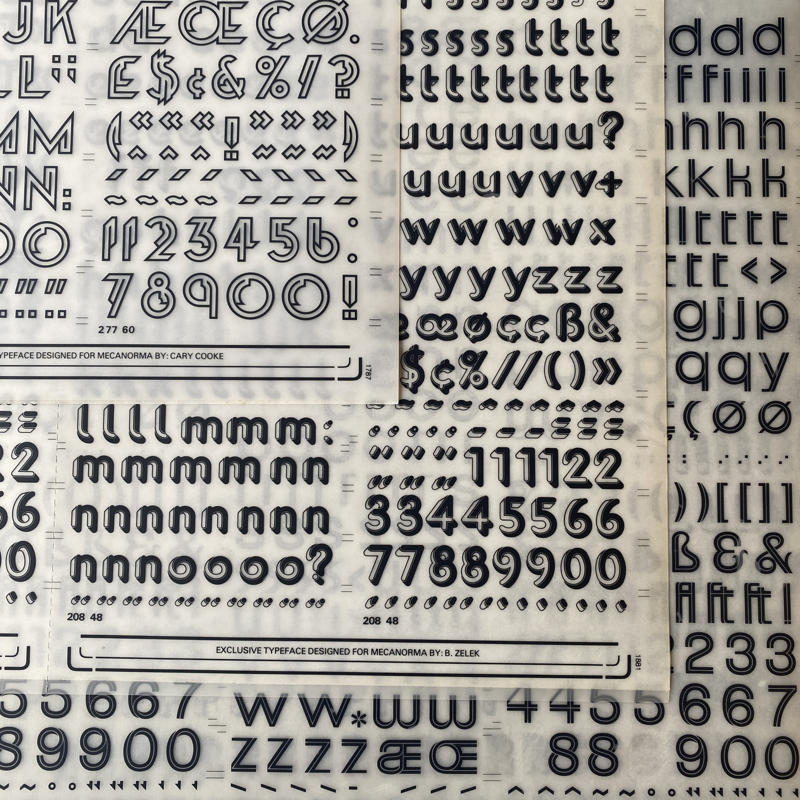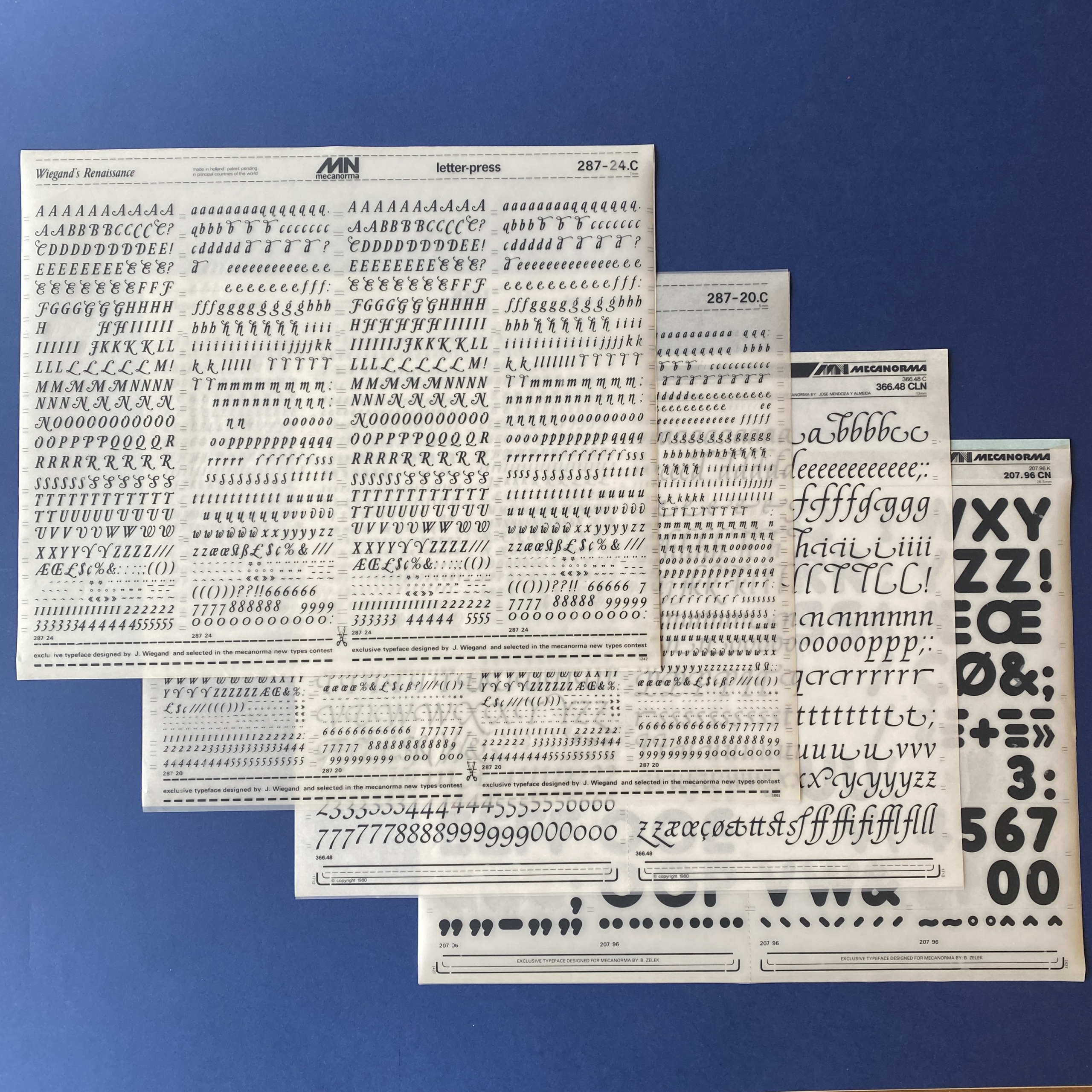 Mecanorma box of 16 sheets: Magnetic, Blippo, Garbo, Zelek Shadline, Fedelio, Art Script, Robb’s, Film, Jim Crow, Wiegand’s Renaissance.